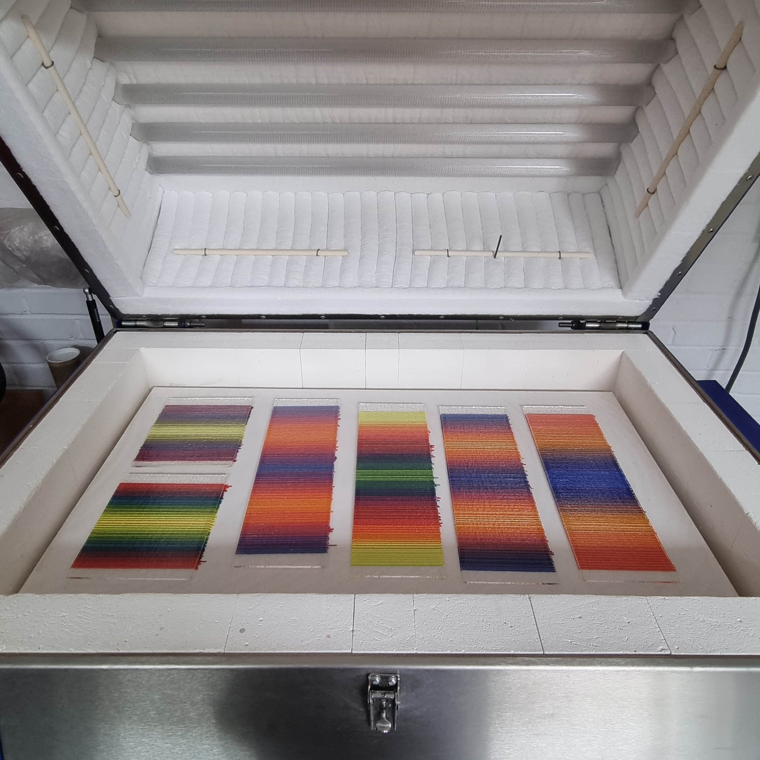 For the last few years, I’ve focused on developing my own method of design, using thin coloured strands of glass, laid side by side in carefully balanced colour sequences. Each piece is built from a limited palette, giving me control over the transitions and highlight within the finished creation.