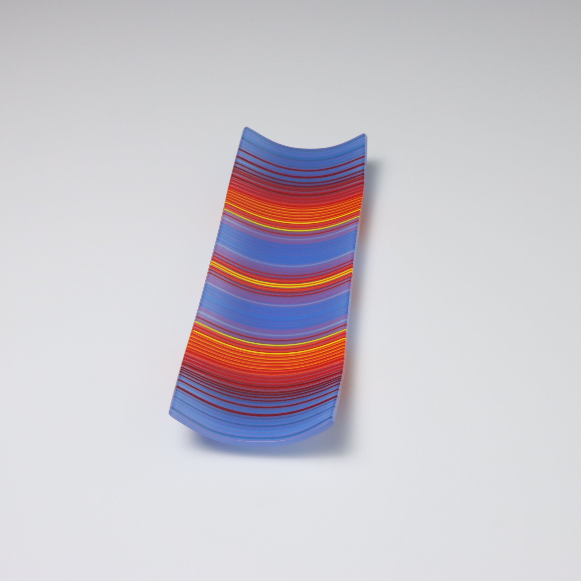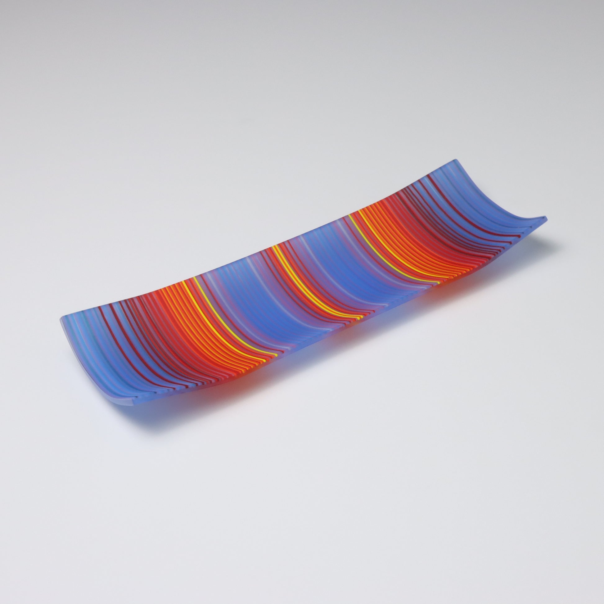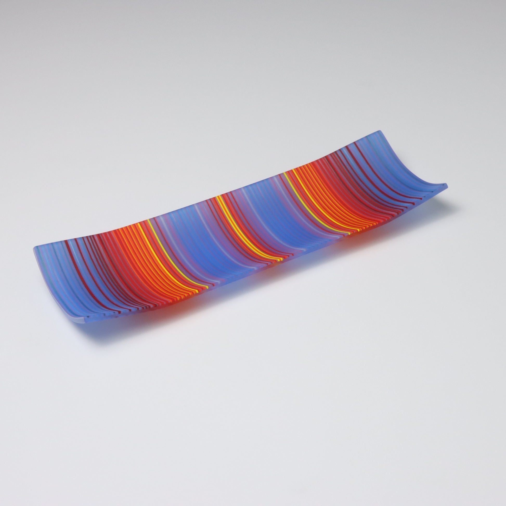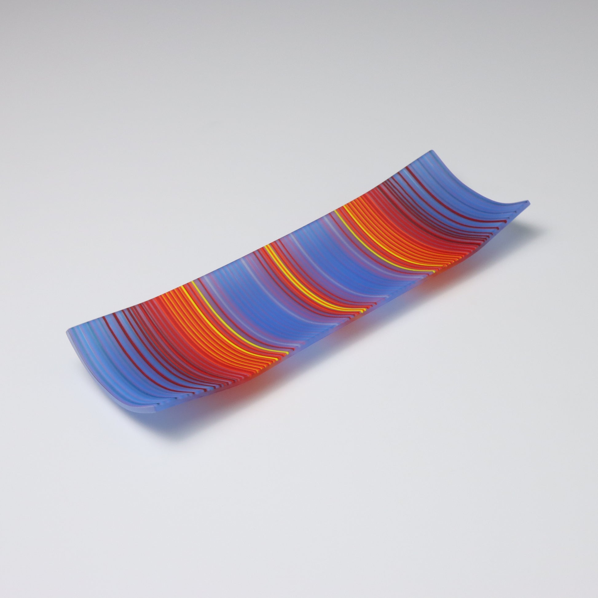 Capturing the dreamy, tranquil transition of a summer sky just before sunset, this ColourWave Glass fused glass plate reflects that fleeting moment when light fades and colours deepen. Deep blues and purples dissolve into vivid orange, with a touch of yellow at the centre adding tension and contrast. Its rectangular shape and softly curved-up edges lend a refined presence, while the bold palette invites quiet reflection. Whether displayed solo or as part of a curated arrangement, it brings strong colour and a distinctive edge to your space.