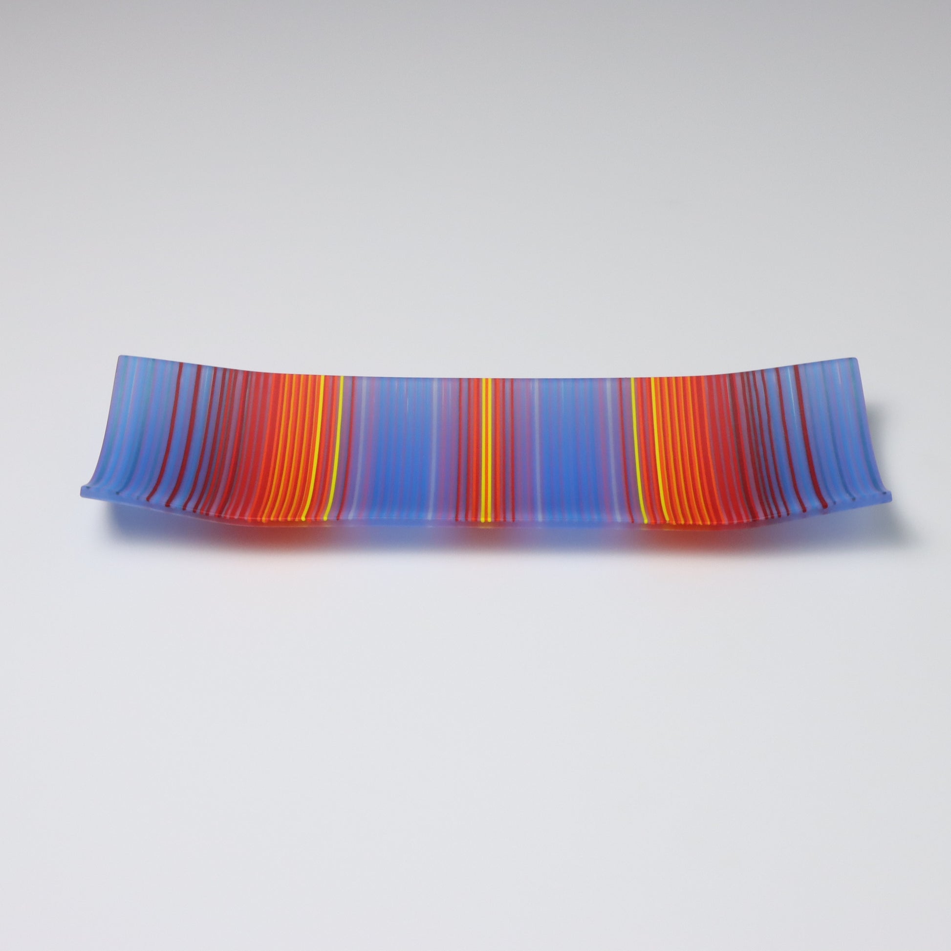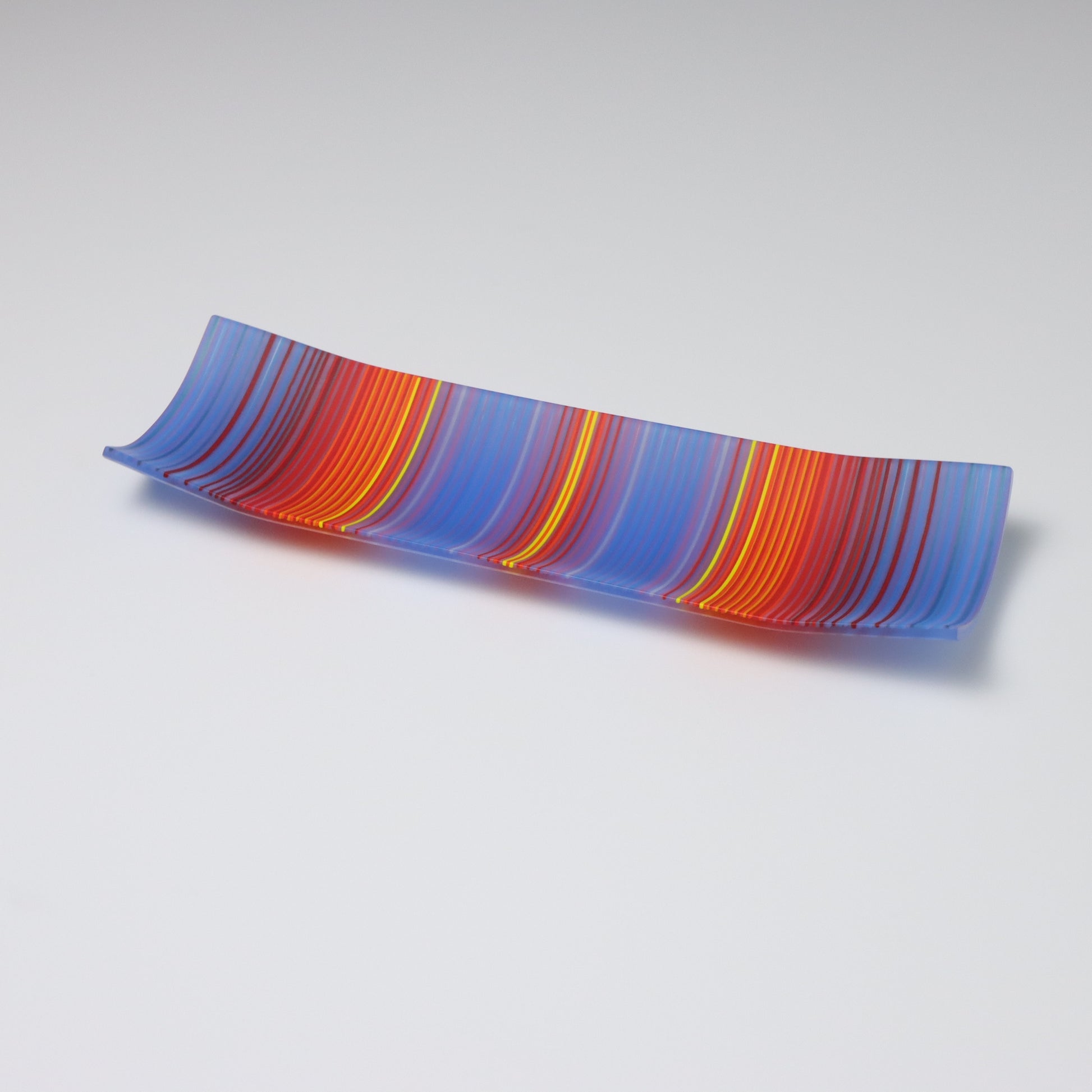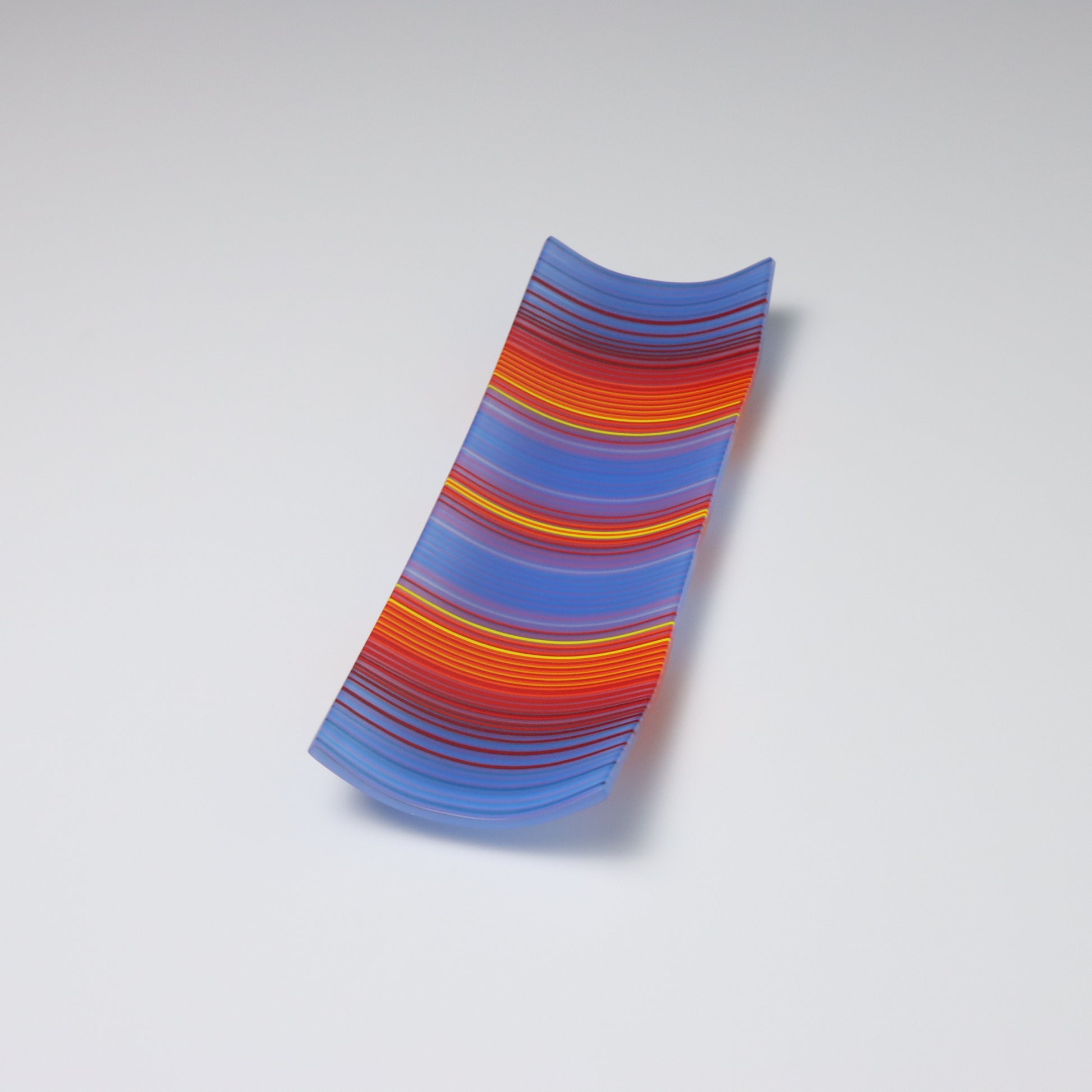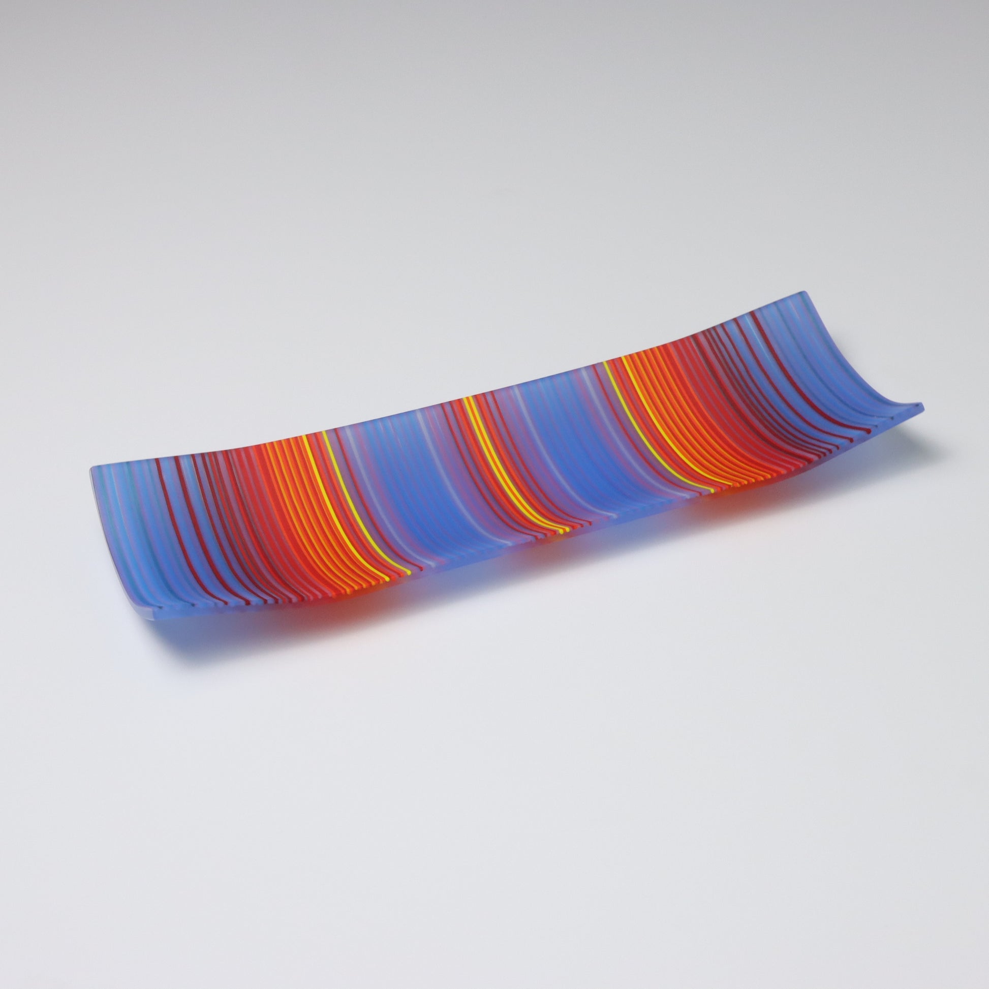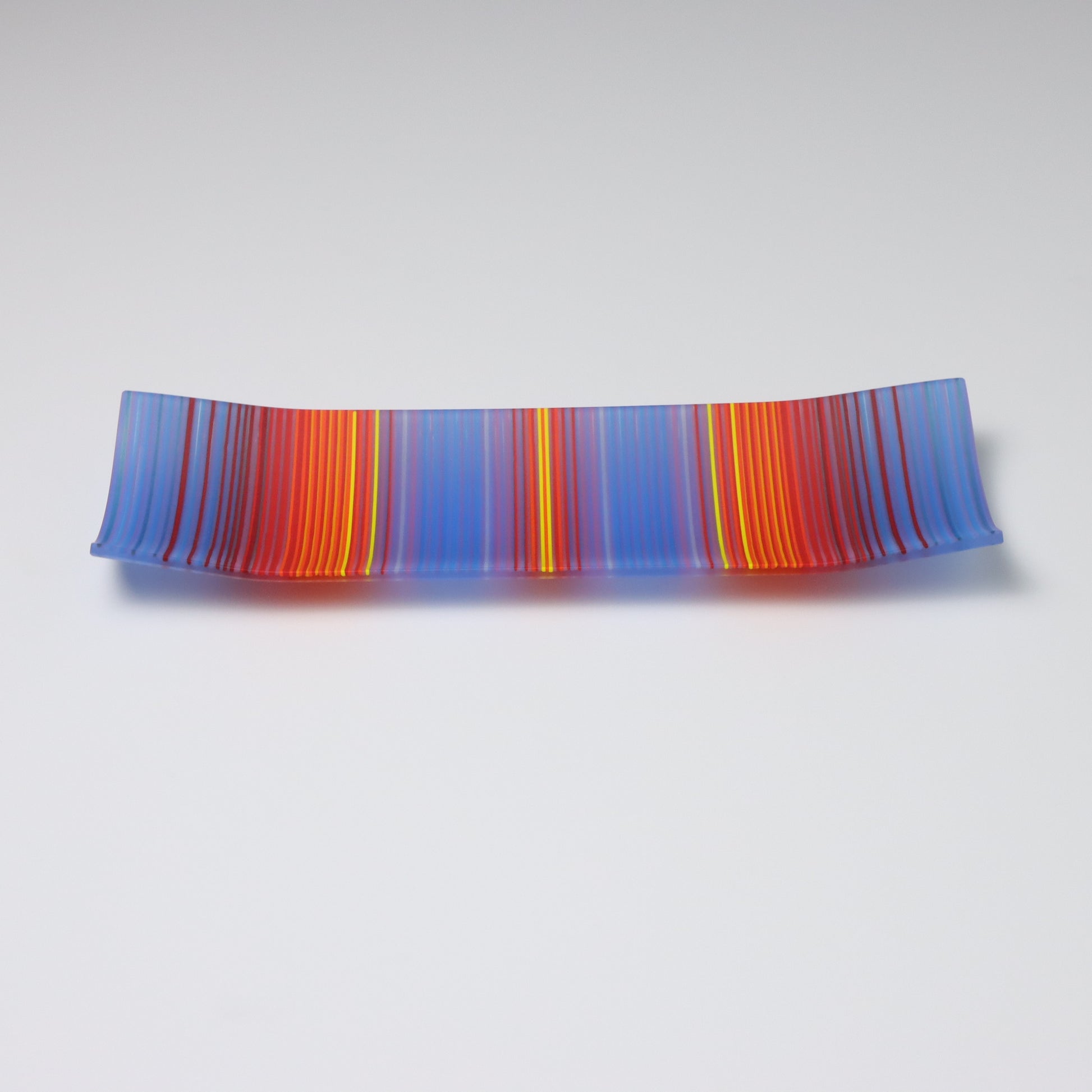Capturing the dreamy, tranquil transition of a summer sky just before sunset, this ColourWave Glass fused glass plate reflects that fleeting moment when light fades and colours deepen. Deep blues and purples dissolve into vivid orange, with a touch of yellow at the centre adding tension and contrast. Its rectangular shape and softly curved-up edges lend a refined presence, while the bold palette invites quiet reflection. Whether displayed solo or as part of a curated arrangement, it brings strong colour and a distinctive edge to your space.