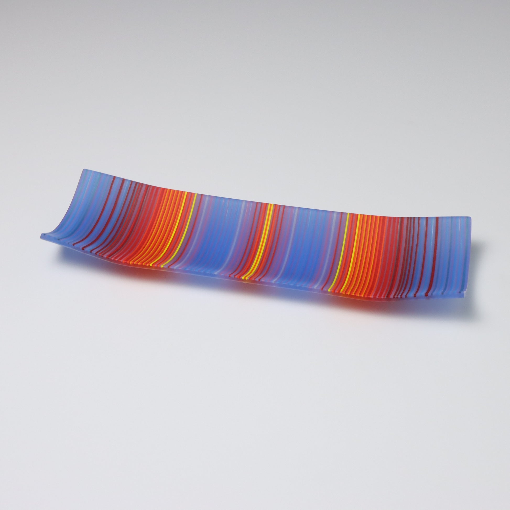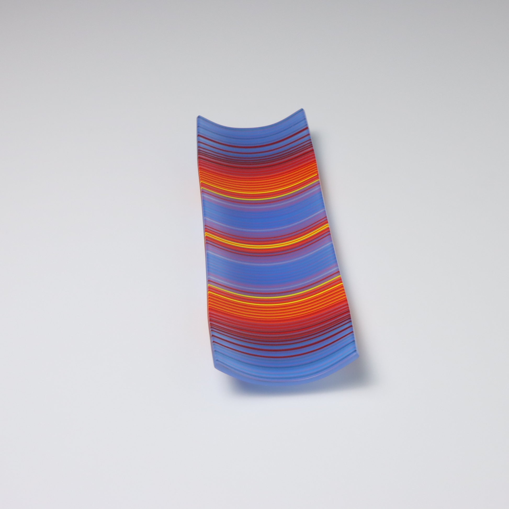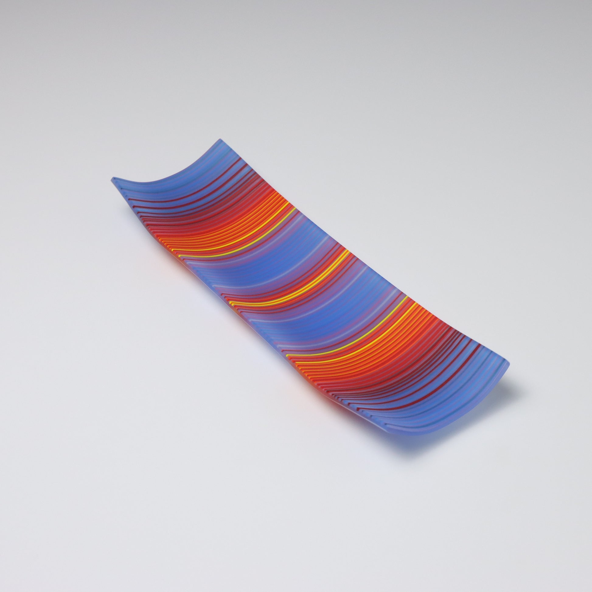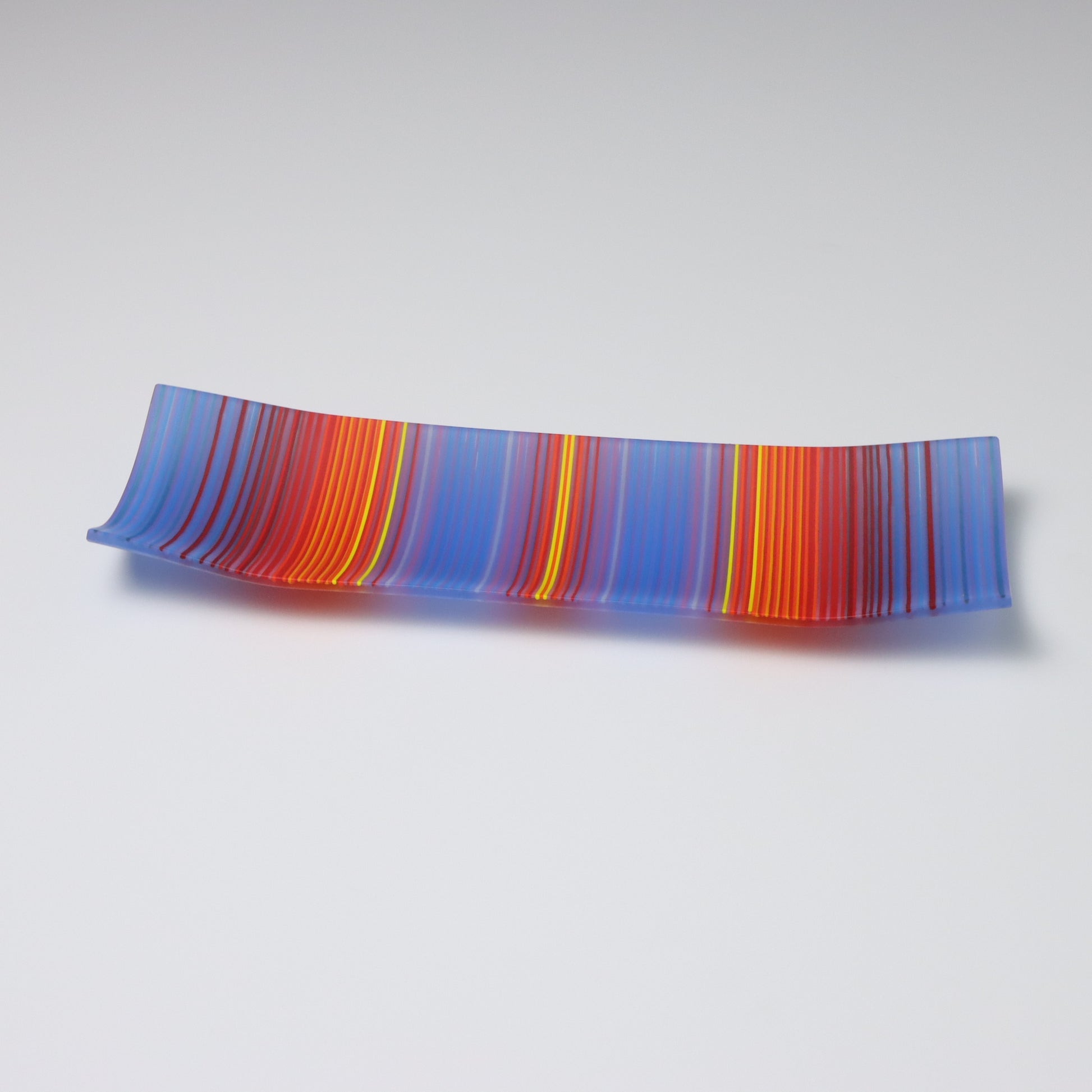 Capturing the dreamy, tranquil transition of a summer sky just before sunset, this ColourWave Glass fused glass plate reflects that fleeting moment when light fades and colours deepen. Deep blues and purples dissolve into vivid orange, with a touch of yellow at the centre adding tension and contrast. Its rectangular shape and softly curved-up edges lend a refined presence, while the bold palette invites quiet reflection. Whether displayed solo or as part of a curated arrangement, it brings strong colour and a distinctive edge to your space.