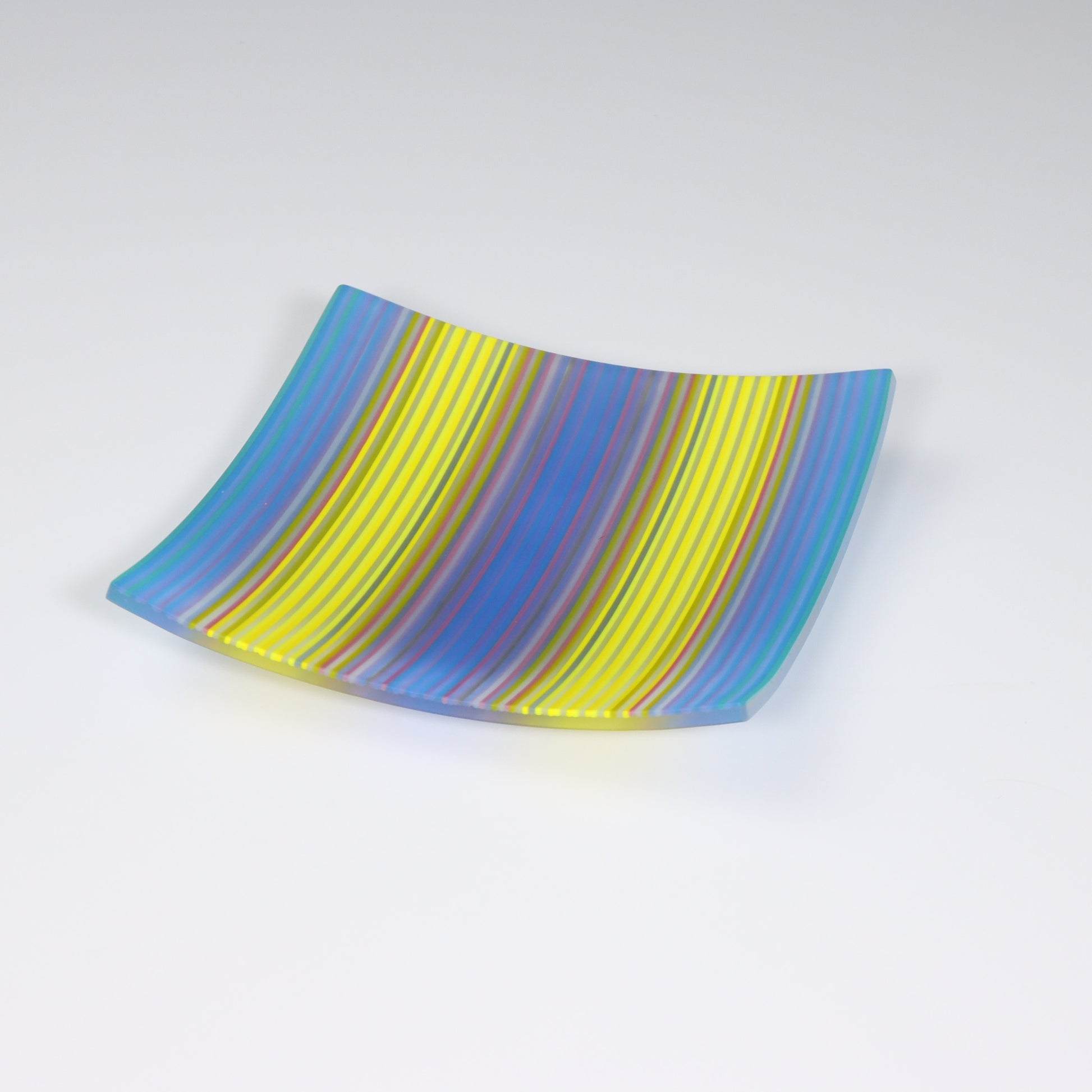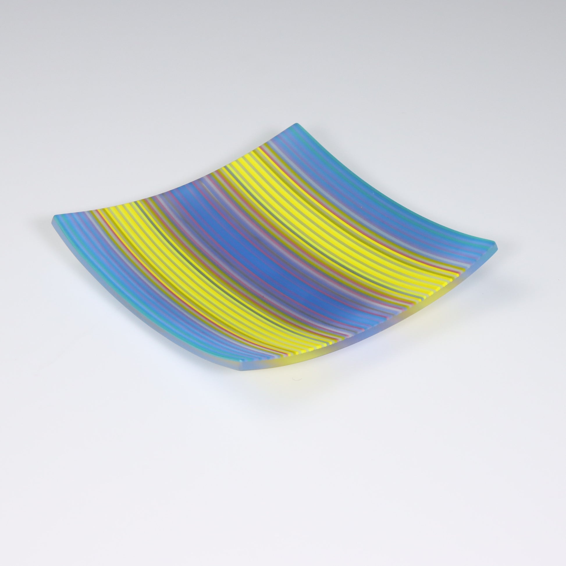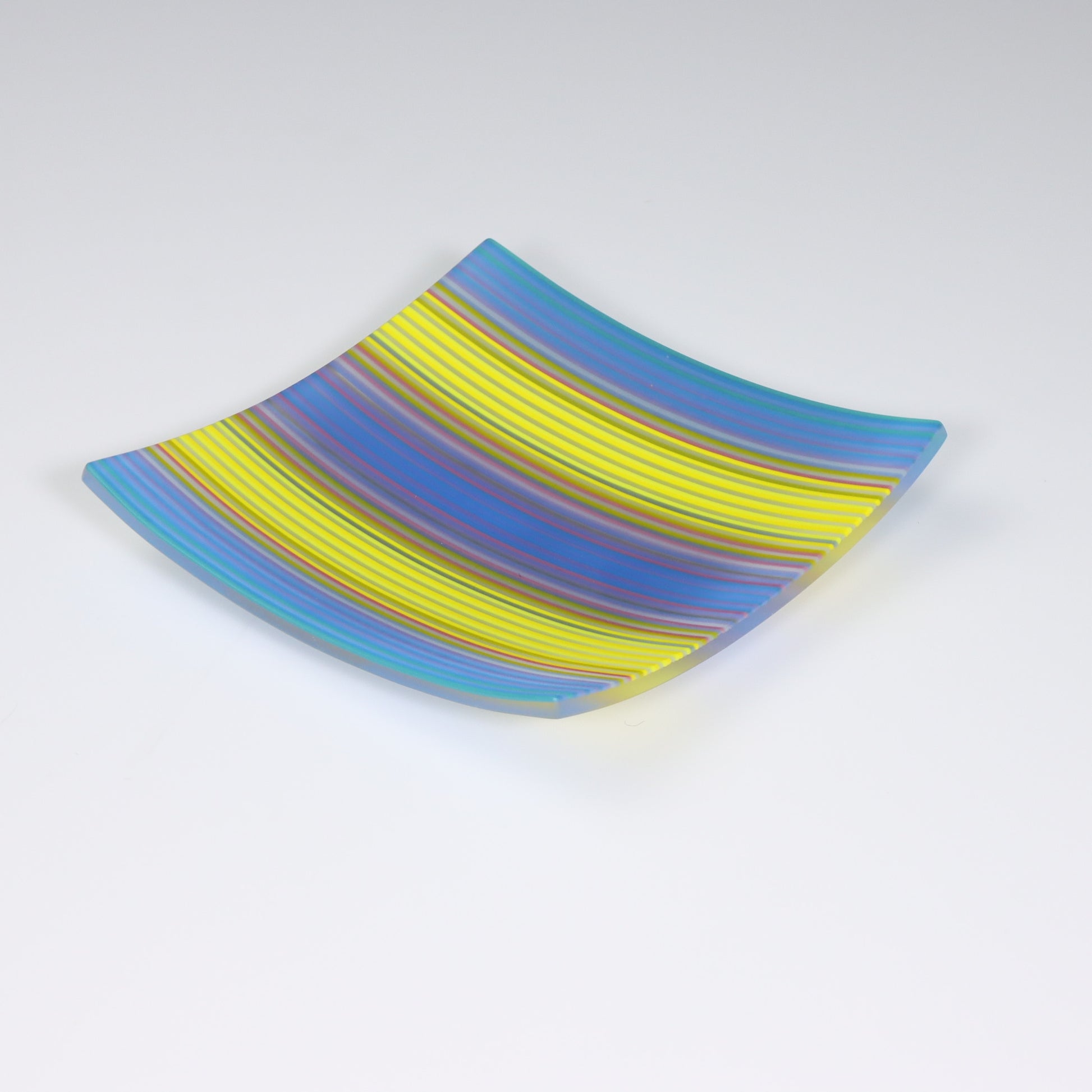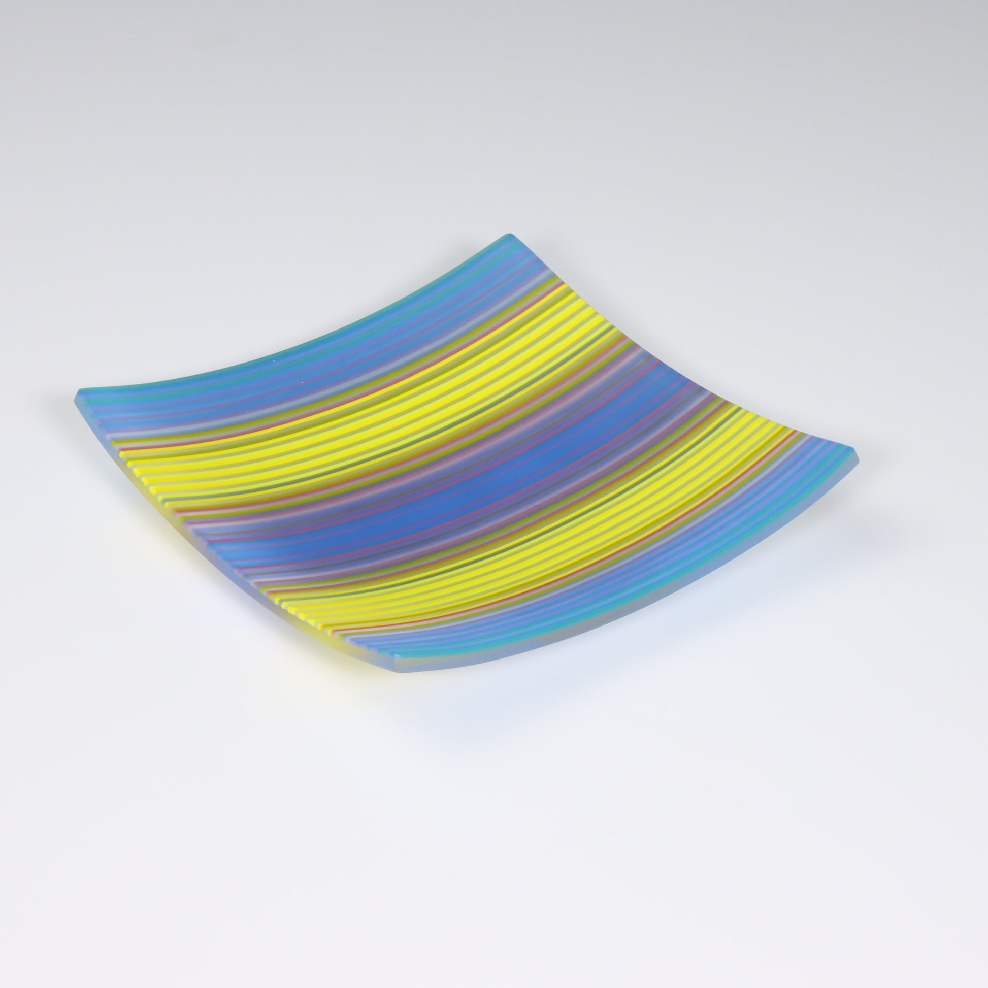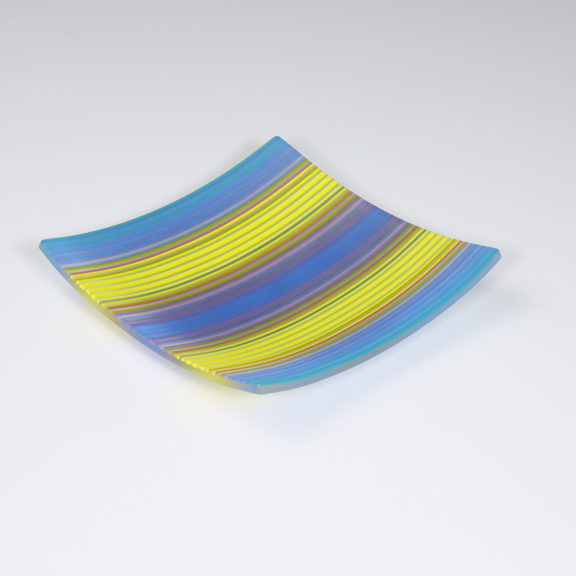 Make a bold statement with this striking ColourWave fused glass plate. Vibrant yellow waves contrast beautifully against a rich blue backdrop, while delicate hints of pink and purple add dimension and intrigue. Designed to capture attention, this plate brings a dynamic burst of energy and vibrancy to any room. Its sleek, curved-up edges and captivating composition make it the perfect piece to infuse your home with artistic flair and contemporary style.