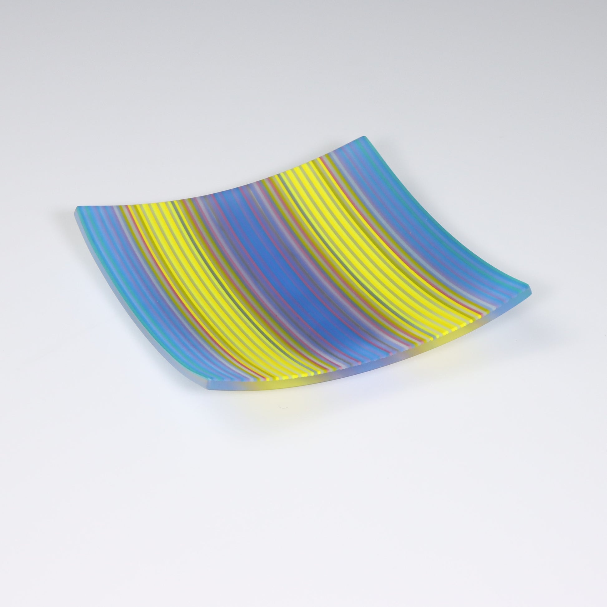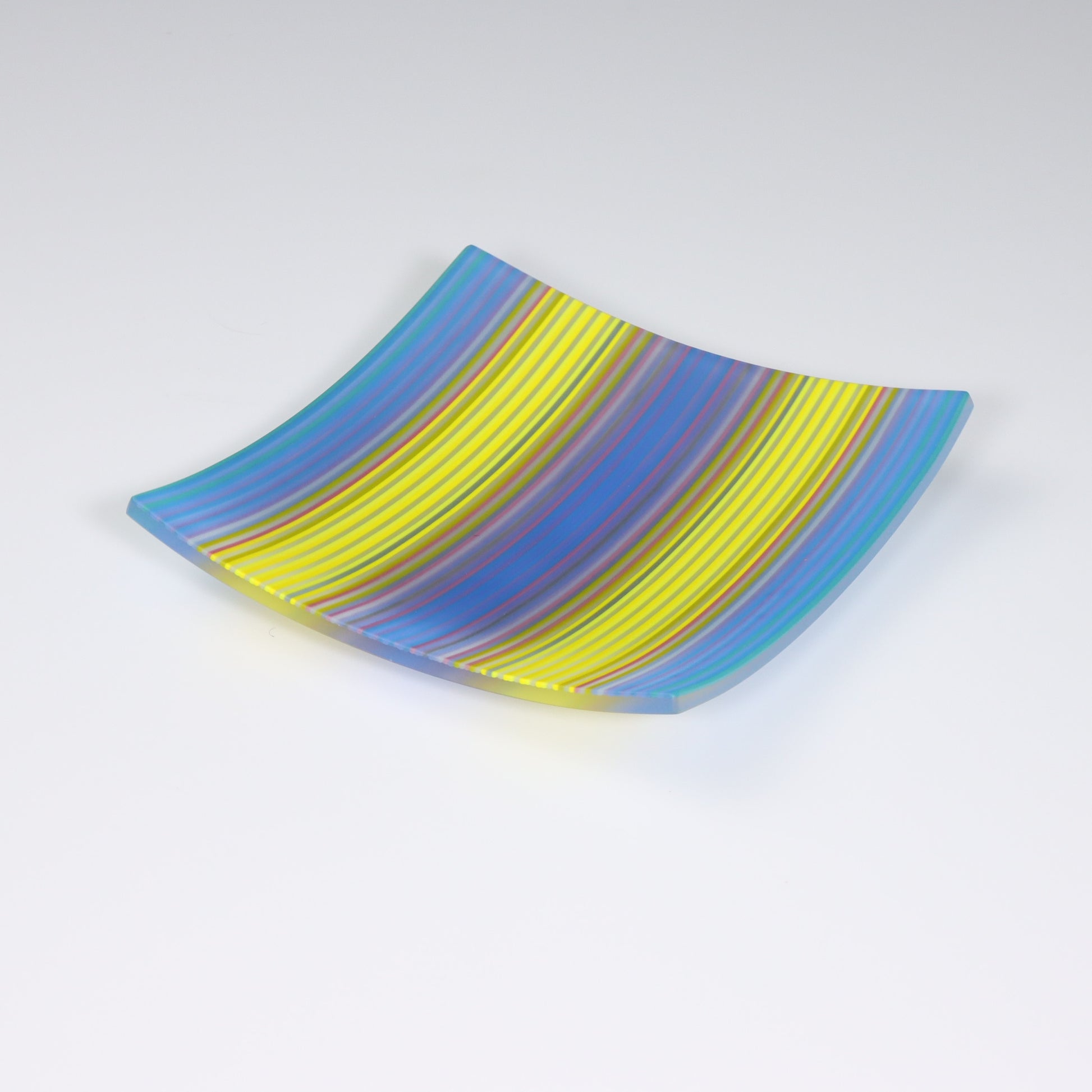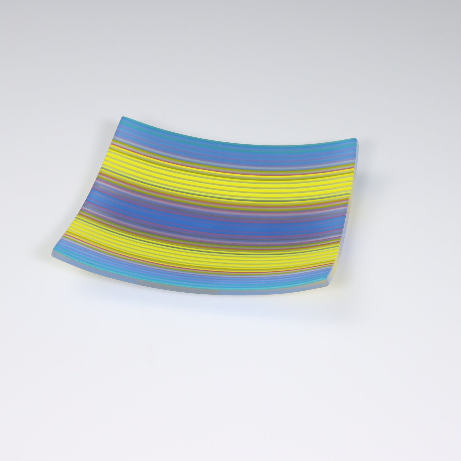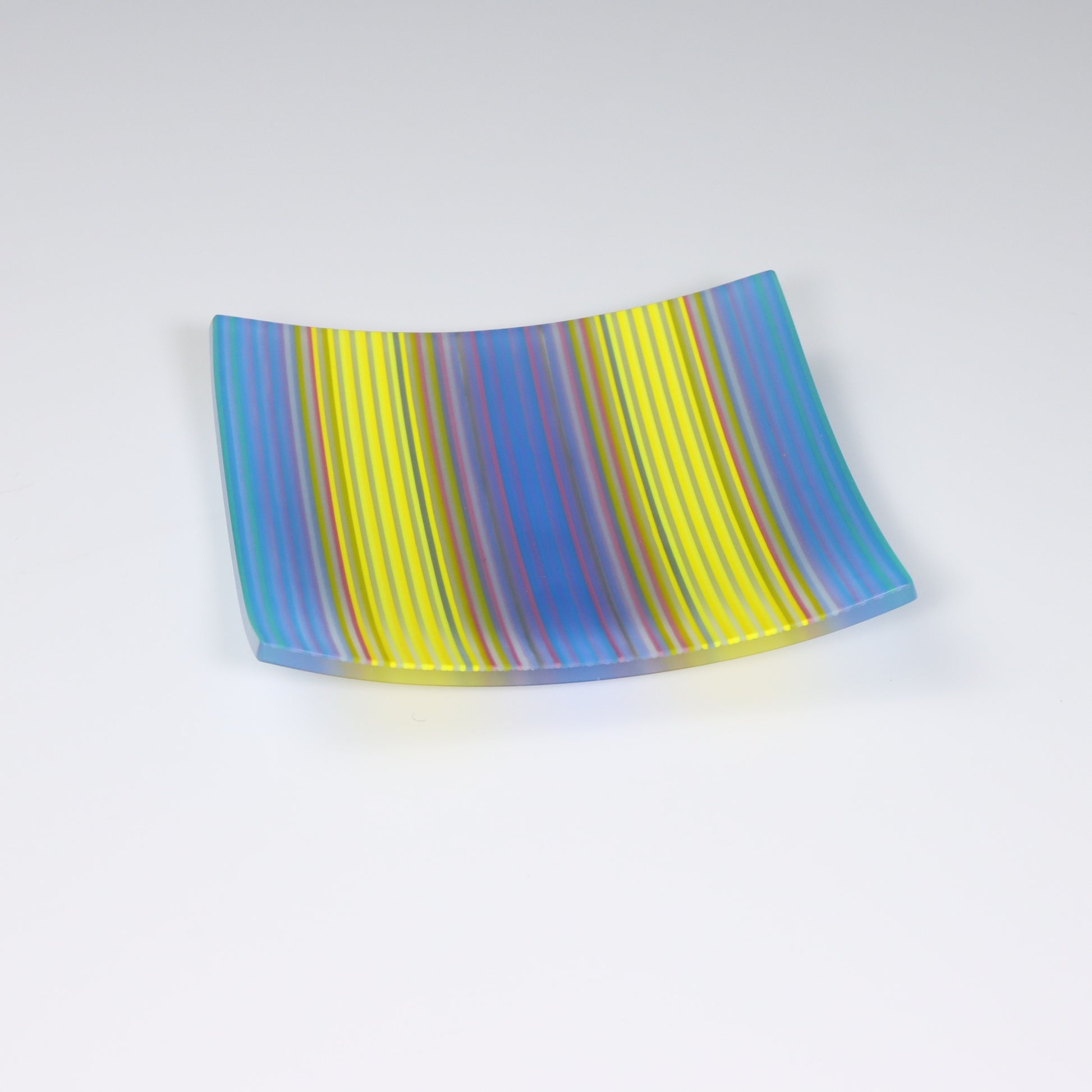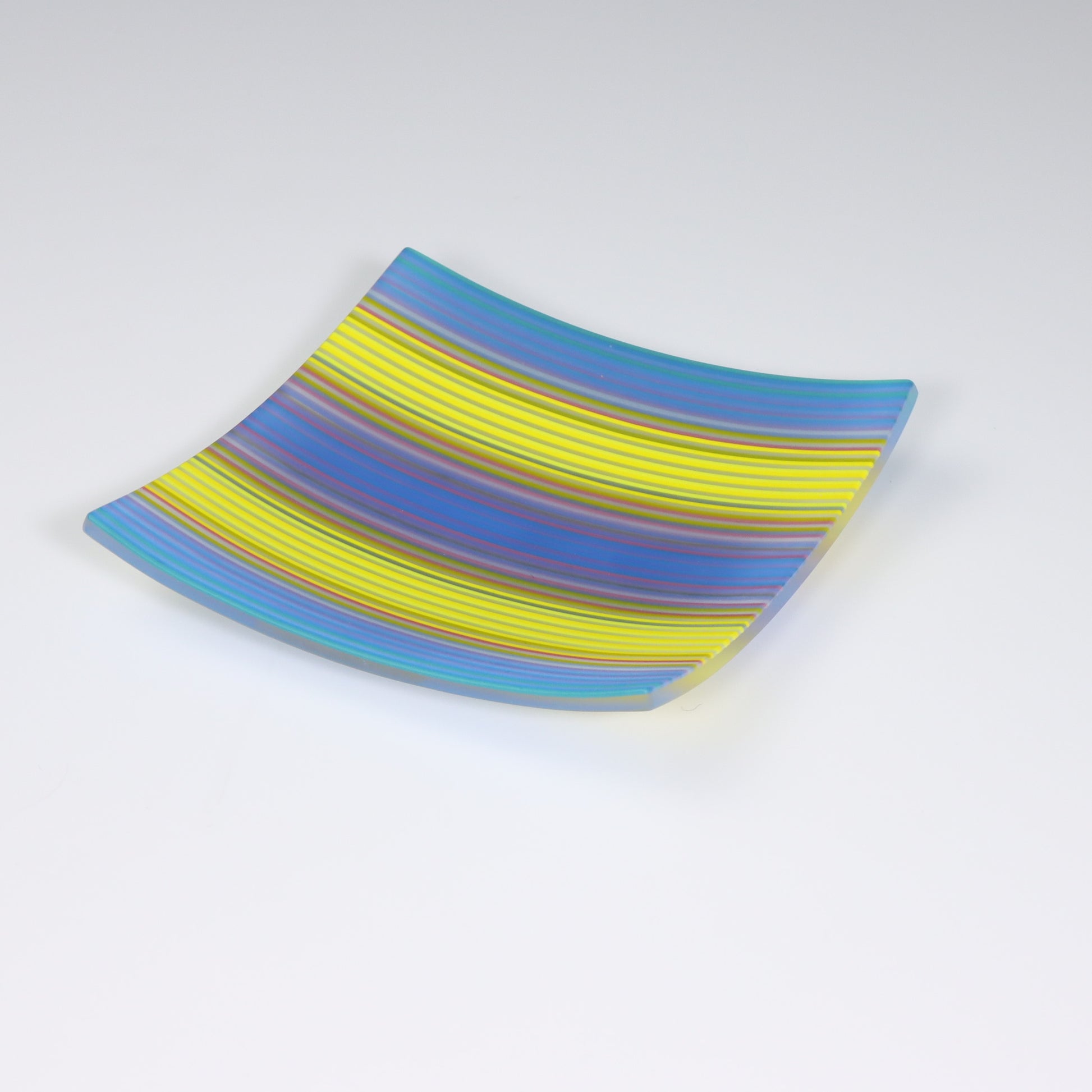 Make a bold statement with this striking ColourWave fused glass plate. Vibrant yellow waves contrast beautifully against a rich blue backdrop, while delicate hints of pink and purple add dimension and intrigue. Designed to capture attention, this plate brings a dynamic burst of energy and vibrancy to any room. Its sleek, curved-up edges and captivating composition make it the perfect piece to infuse your home with artistic flair and contemporary style.