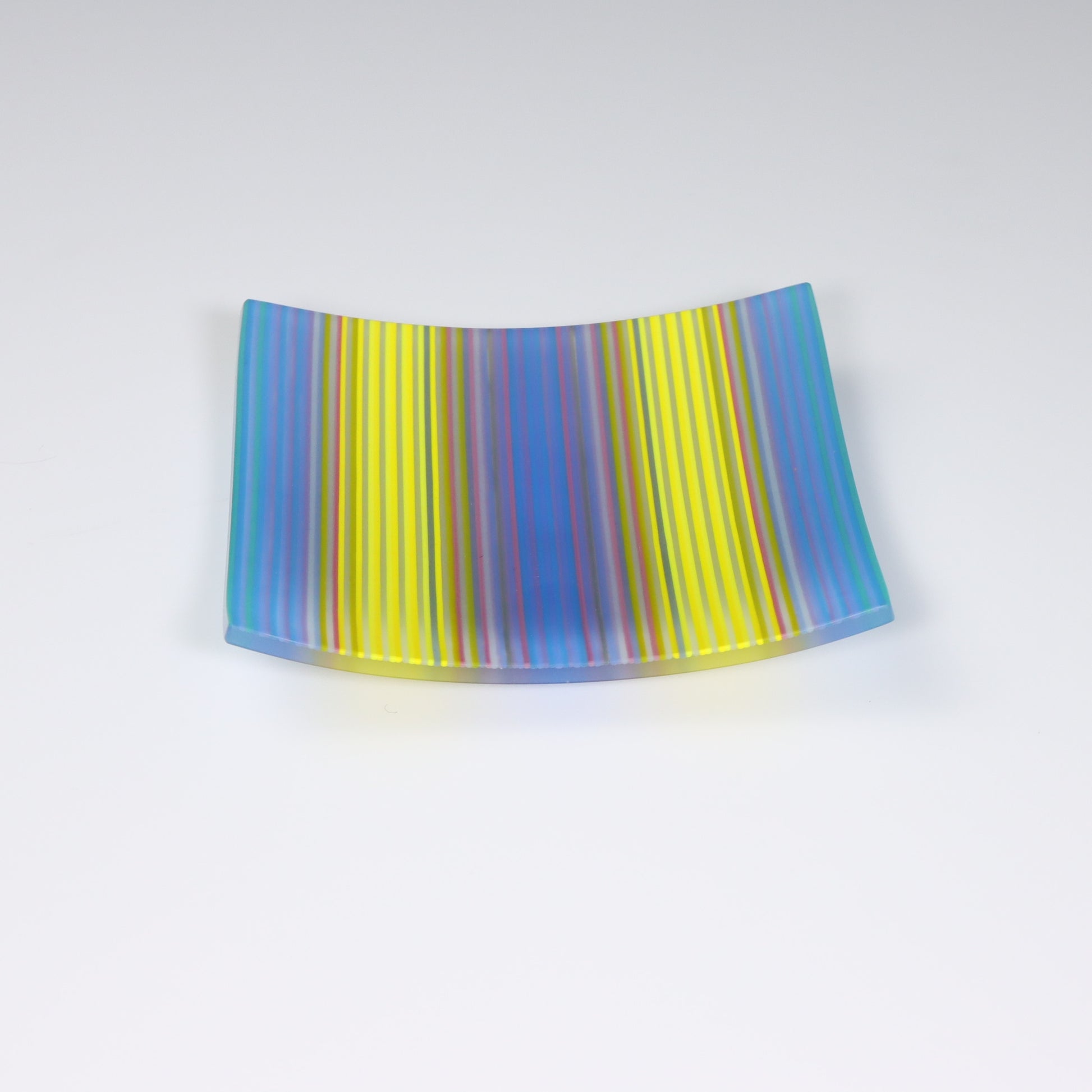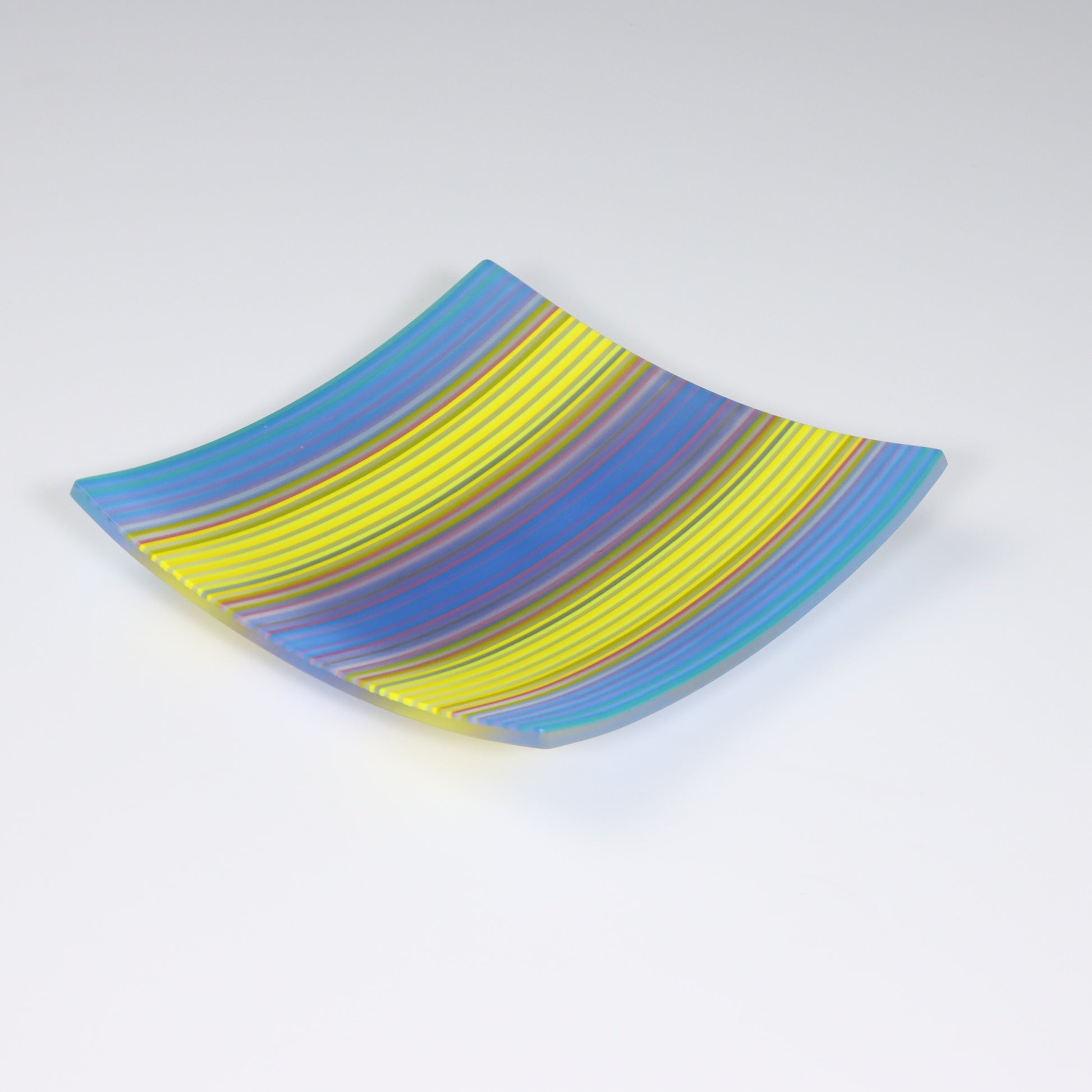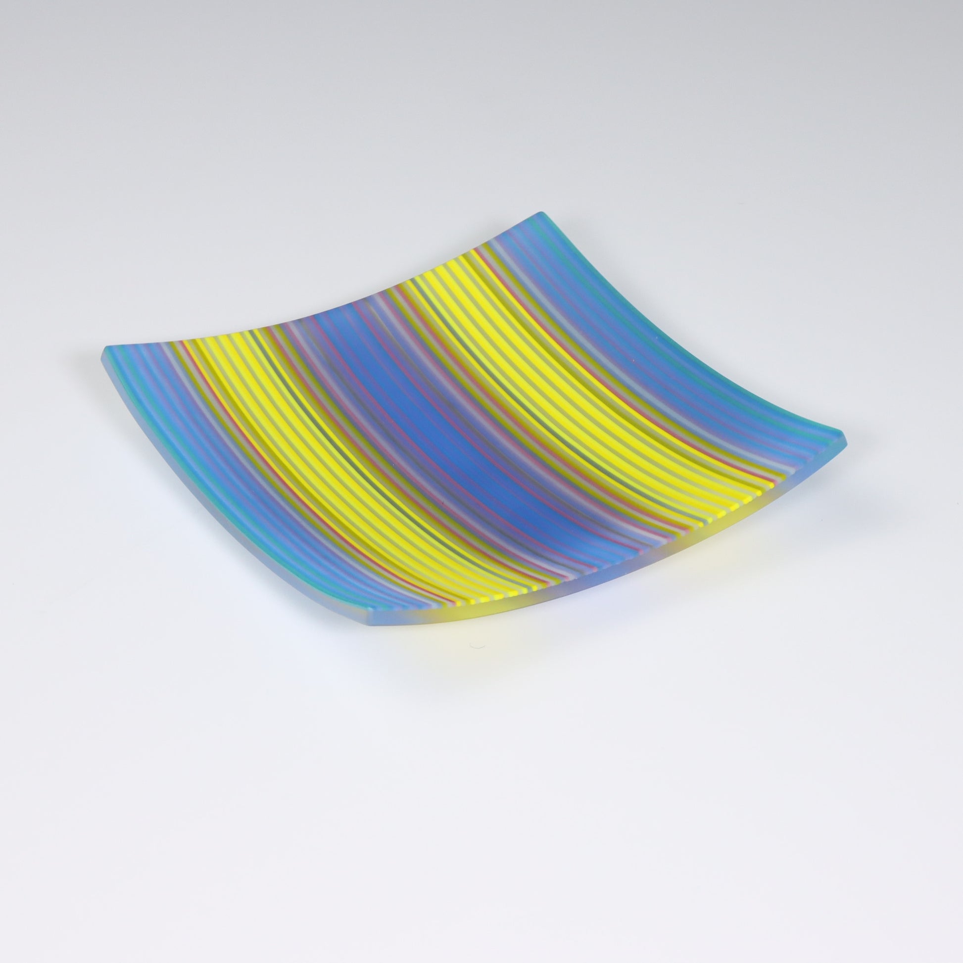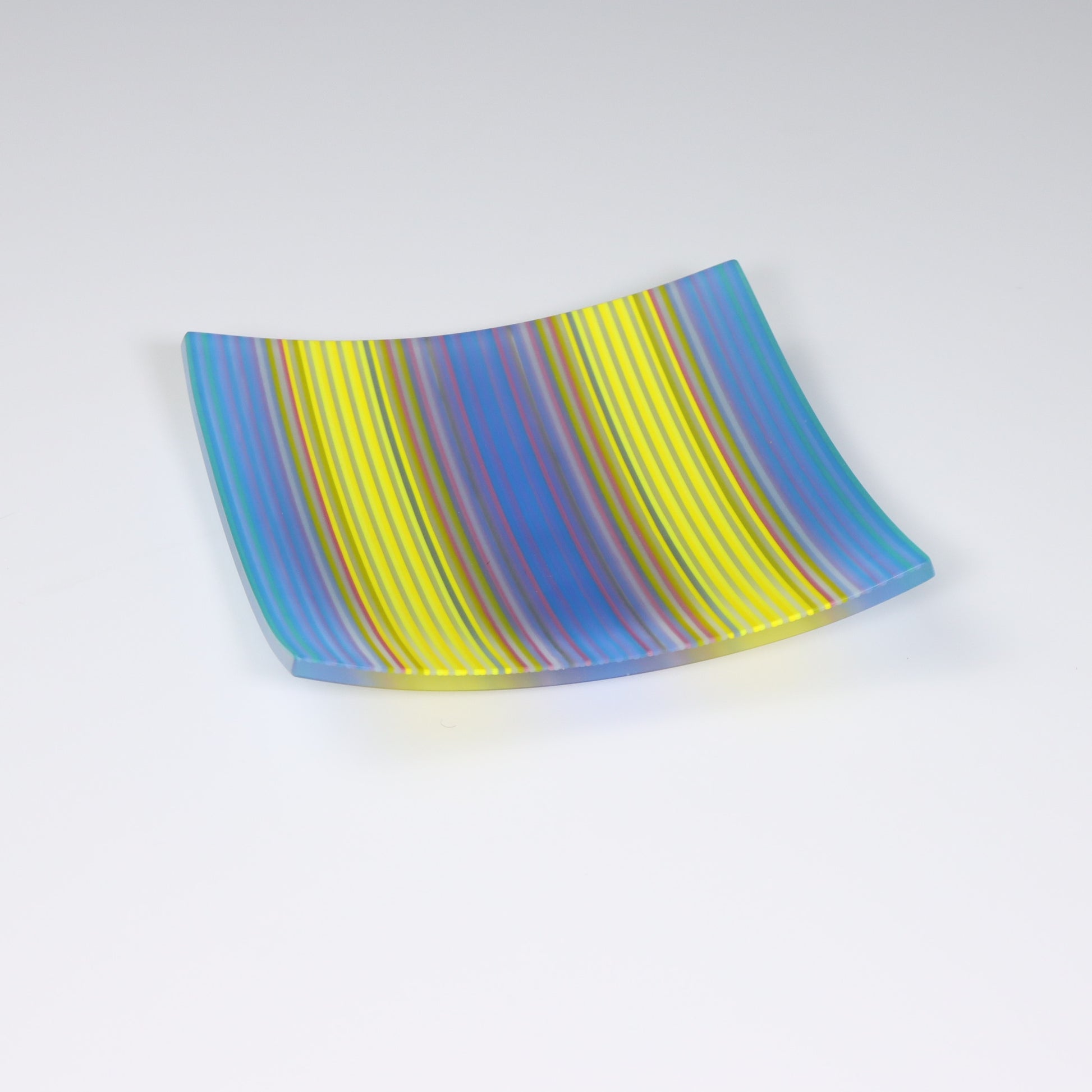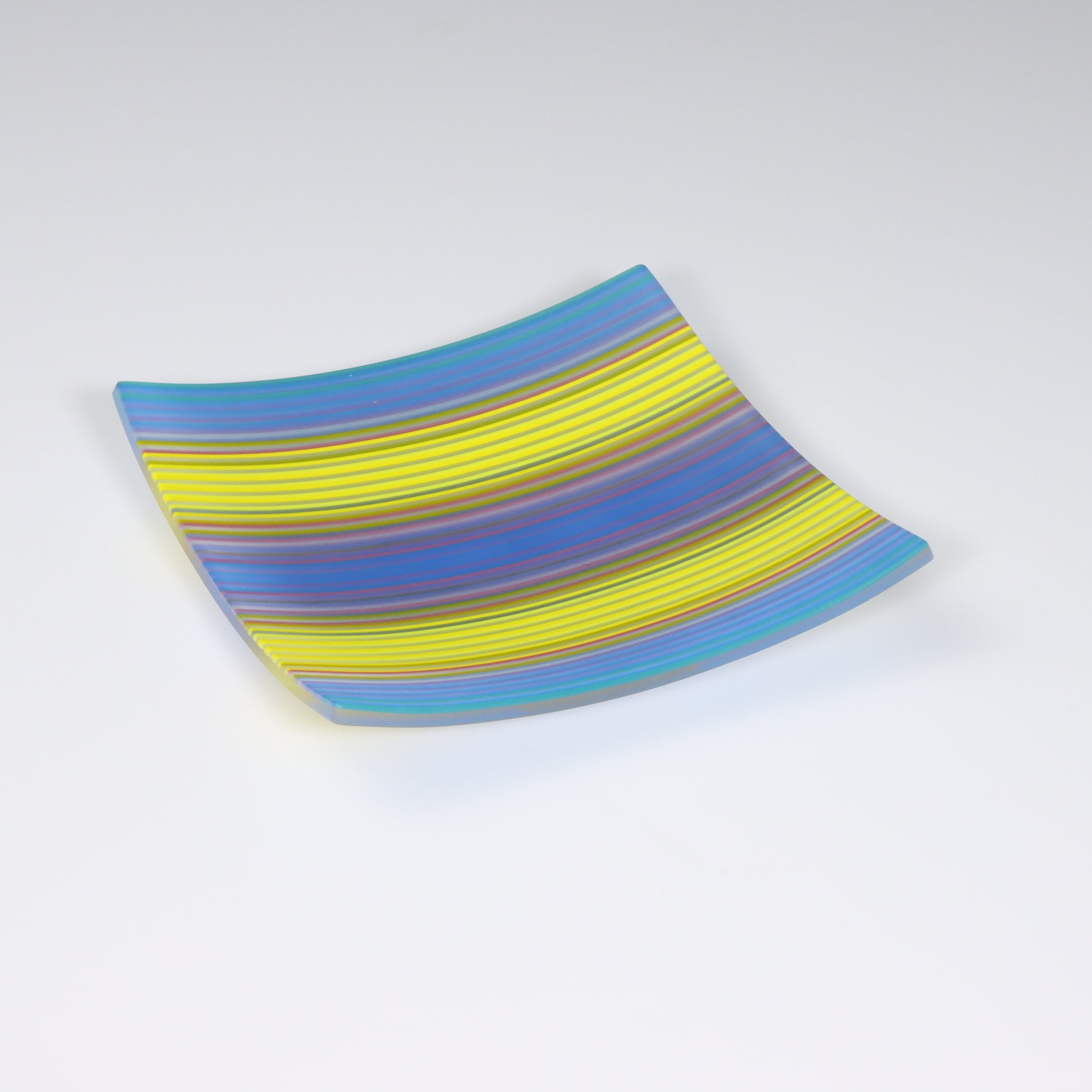 Make a bold statement with this striking ColourWave fused glass plate. Vibrant yellow waves contrast beautifully against a rich blue backdrop, while delicate hints of pink and purple add dimension and intrigue. Designed to capture attention, this plate brings a dynamic burst of energy and vibrancy to any room. Its sleek, curved-up edges and captivating composition make it the perfect piece to infuse your home with artistic flair and contemporary style.