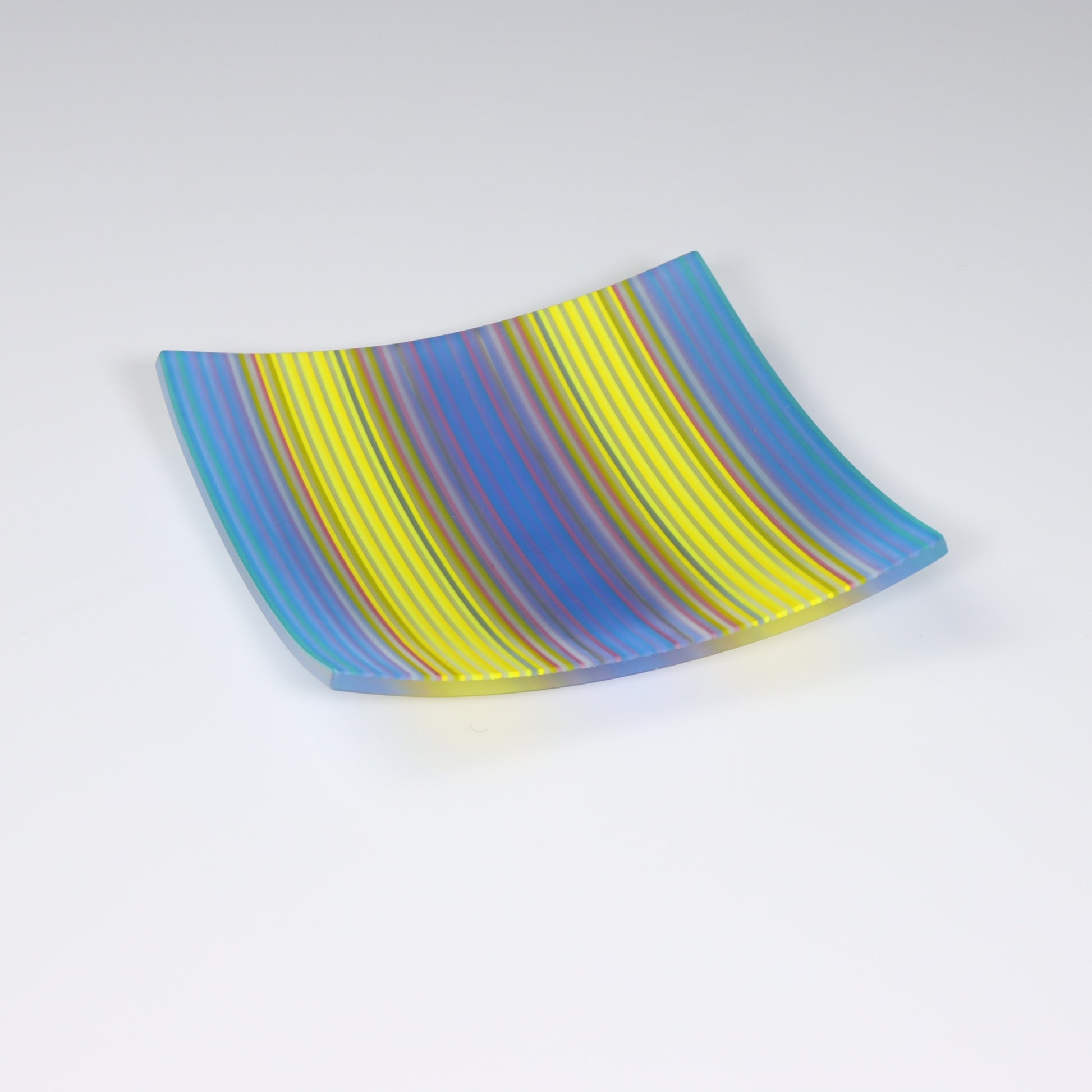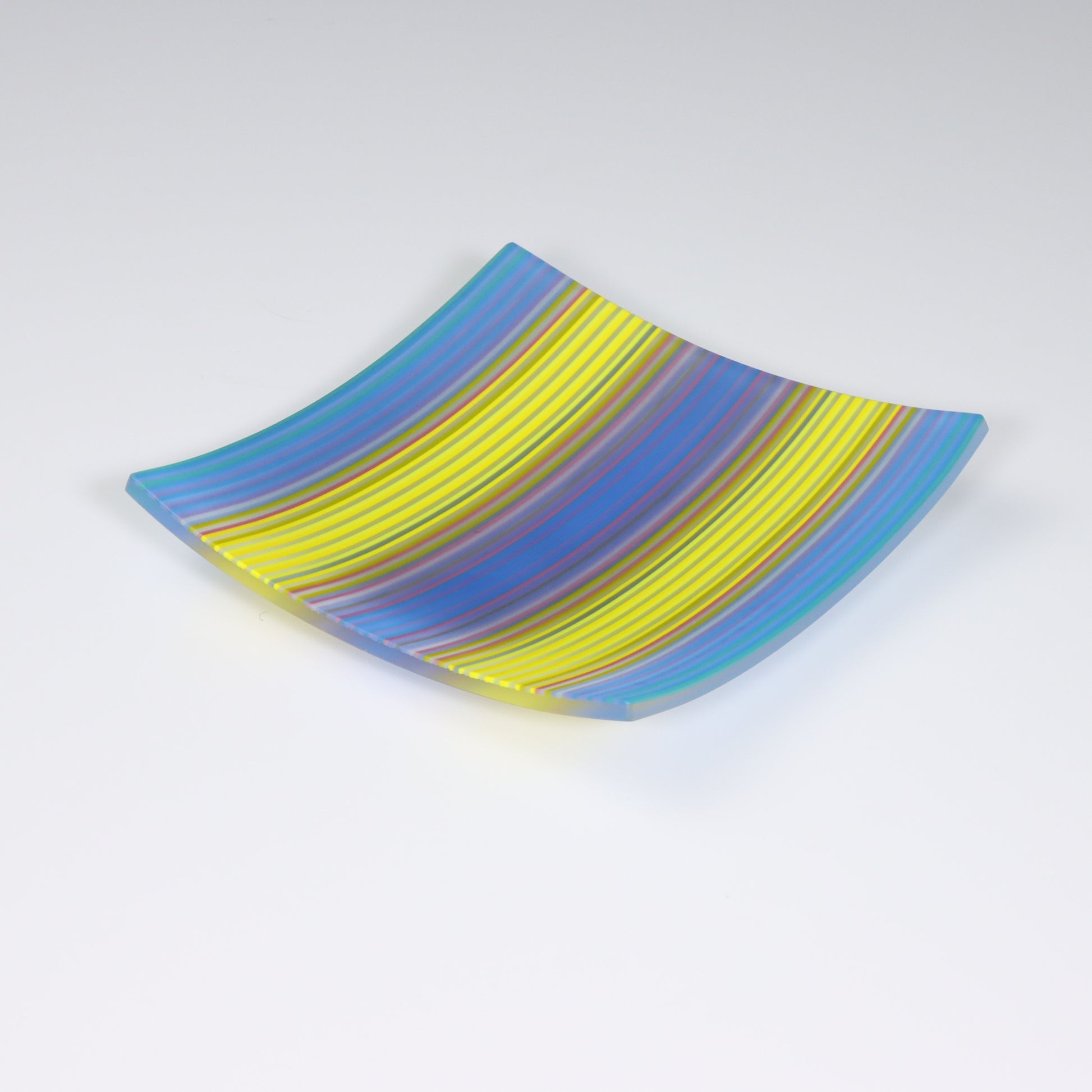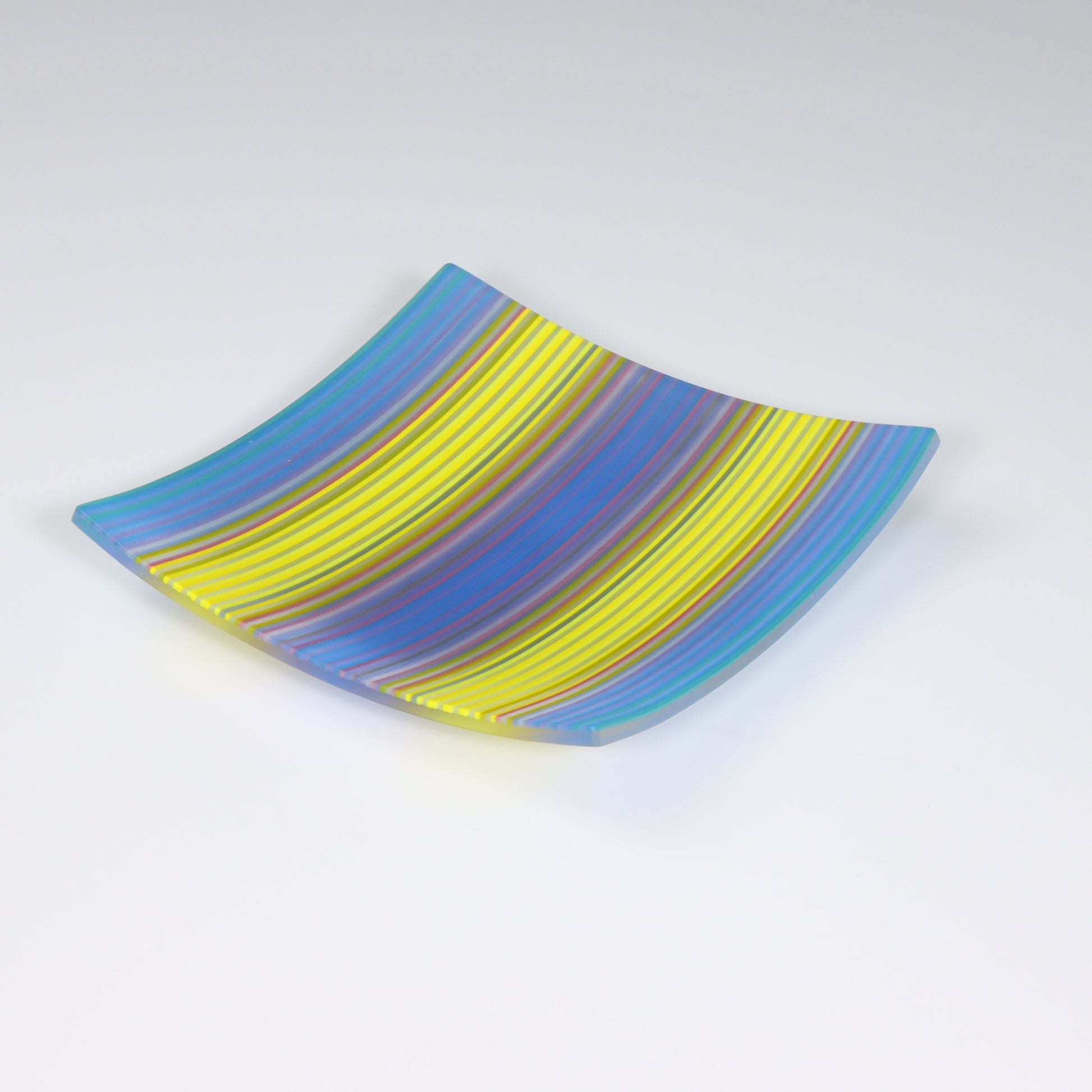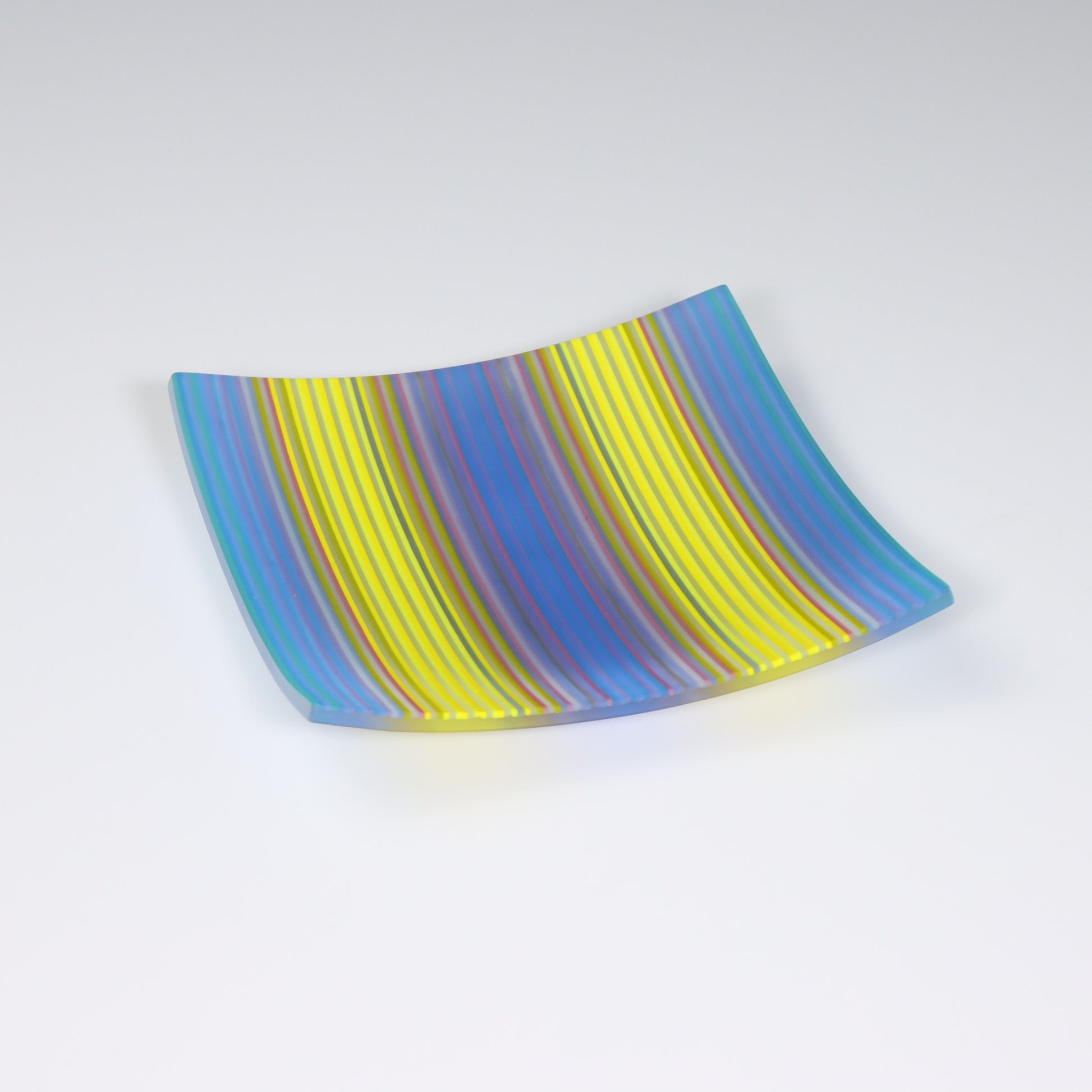 Make a bold statement with this striking ColourWave fused glass plate. Vibrant yellow waves contrast beautifully against a rich blue backdrop, while delicate hints of pink and purple add dimension and intrigue. Designed to capture attention, this plate brings a dynamic burst of energy and vibrancy to any room. Its sleek, curved-up edges and captivating composition make it the perfect piece to infuse your home with artistic flair and contemporary style.