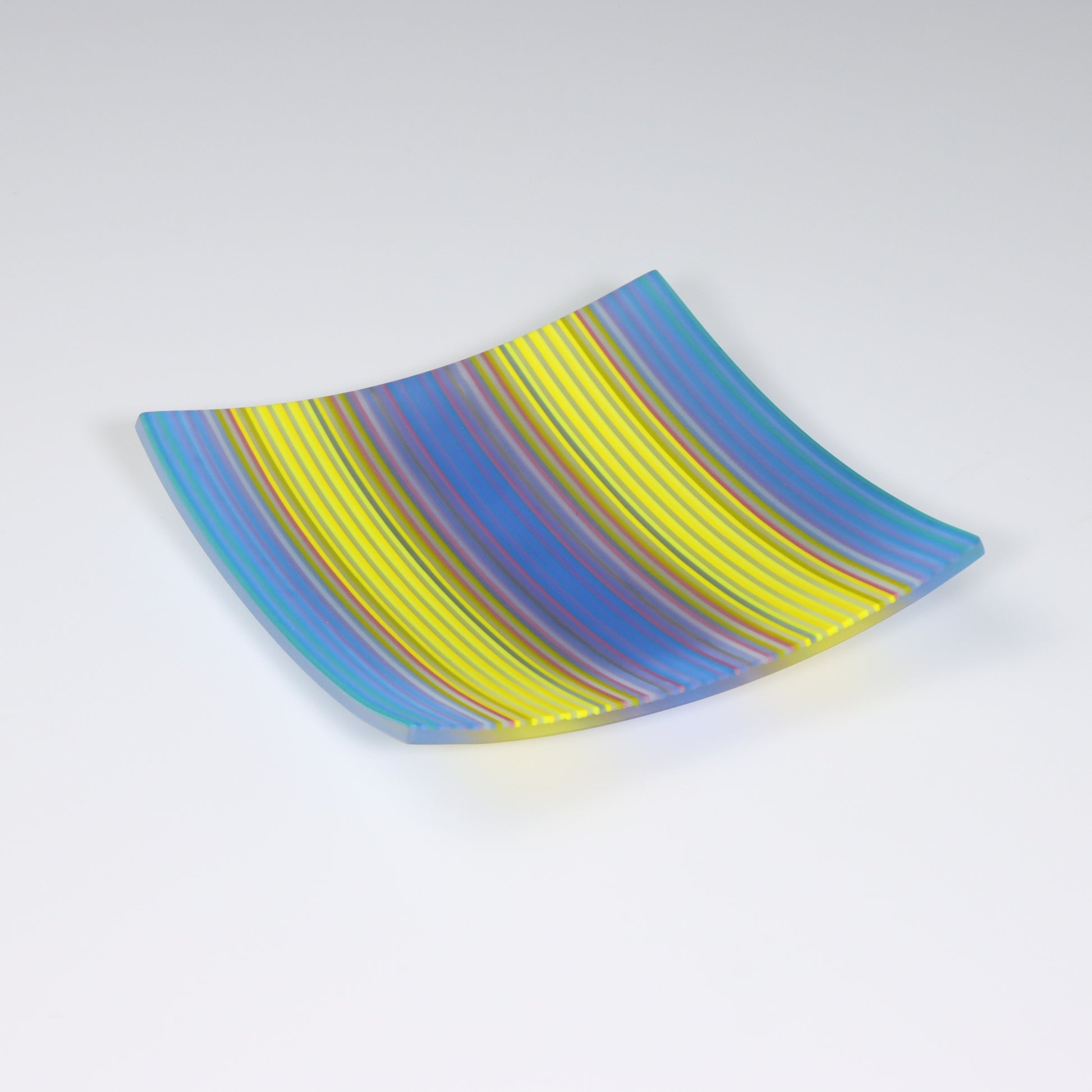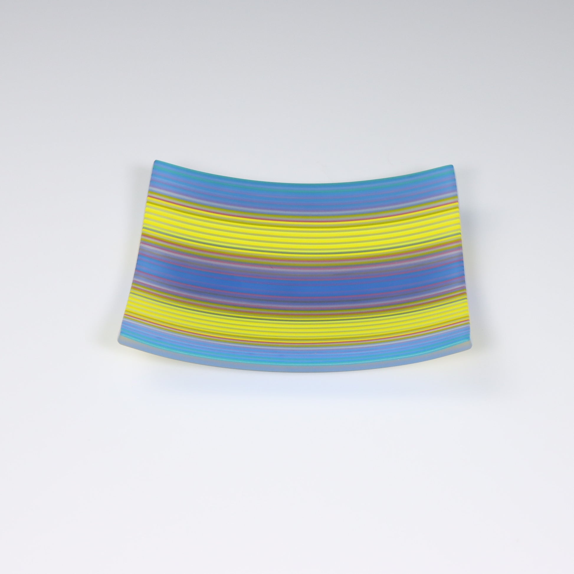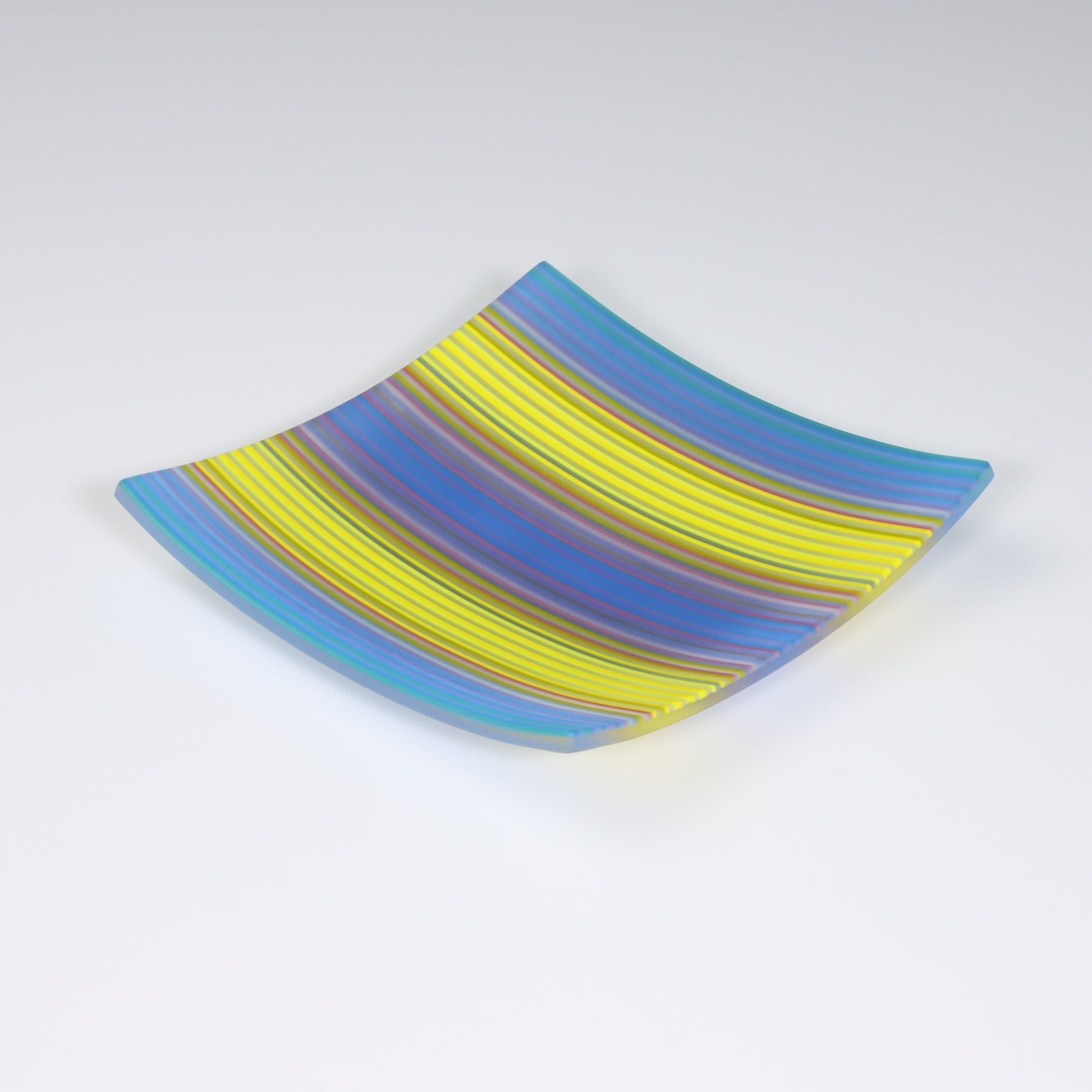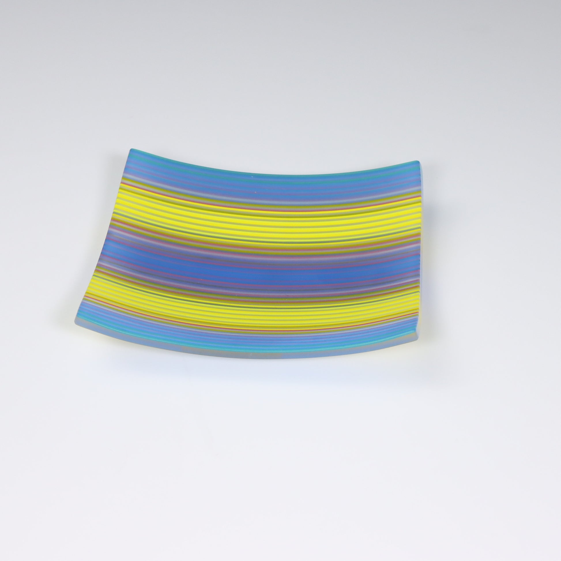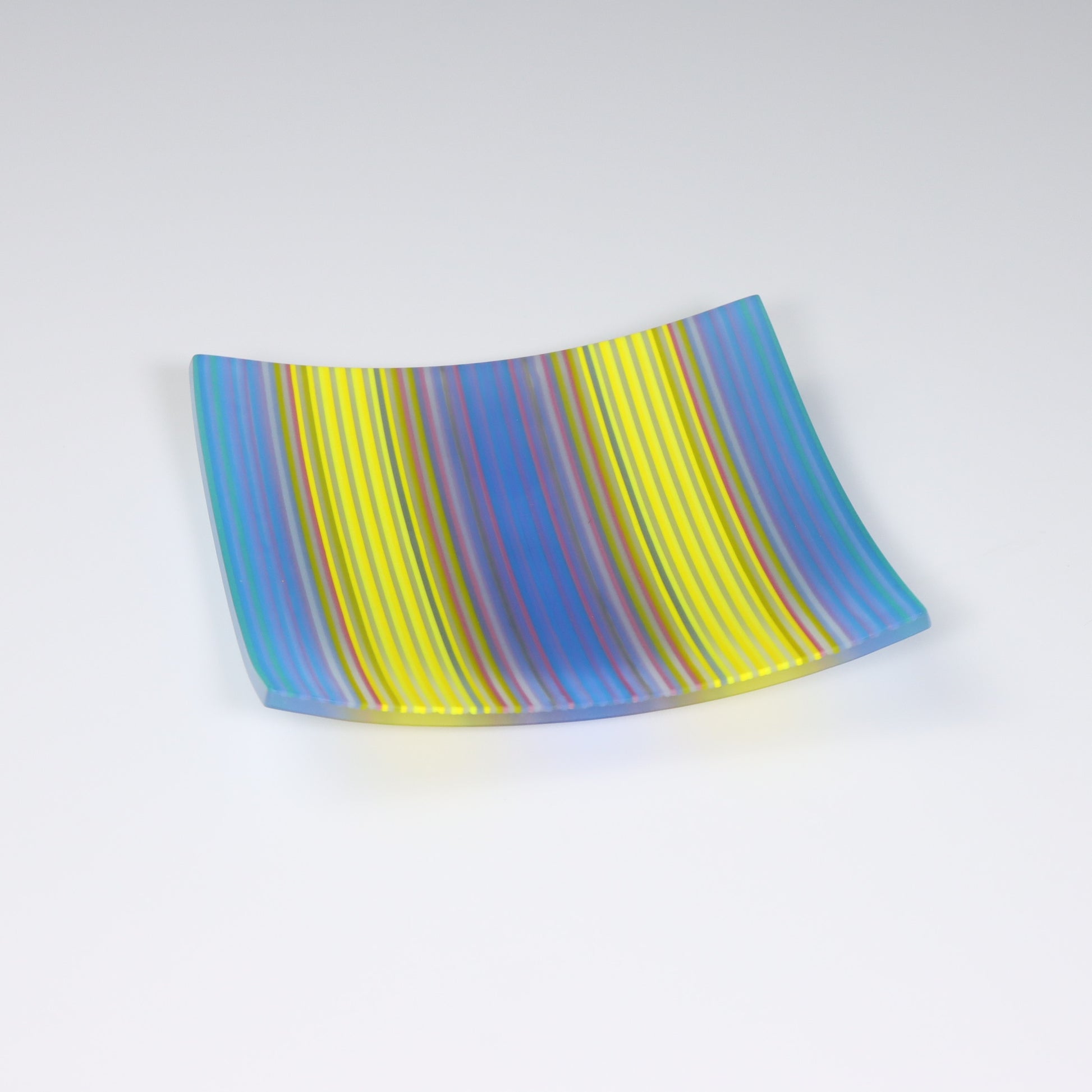 Make a bold statement with this striking ColourWave fused glass plate. Vibrant yellow waves contrast beautifully against a rich blue backdrop, while delicate hints of pink and purple add dimension and intrigue. Designed to capture attention, this plate brings a dynamic burst of energy and vibrancy to any room. Its sleek, curved-up edges and captivating composition make it the perfect piece to infuse your home with artistic flair and contemporary style.