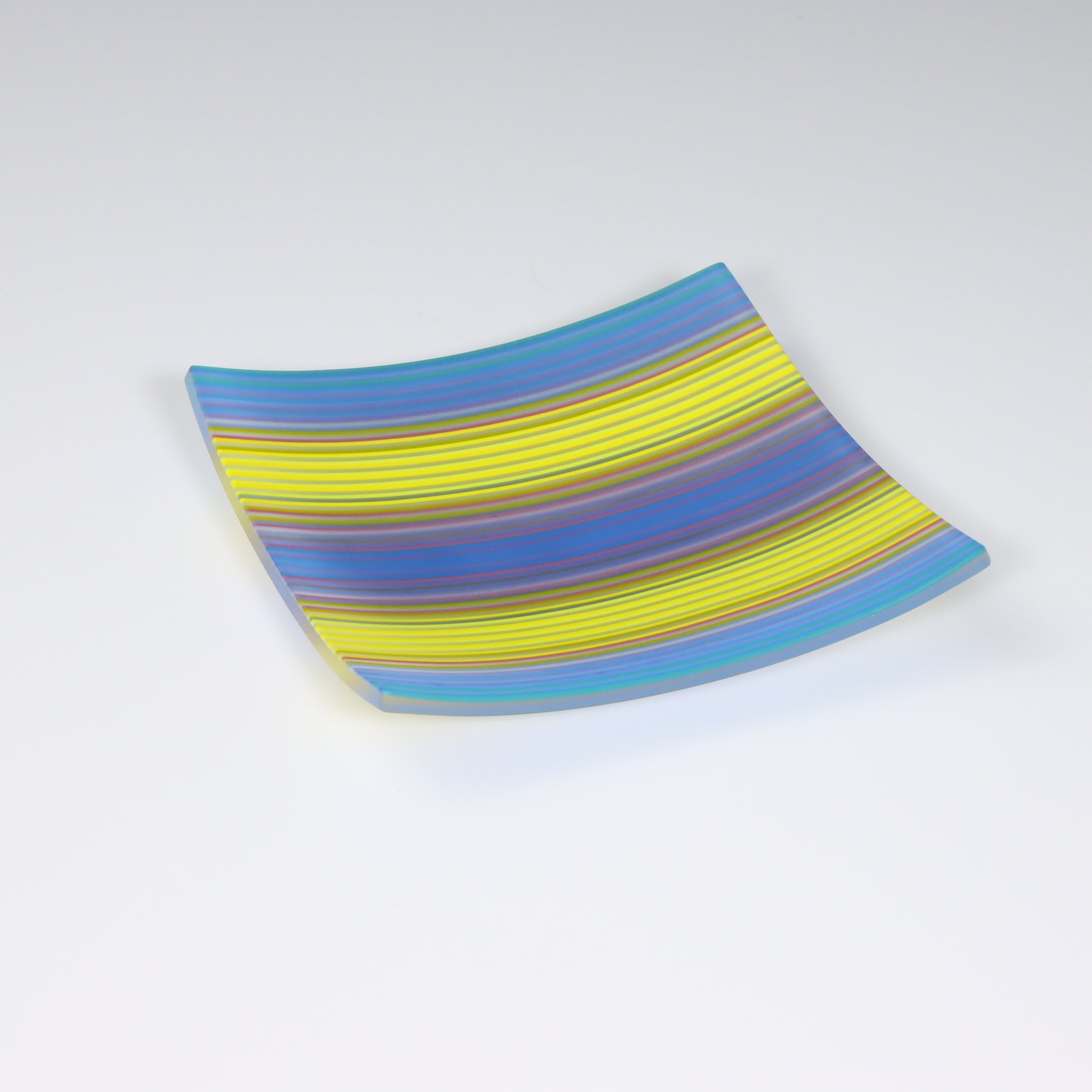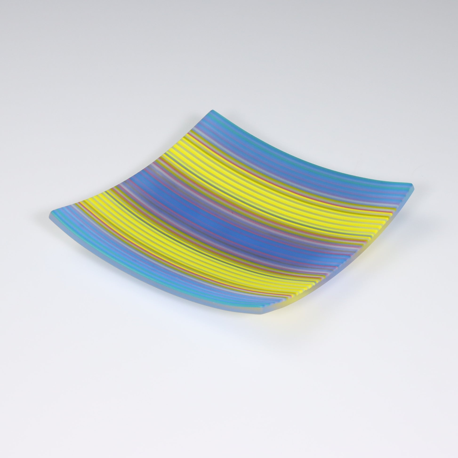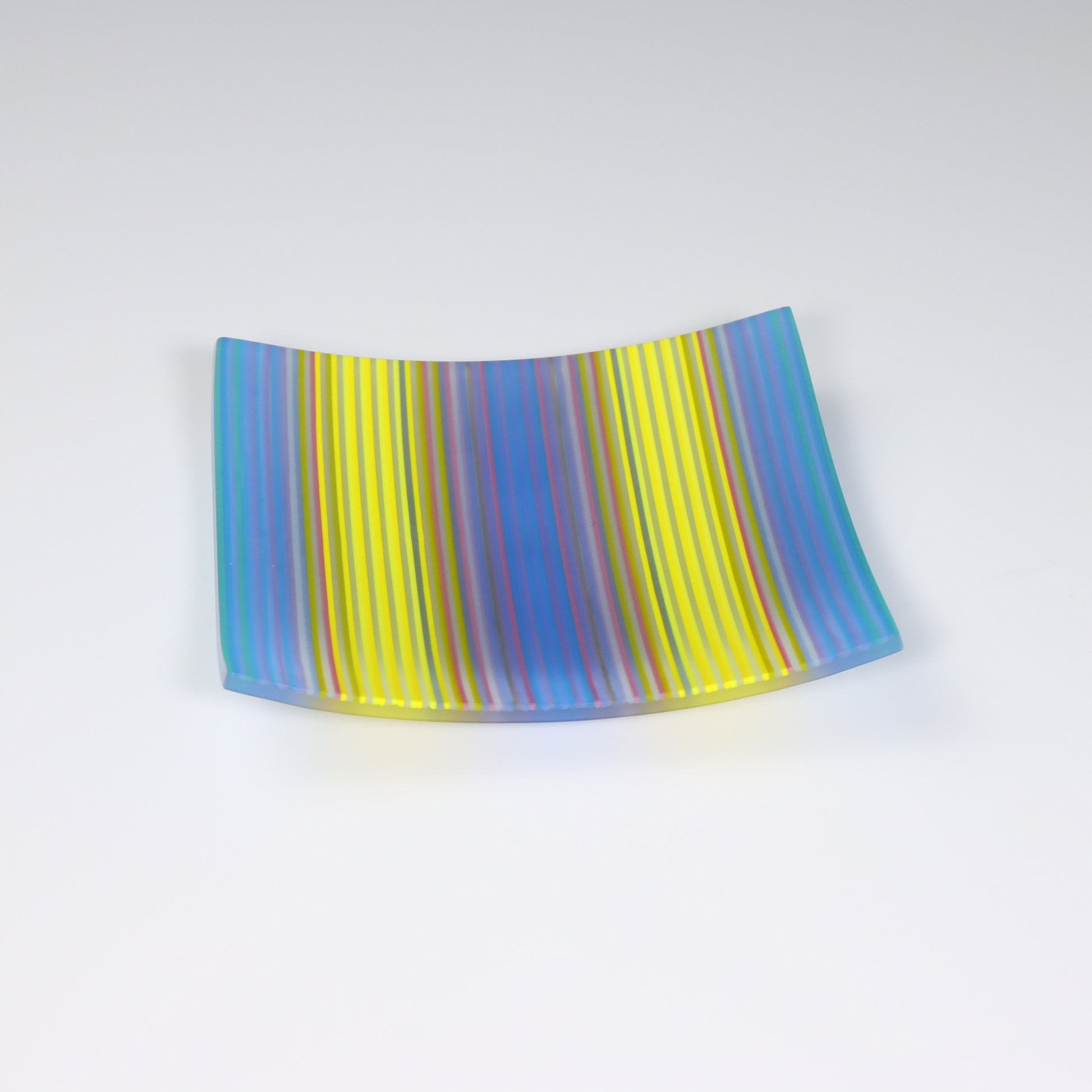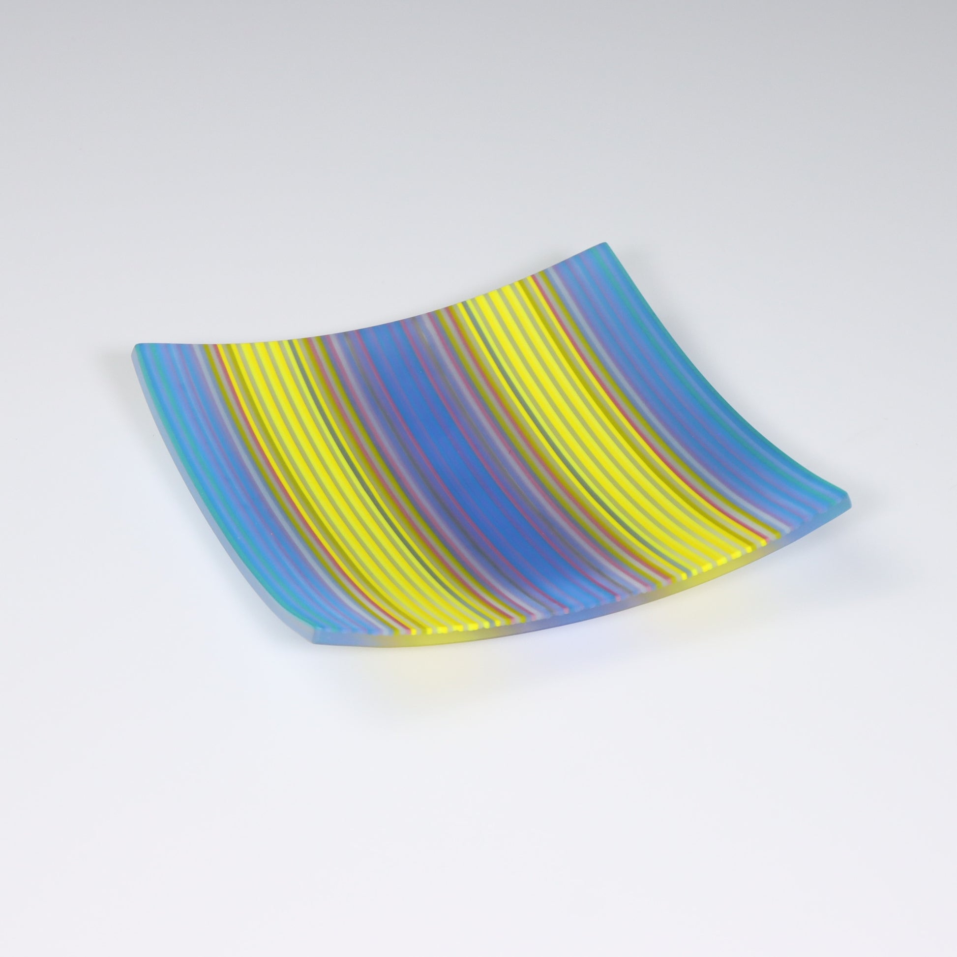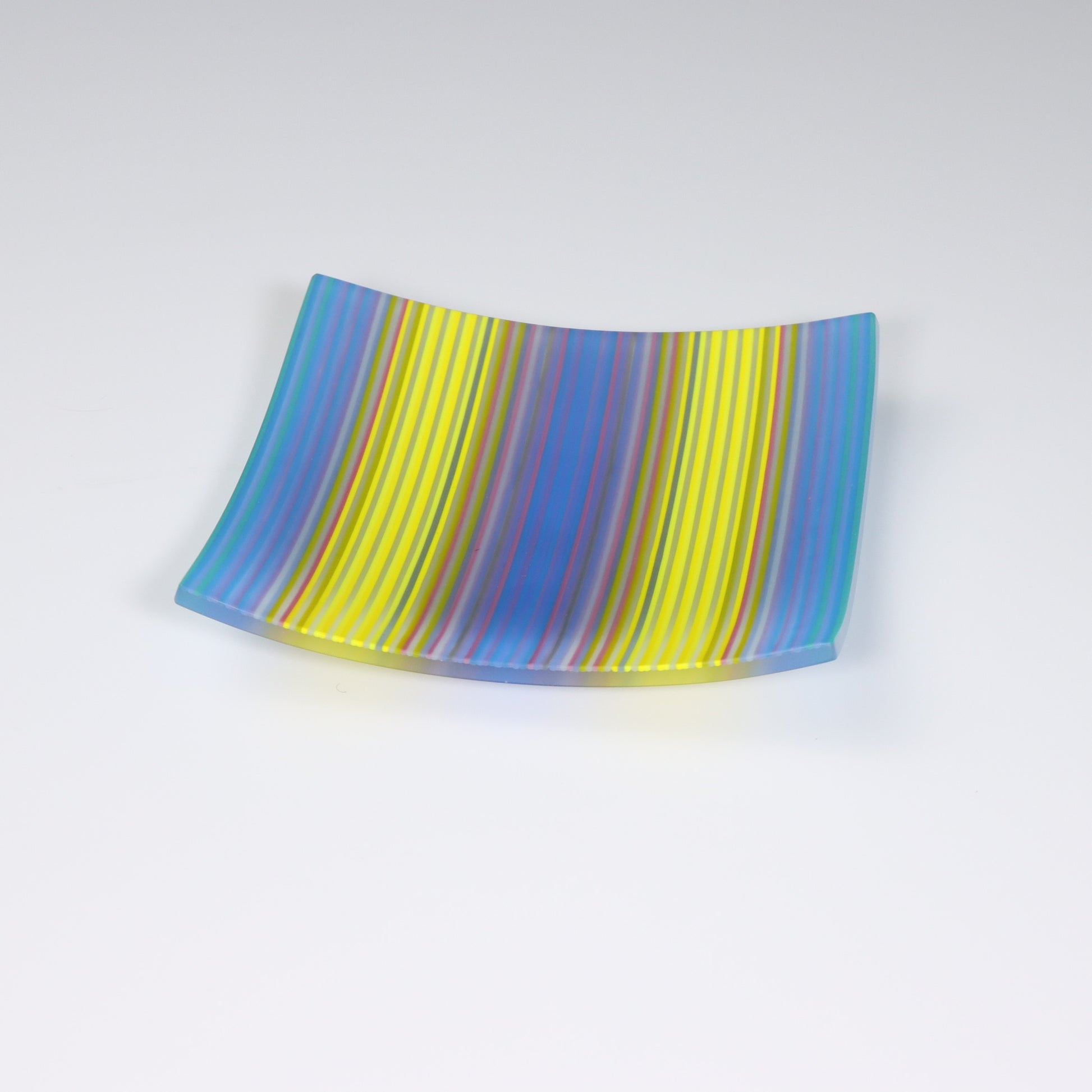 Make a bold statement with this striking ColourWave fused glass plate. Vibrant yellow waves contrast beautifully against a rich blue backdrop, while delicate hints of pink and purple add dimension and intrigue. Designed to capture attention, this plate brings a dynamic burst of energy and vibrancy to any room. Its sleek, curved-up edges and captivating composition make it the perfect piece to infuse your home with artistic flair and contemporary style.