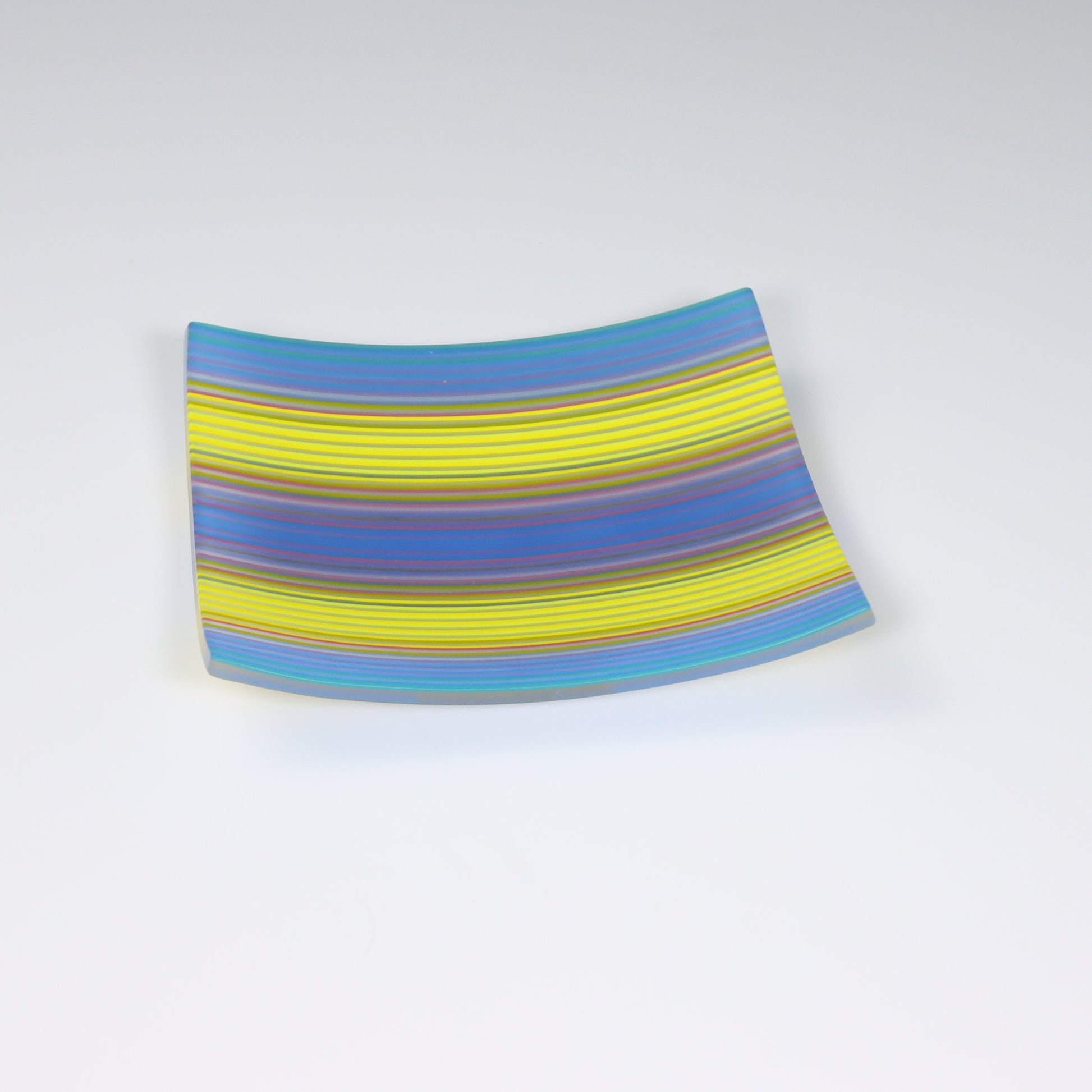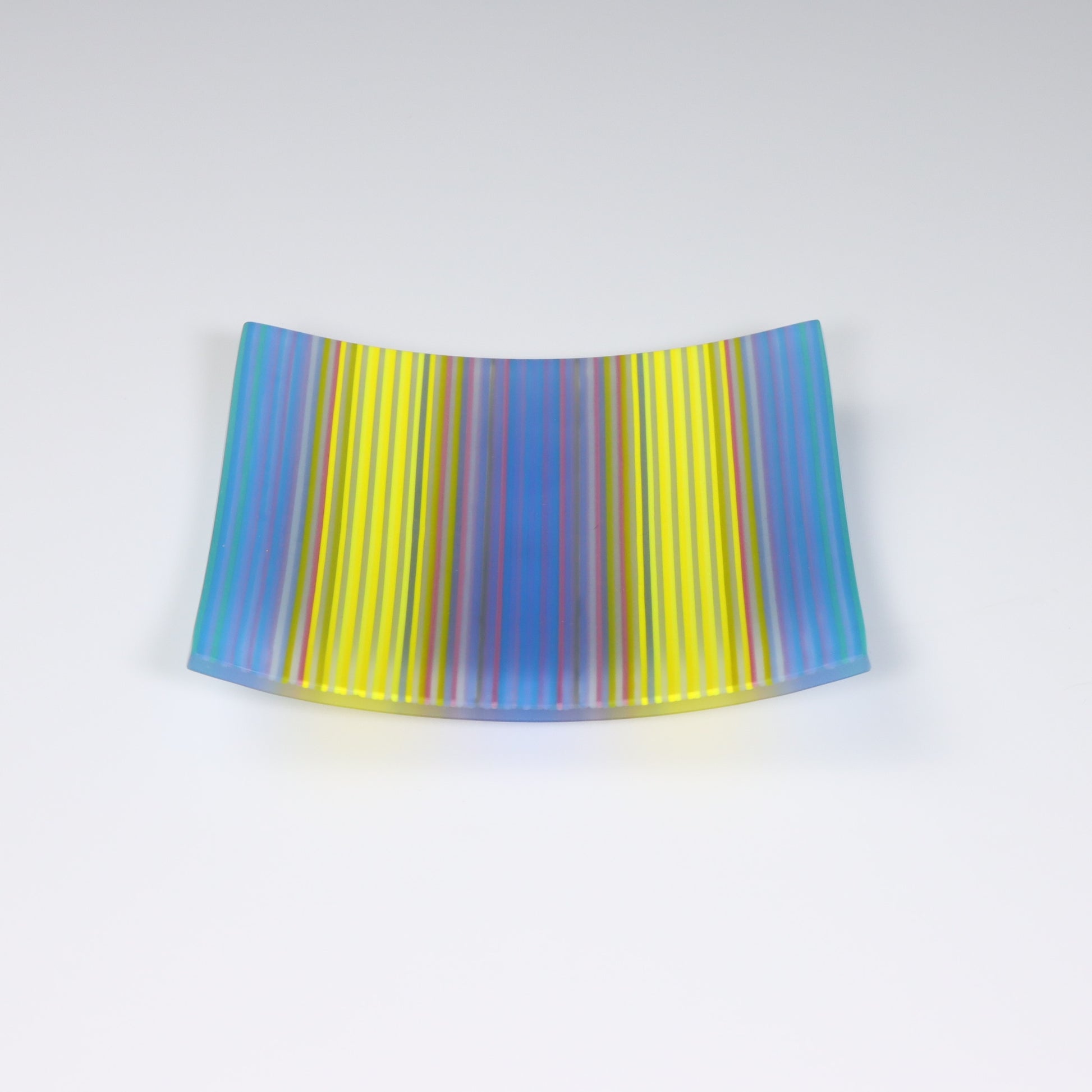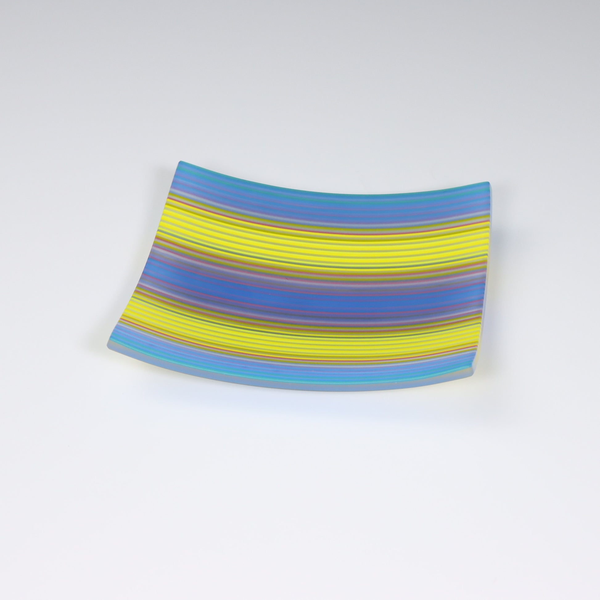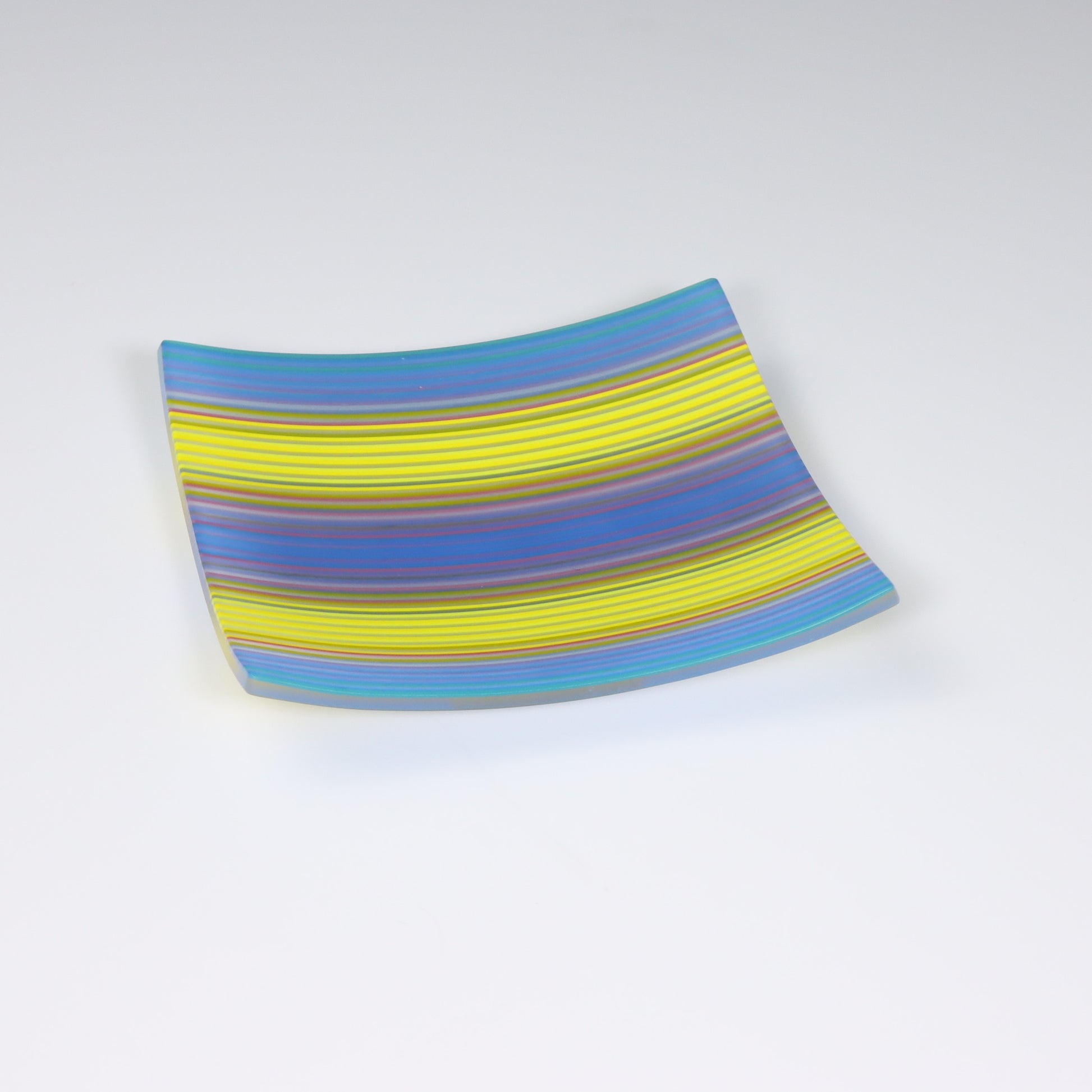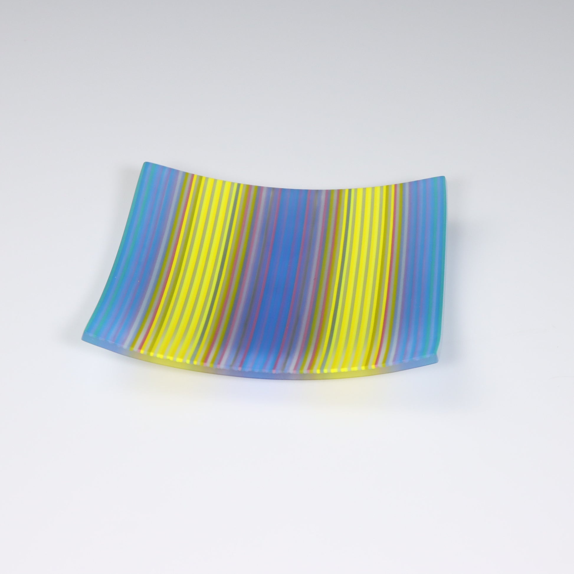 Make a bold statement with this striking ColourWave fused glass plate. Vibrant yellow waves contrast beautifully against a rich blue backdrop, while delicate hints of pink and purple add dimension and intrigue. Designed to capture attention, this plate brings a dynamic burst of energy and vibrancy to any room. Its sleek, curved-up edges and captivating composition make it the perfect piece to infuse your home with artistic flair and contemporary style.