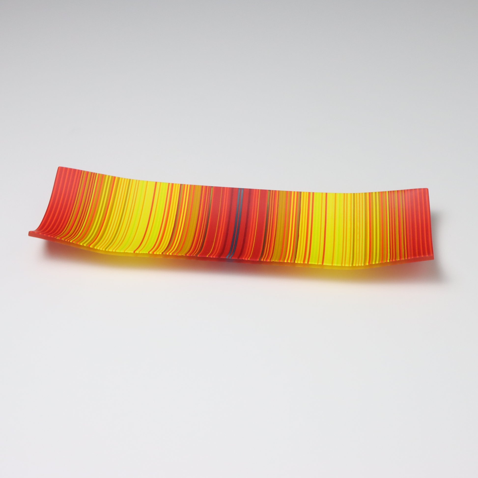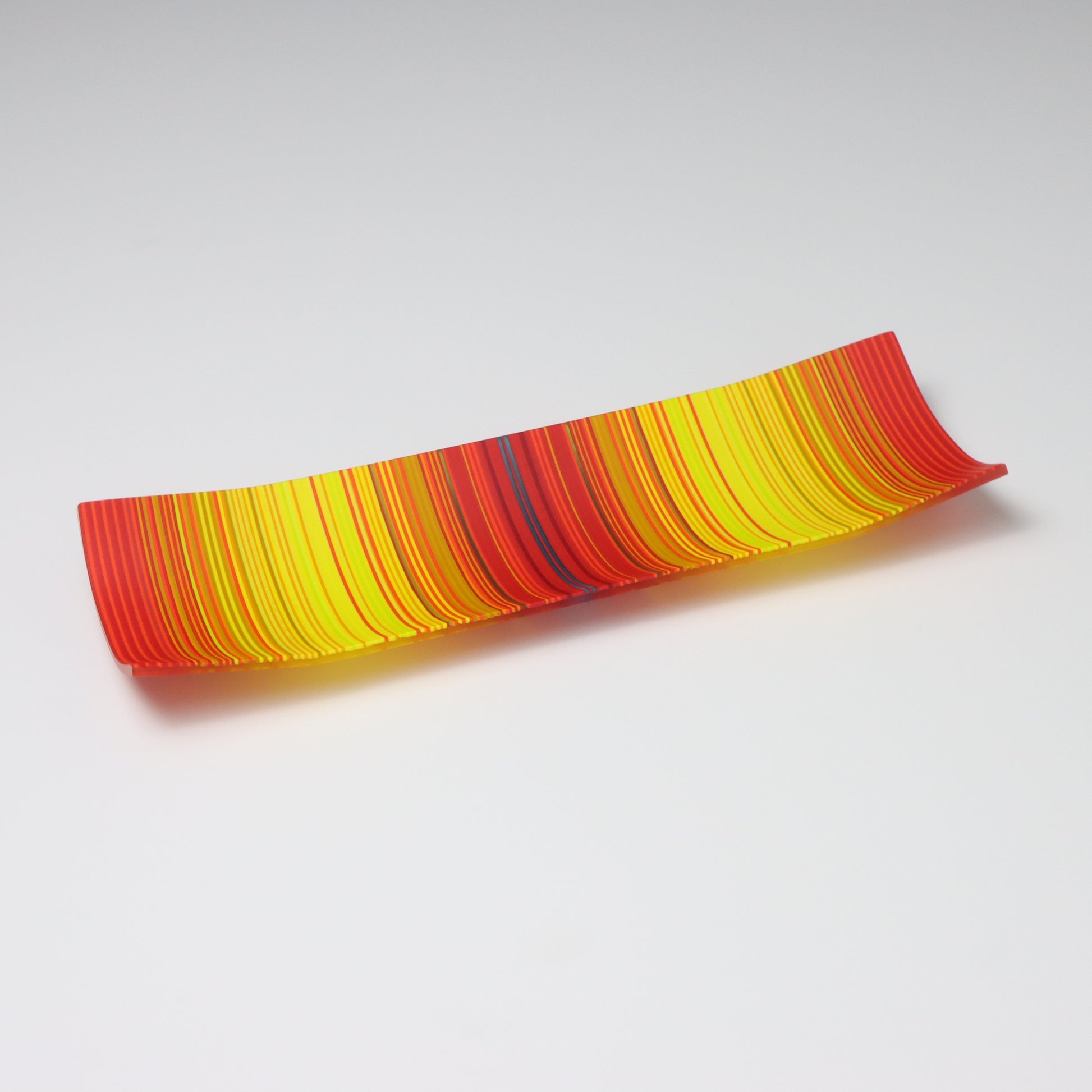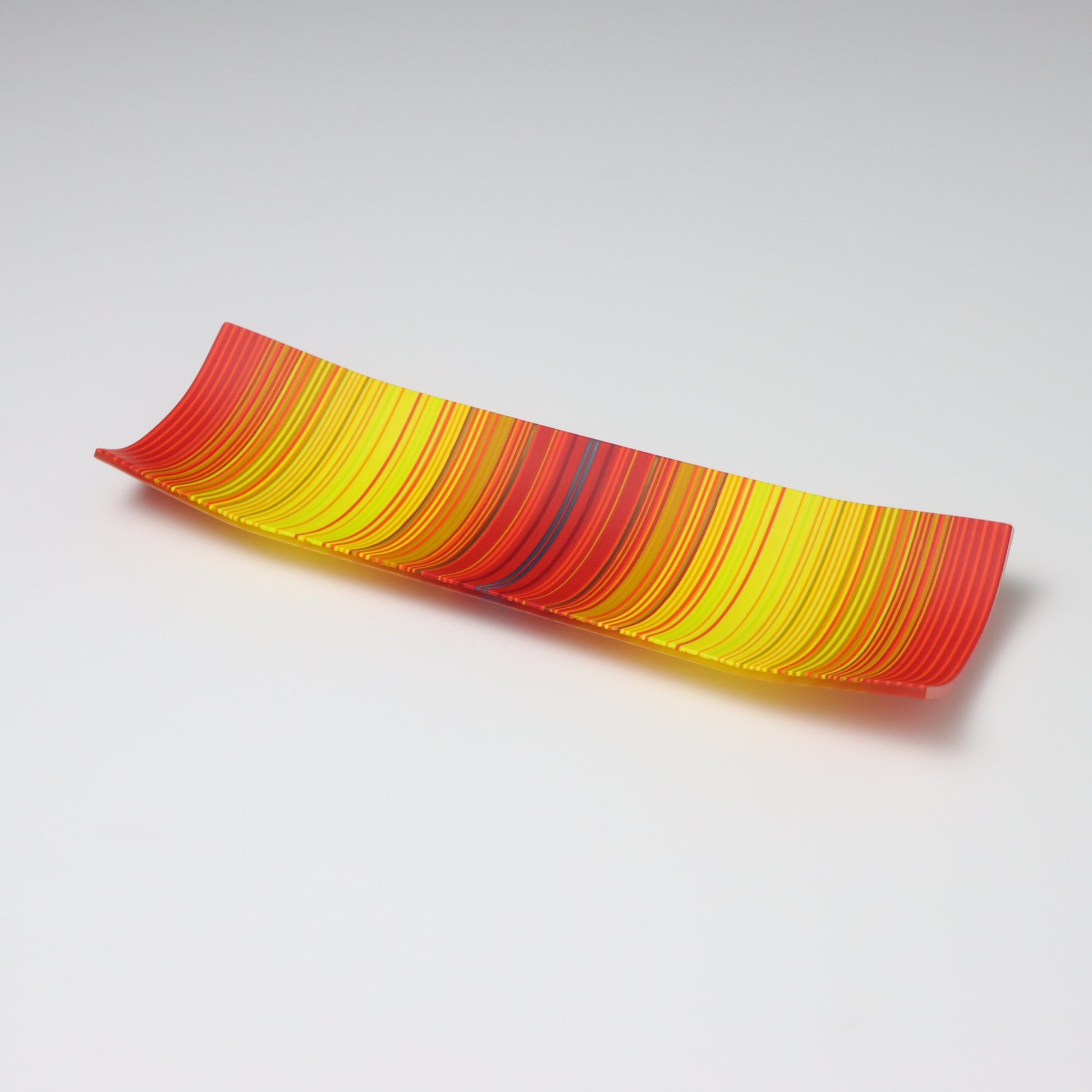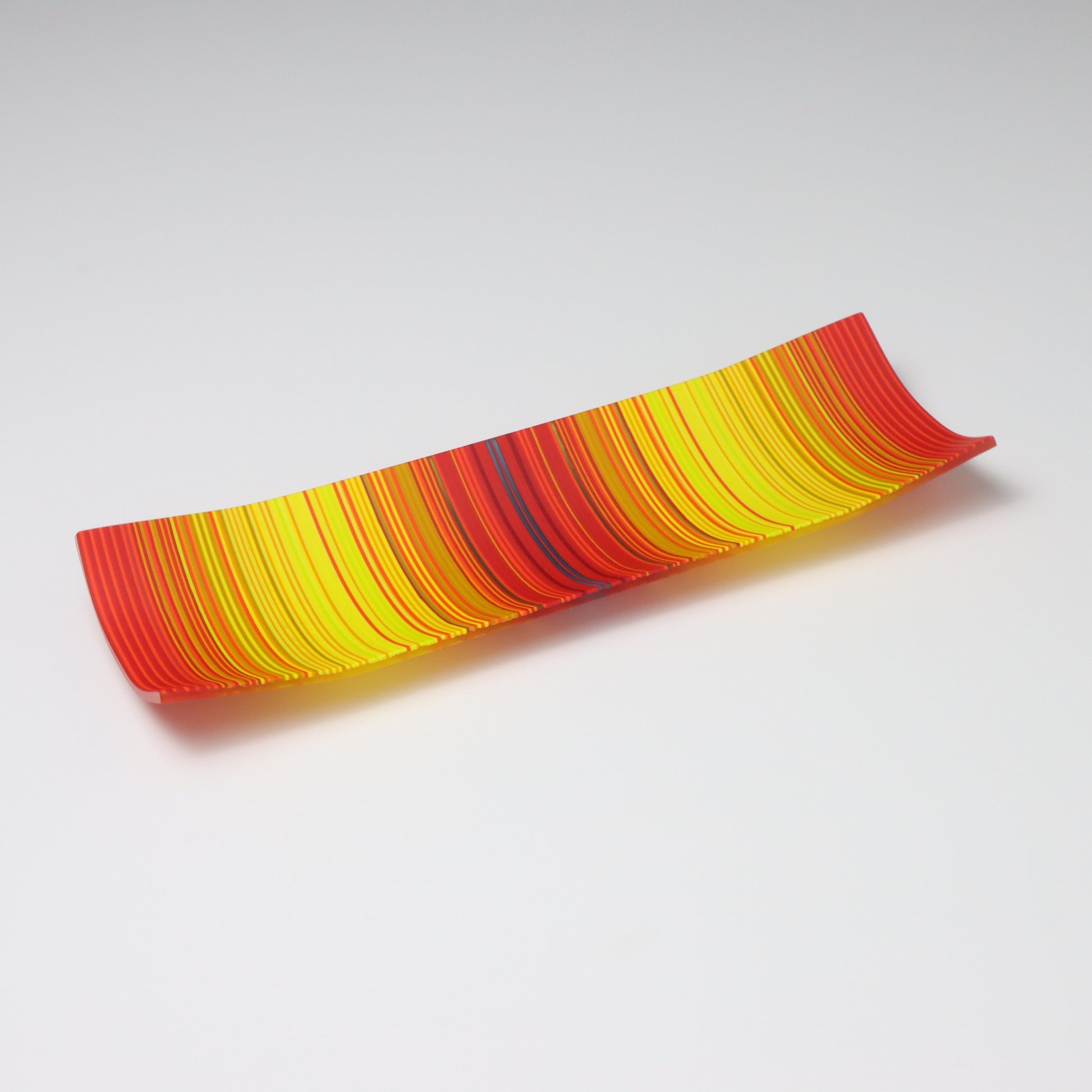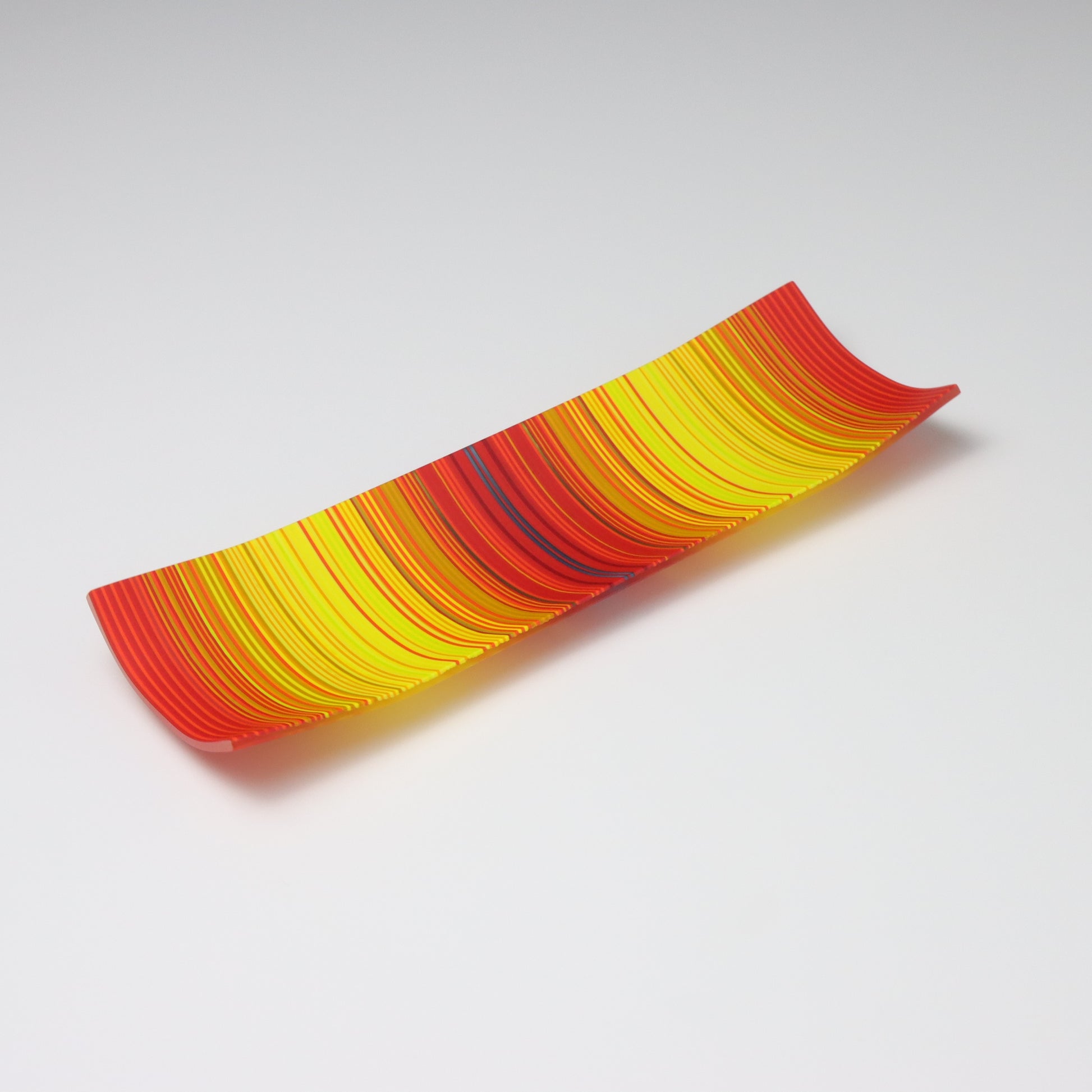 A true beacon of vibrancy, this rectangular ColourWave Glass fused glass plate radiates warmth, energy, and positivity. Waves of fiery red and golden yellow blend across its surface, leading into two strands of cooling blue in the centre. The striking gradient creates a visually dynamic display that lifts the mood of any room. With soft upward-curved edges, its modern shape makes a powerful statement of bold design. Whether used as a focal point in a living space or as a colourful contrast in a neutral setting, this piece brings unmistakable energy and contemporary style to any interior.