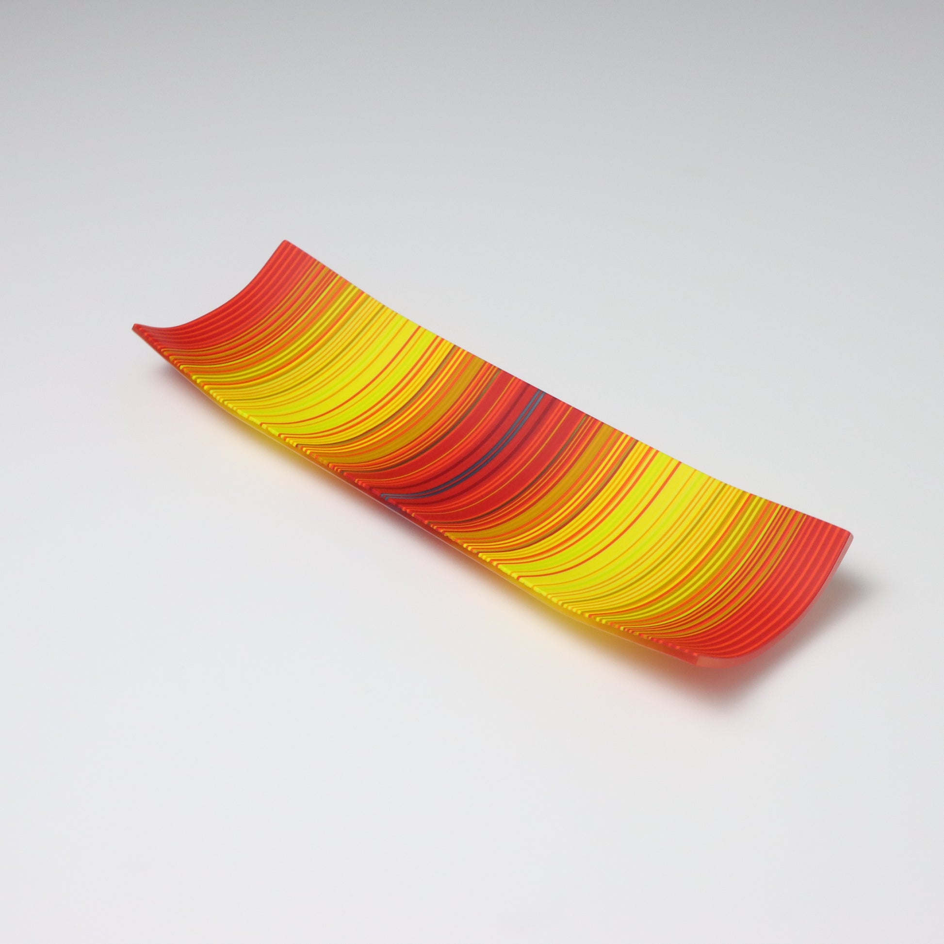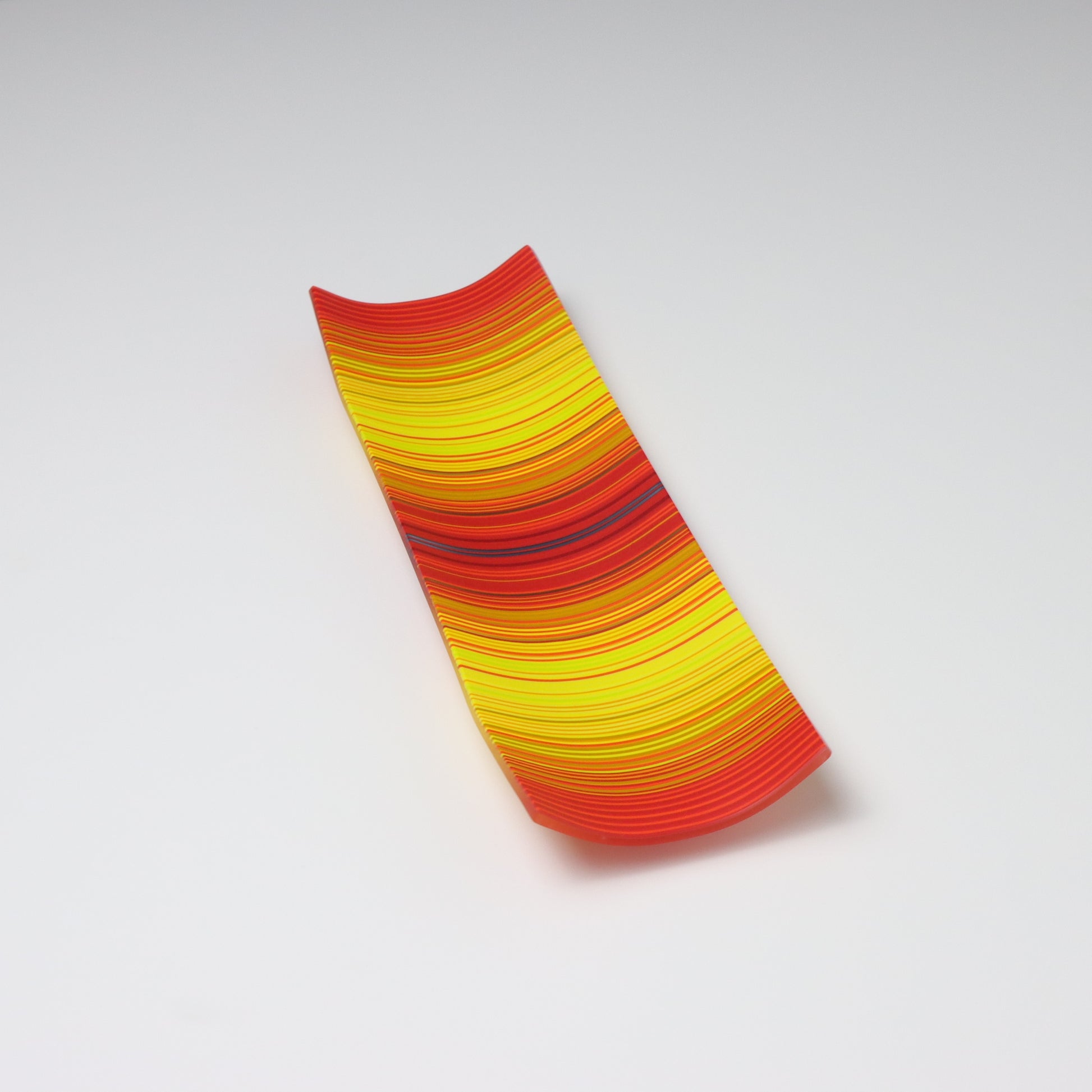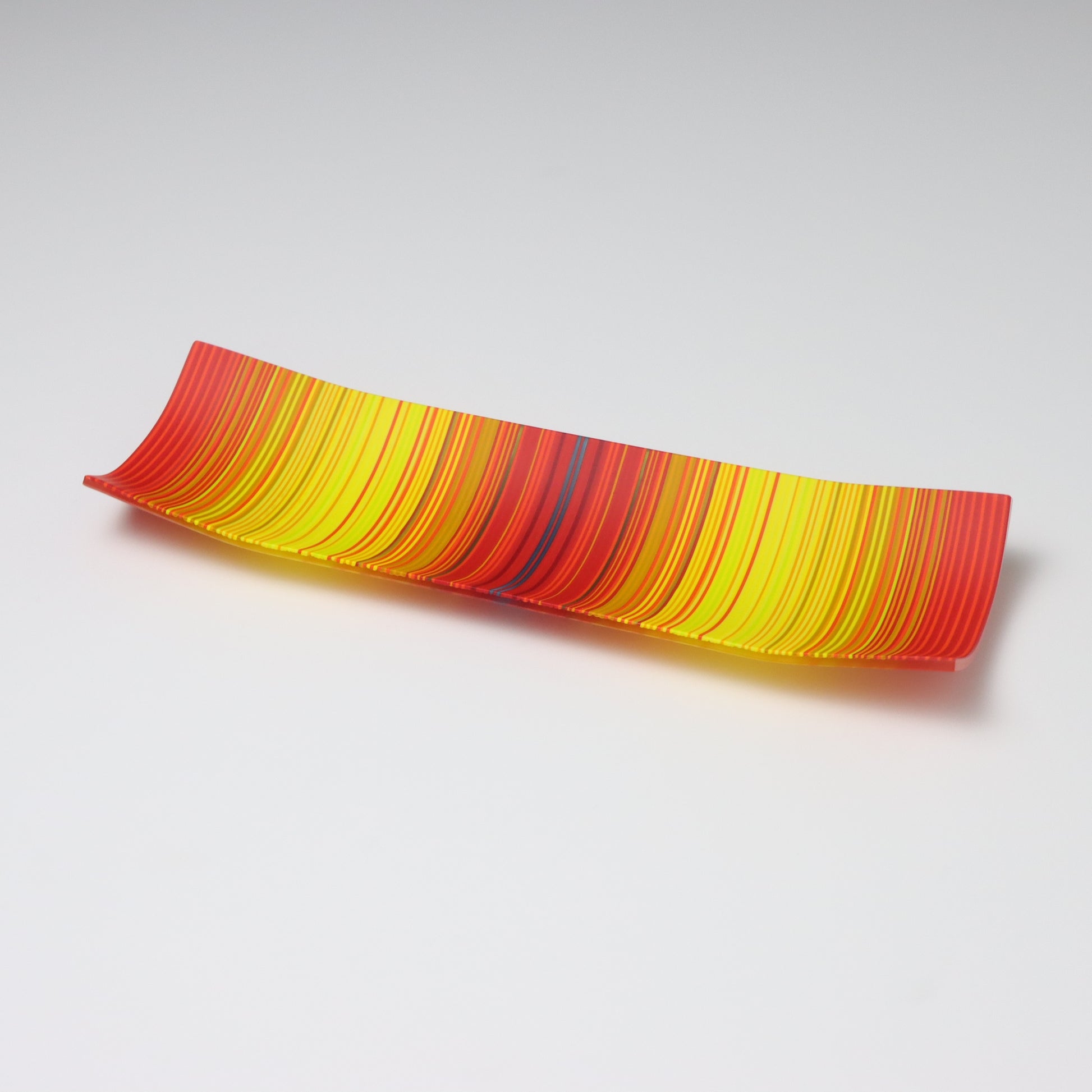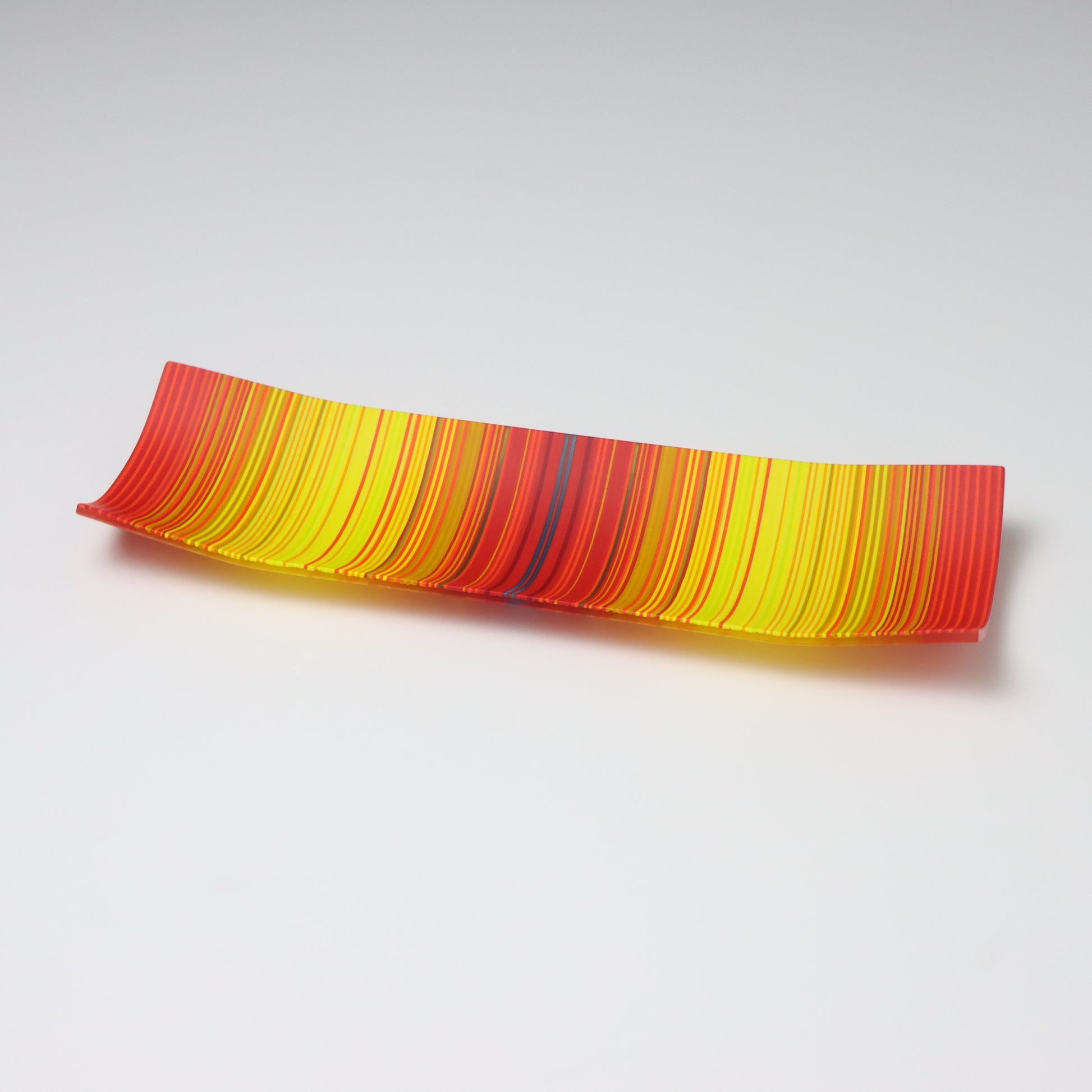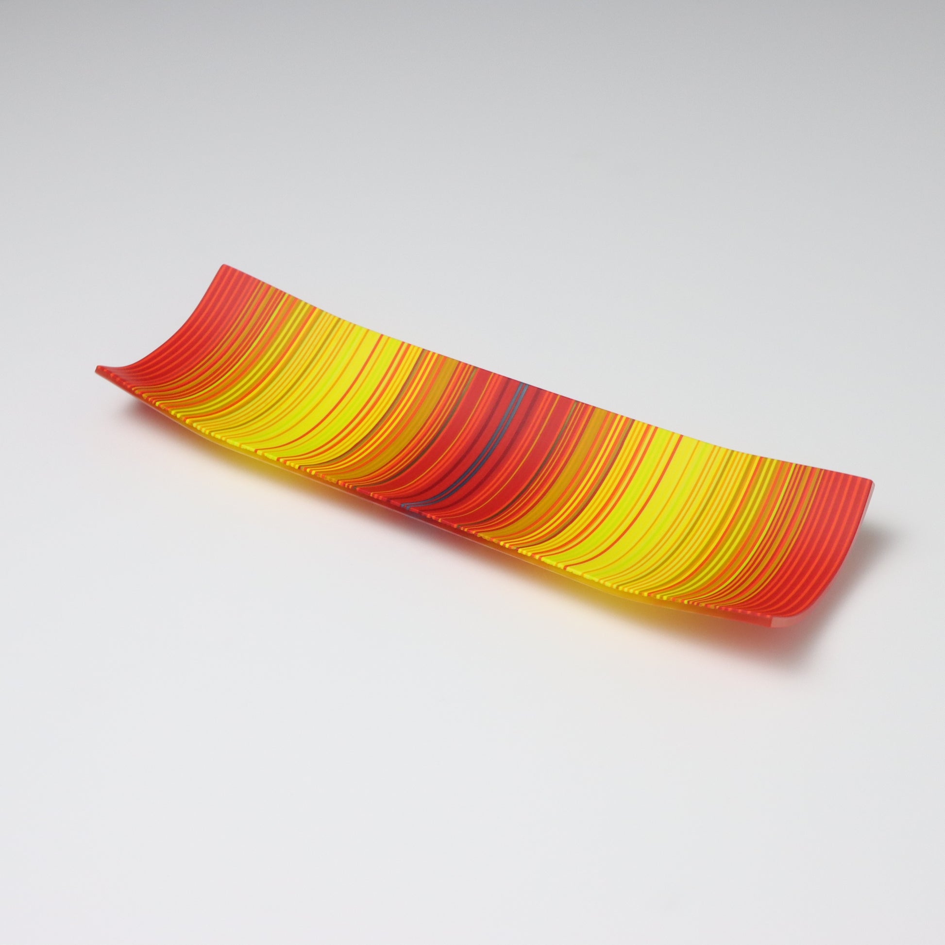 A true beacon of vibrancy, this rectangular ColourWave Glass fused glass plate radiates warmth, energy, and positivity. Waves of fiery red and golden yellow blend across its surface, leading into two strands of cooling blue in the centre. The striking gradient creates a visually dynamic display that lifts the mood of any room. With soft upward-curved edges, its modern shape makes a powerful statement of bold design. Whether used as a focal point in a living space or as a colourful contrast in a neutral setting, this piece brings unmistakable energy and contemporary style to any interior.