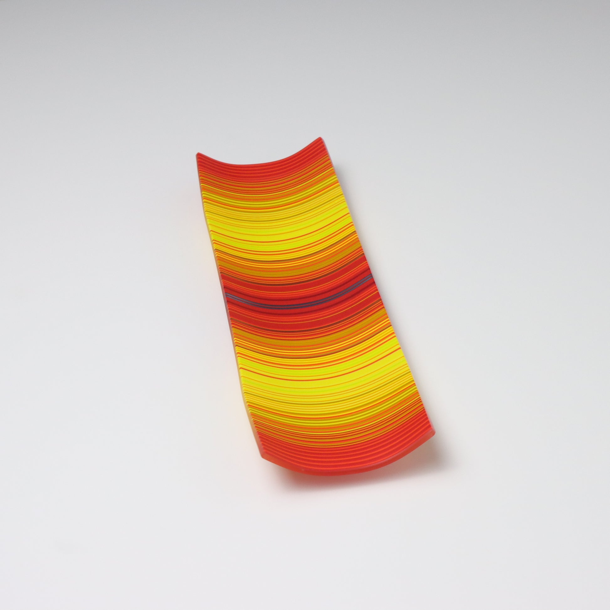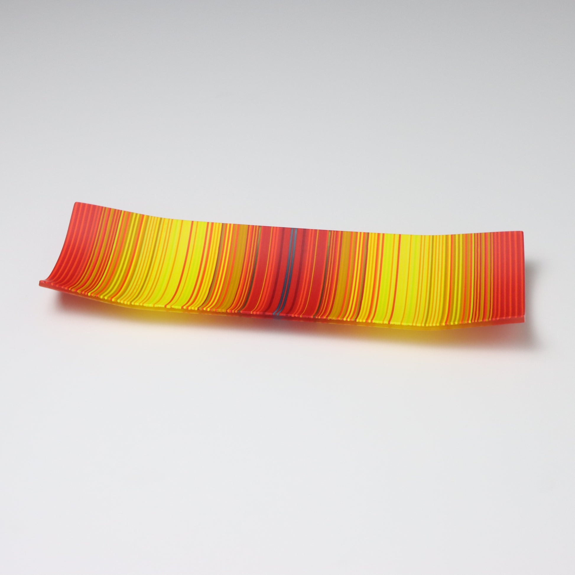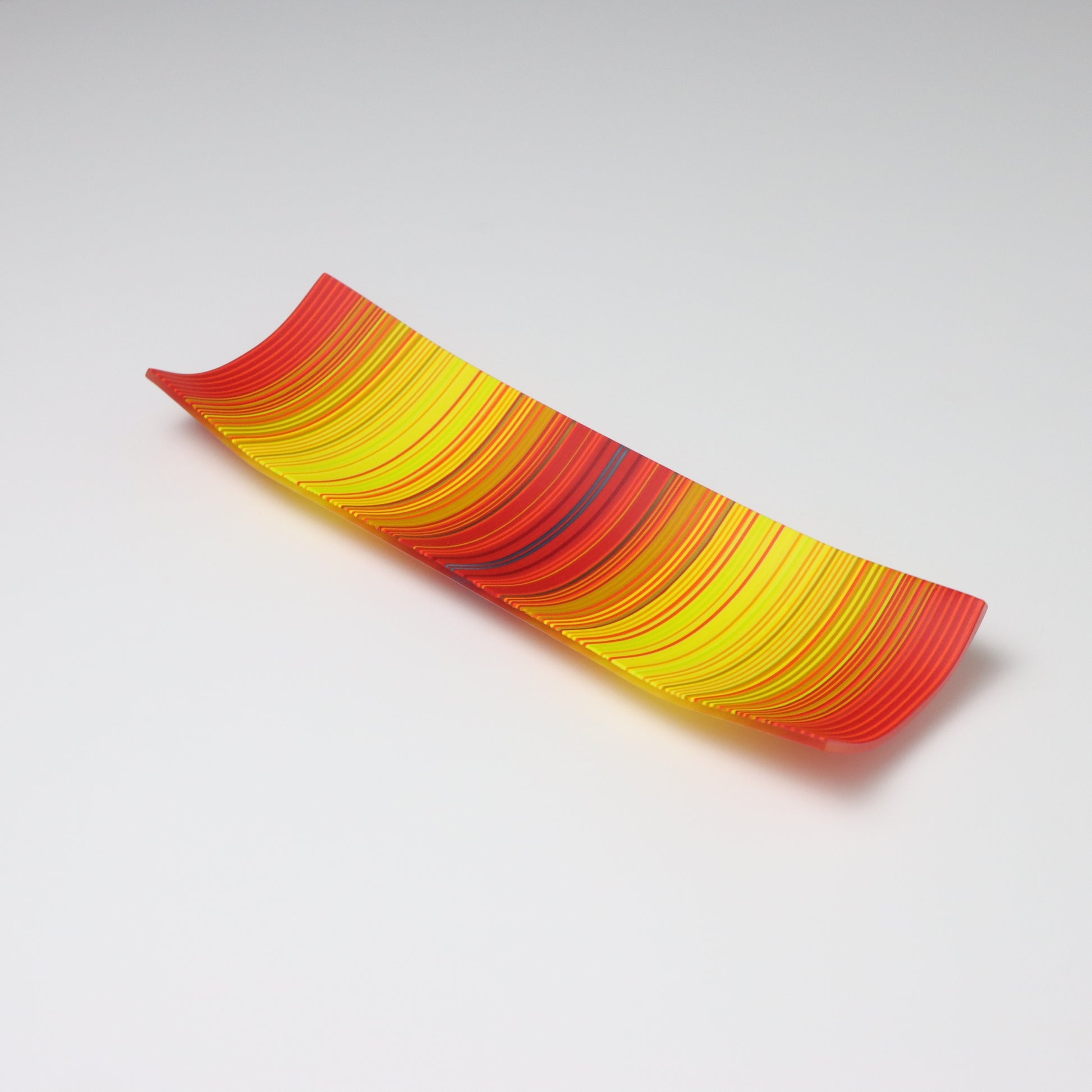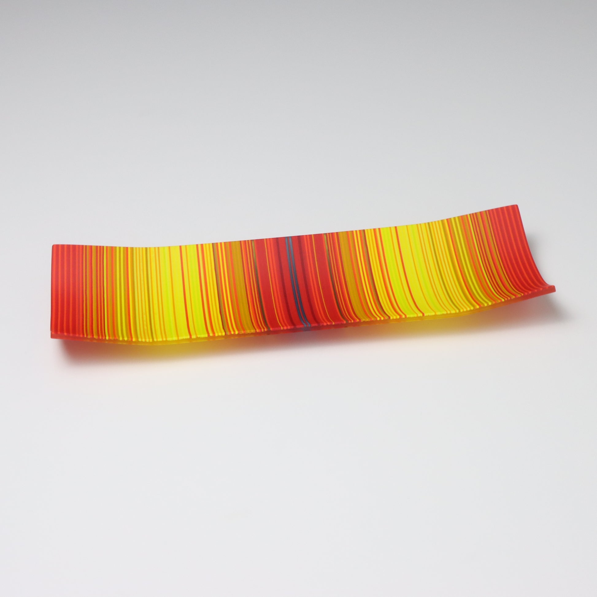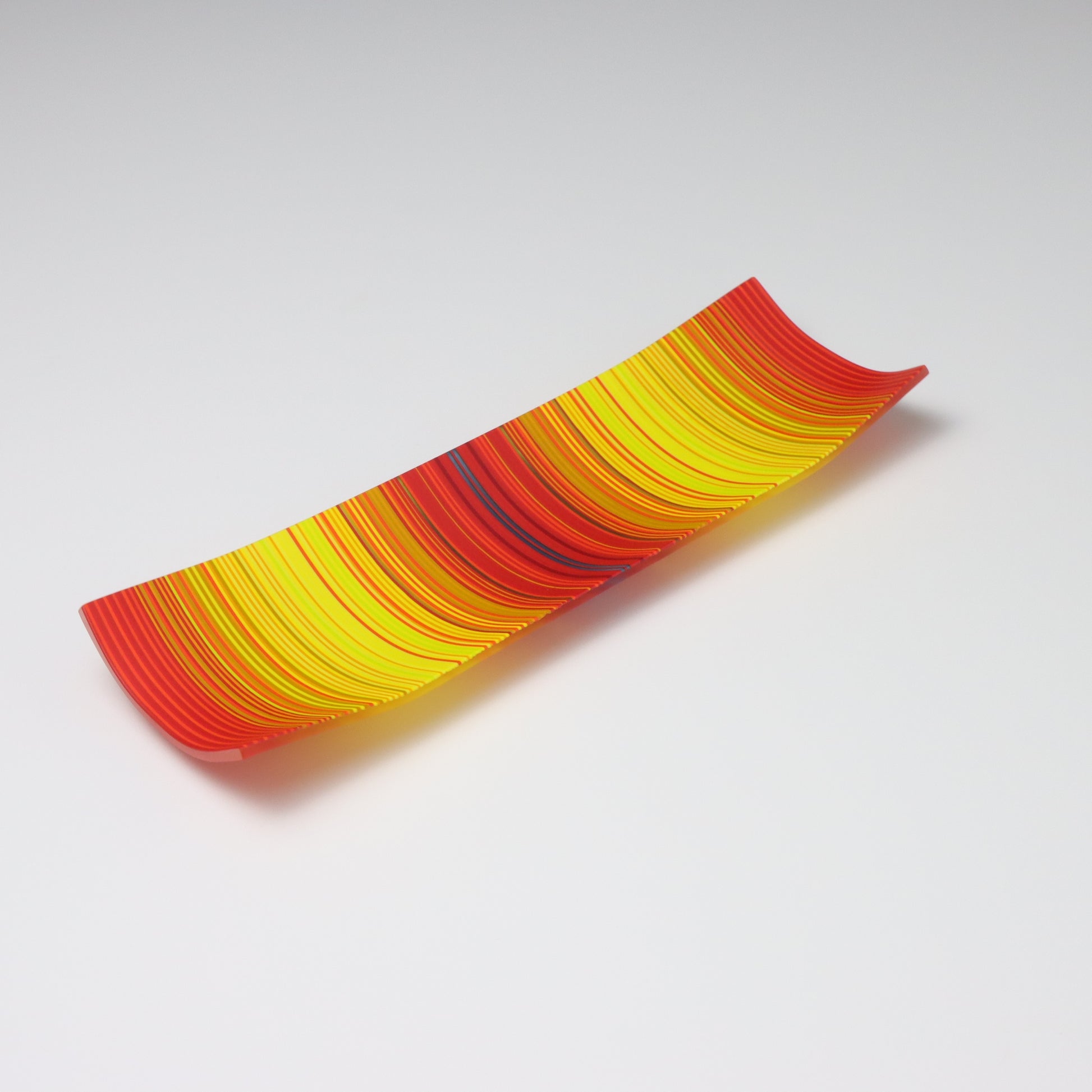 A true beacon of vibrancy, this rectangular ColourWave Glass fused glass plate radiates warmth, energy, and positivity. Waves of fiery red and golden yellow blend across its surface, leading into two strands of cooling blue in the centre. The striking gradient creates a visually dynamic display that lifts the mood of any room. With soft upward-curved edges, its modern shape makes a powerful statement of bold design. Whether used as a focal point in a living space or as a colourful contrast in a neutral setting, this piece brings unmistakable energy and contemporary style to any interior.