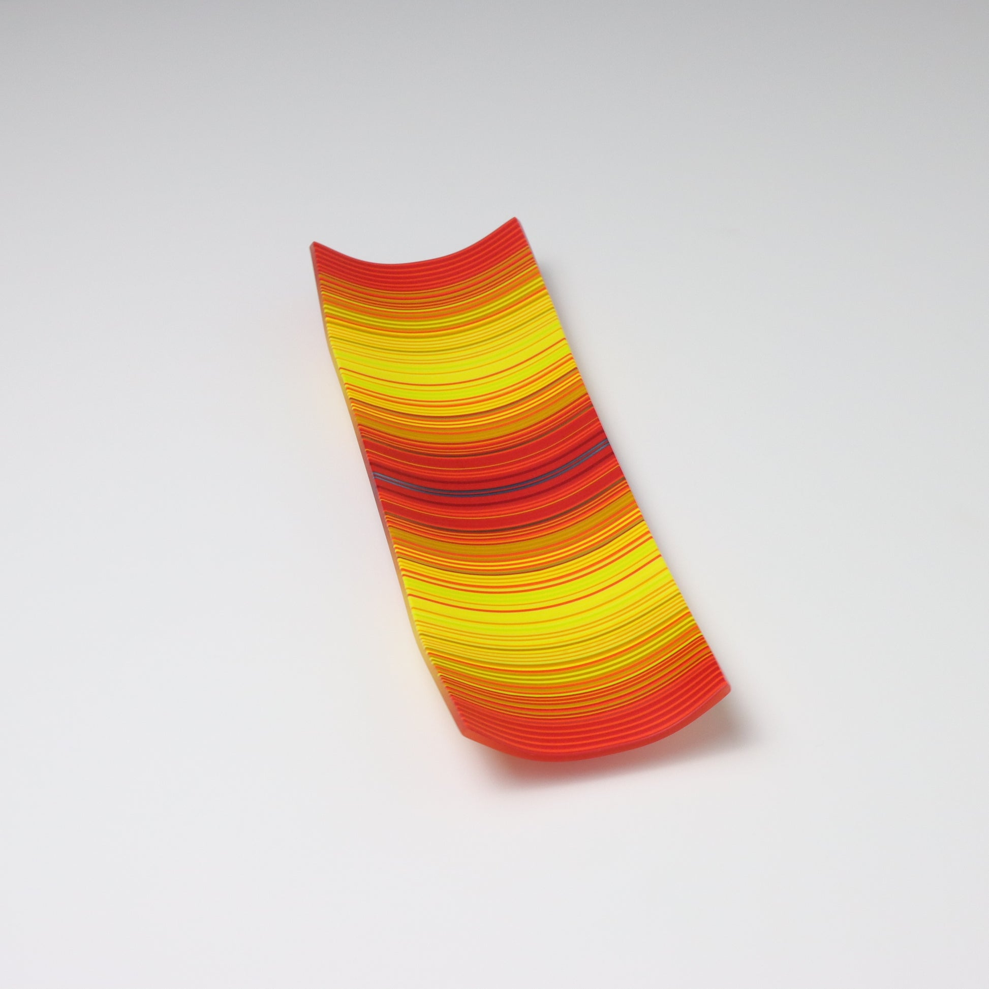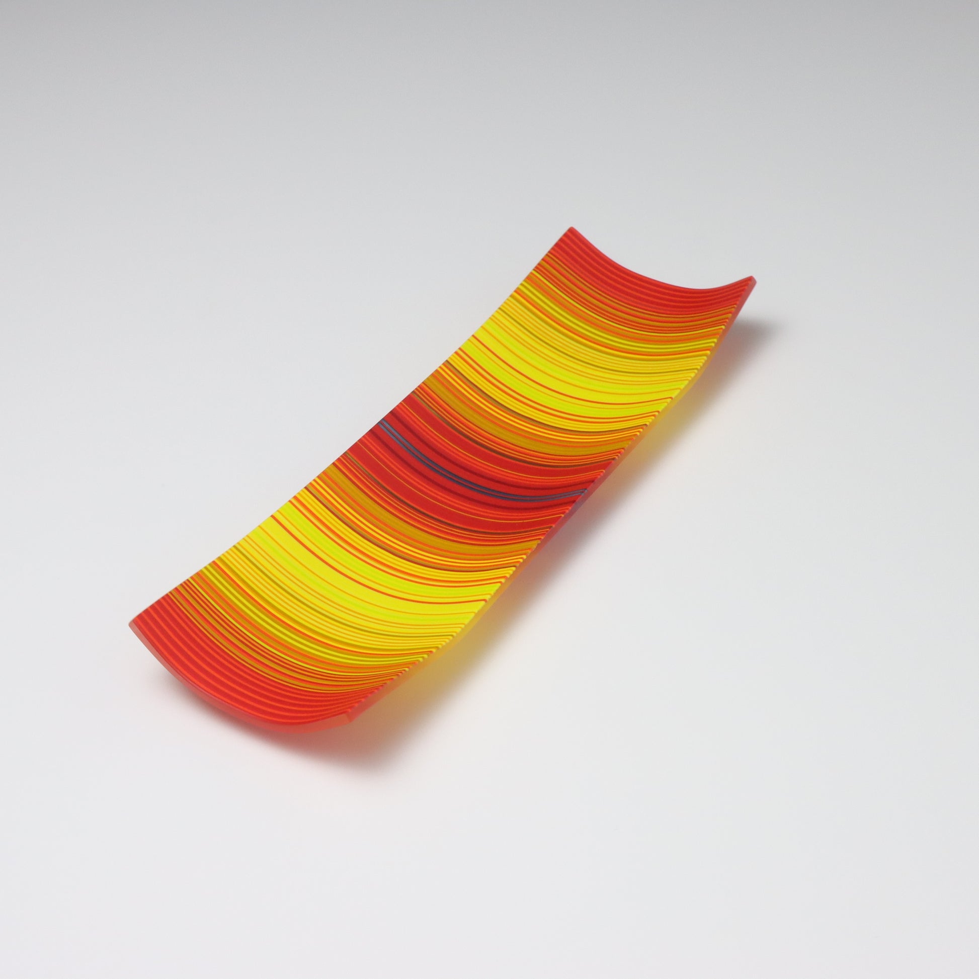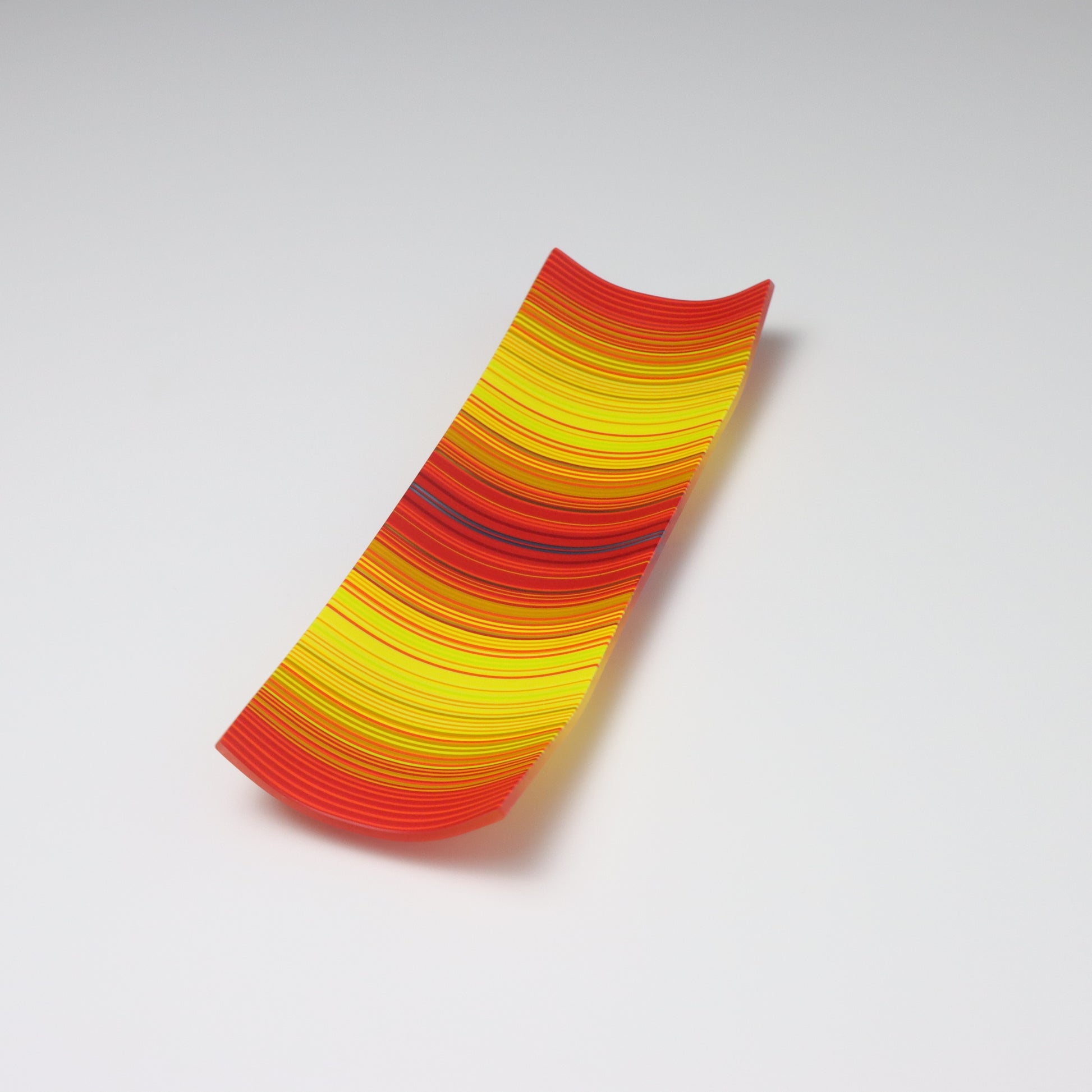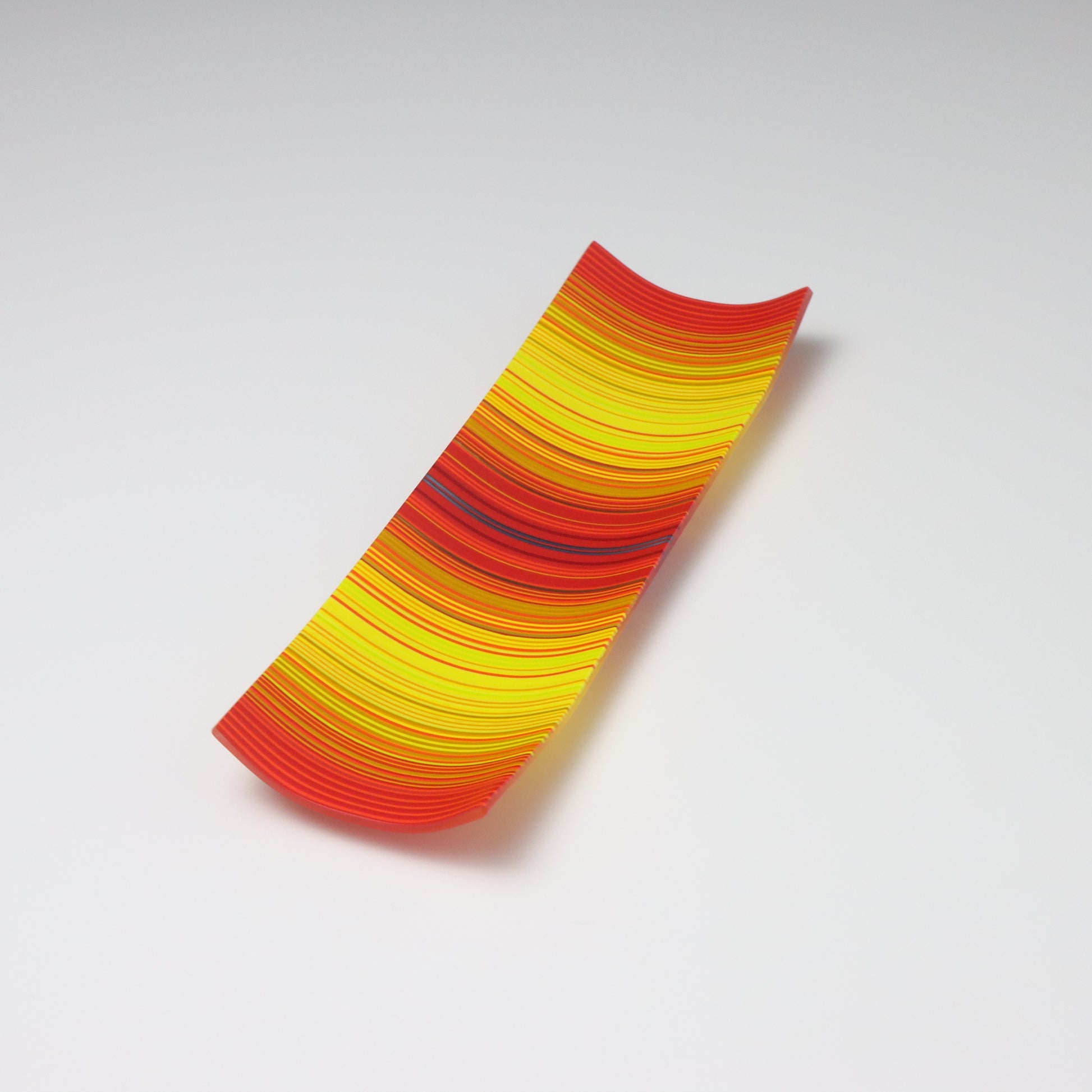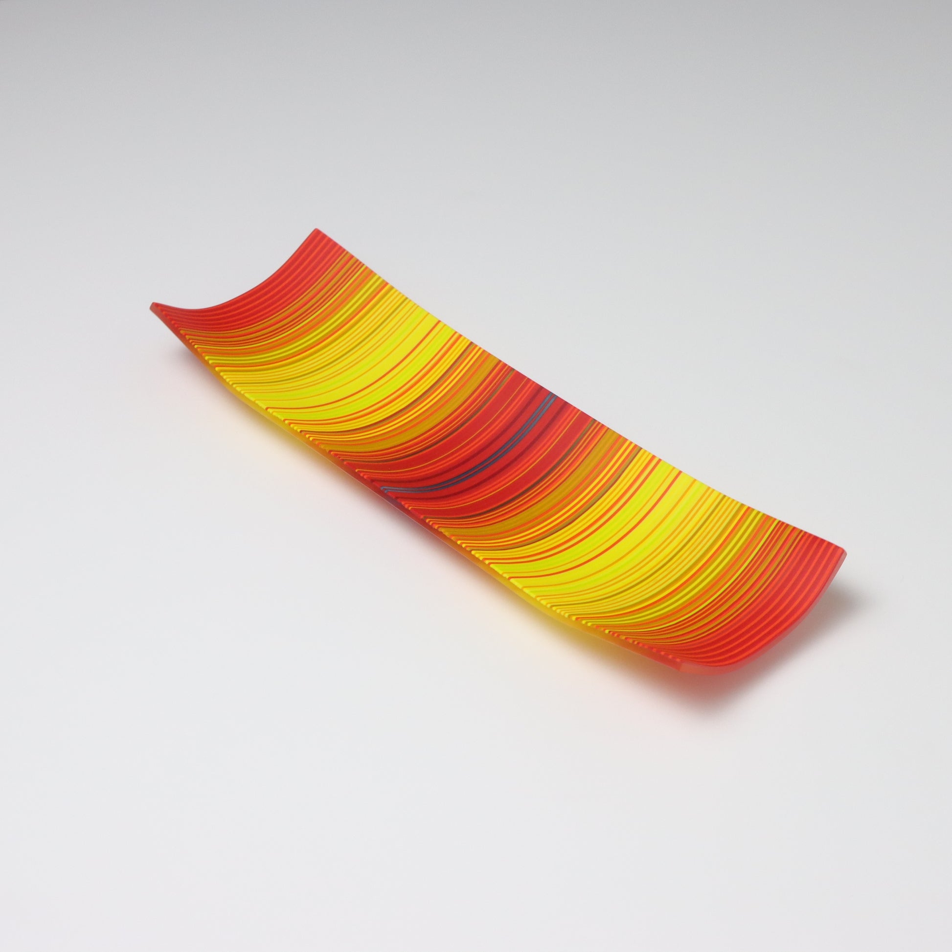 A true beacon of vibrancy, this rectangular ColourWave Glass fused glass plate radiates warmth, energy, and positivity. Waves of fiery red and golden yellow blend across its surface, leading into two strands of cooling blue in the centre. The striking gradient creates a visually dynamic display that lifts the mood of any room. With soft upward-curved edges, its modern shape makes a powerful statement of bold design. Whether used as a focal point in a living space or as a colourful contrast in a neutral setting, this piece brings unmistakable energy and contemporary style to any interior.