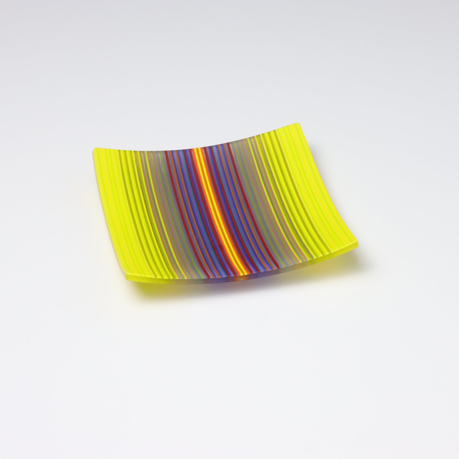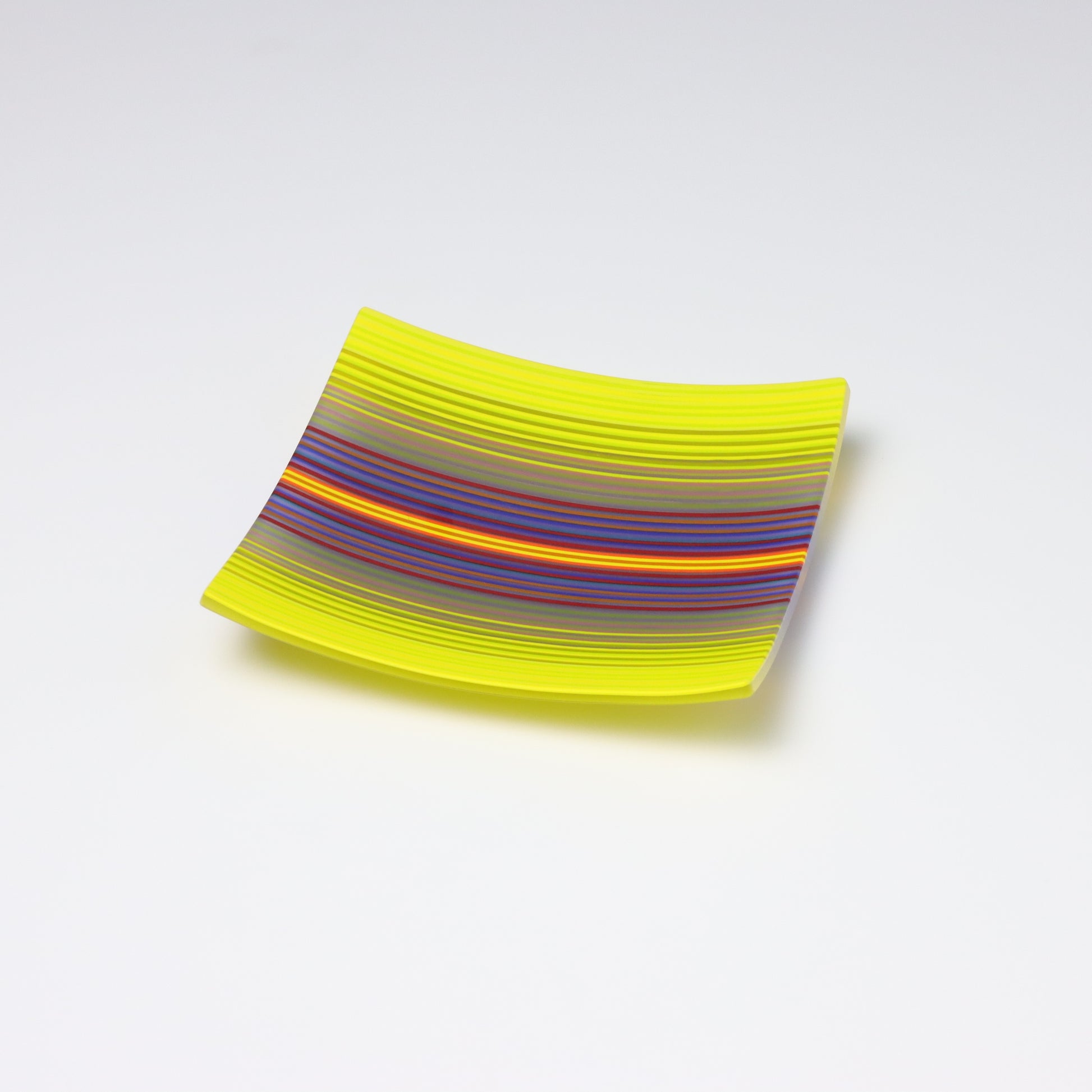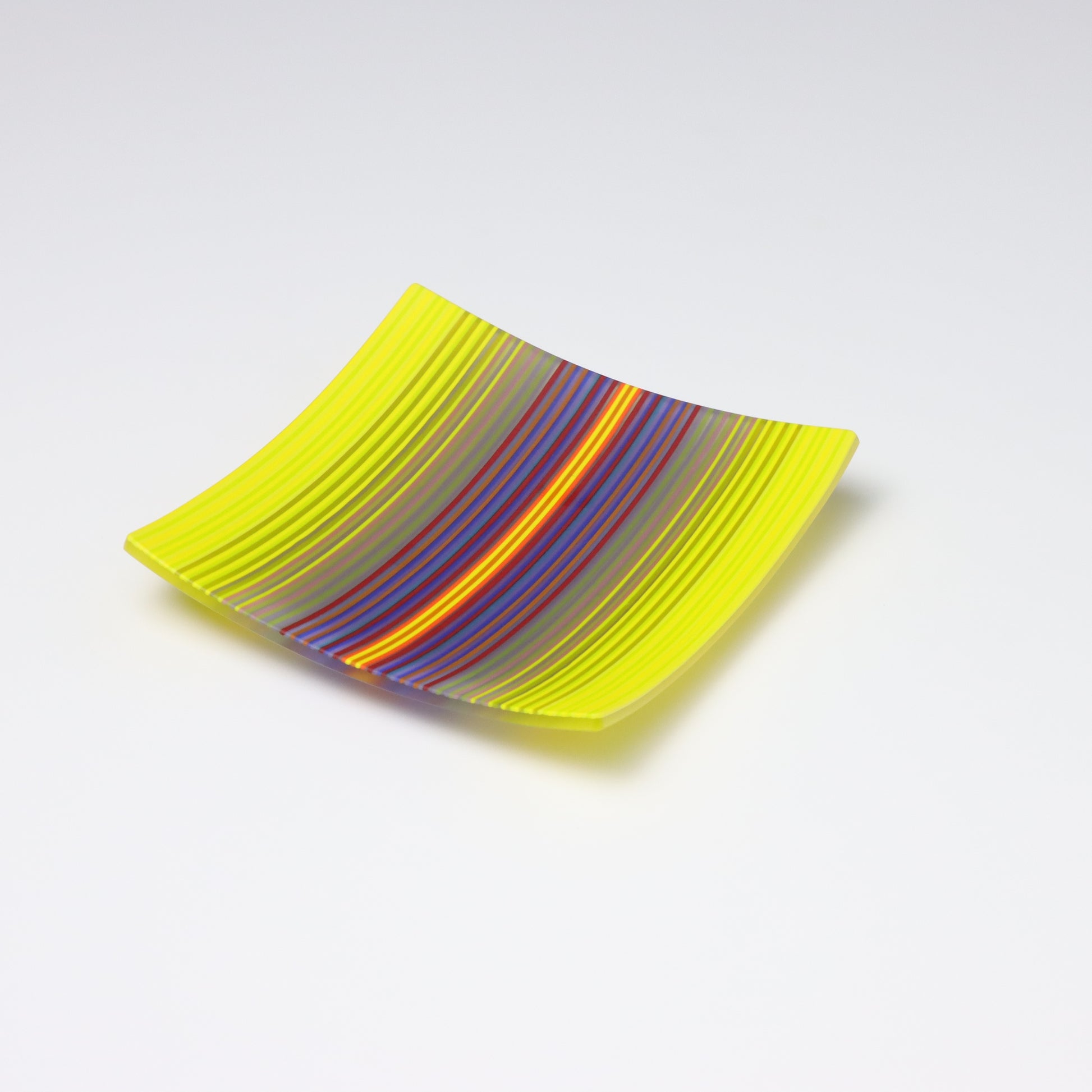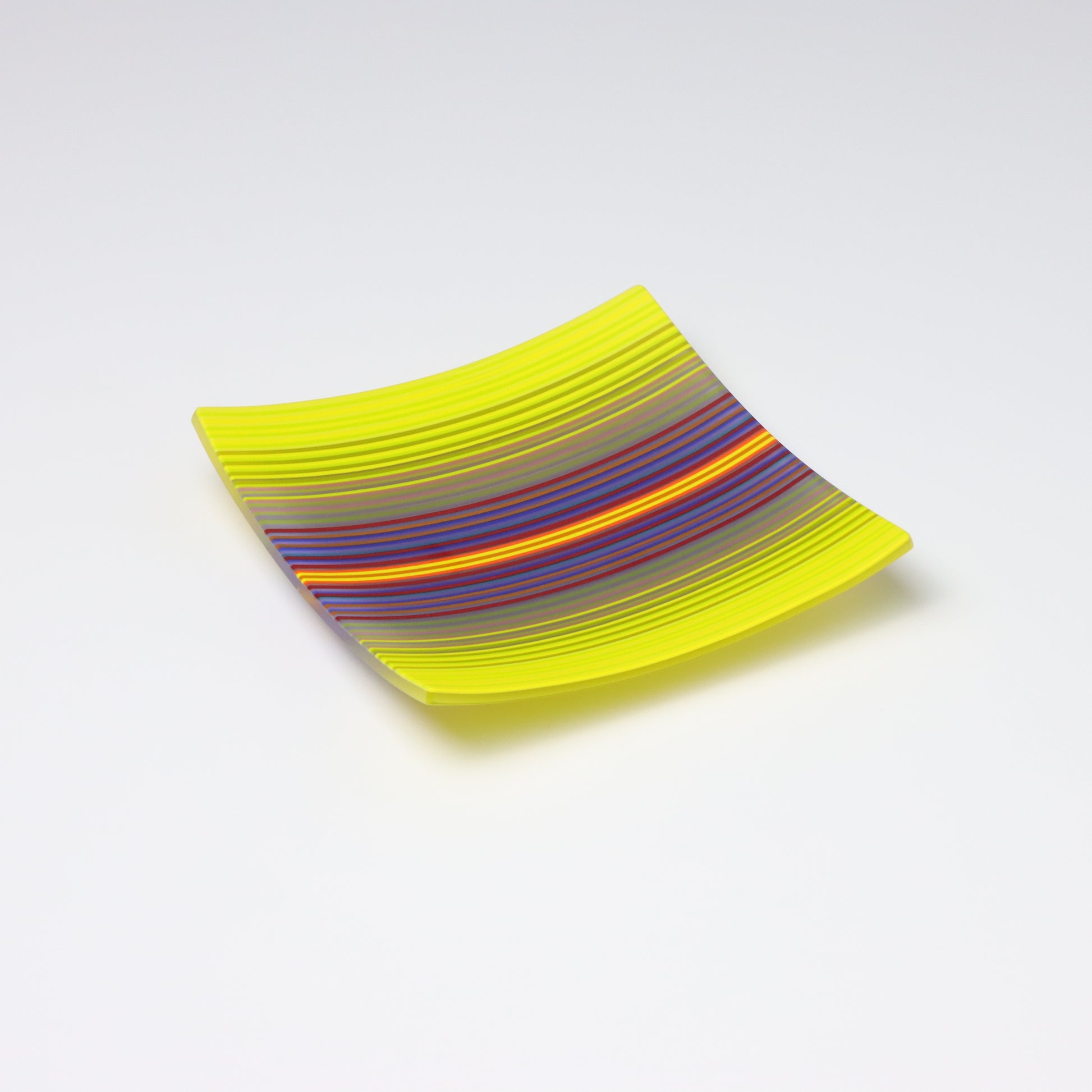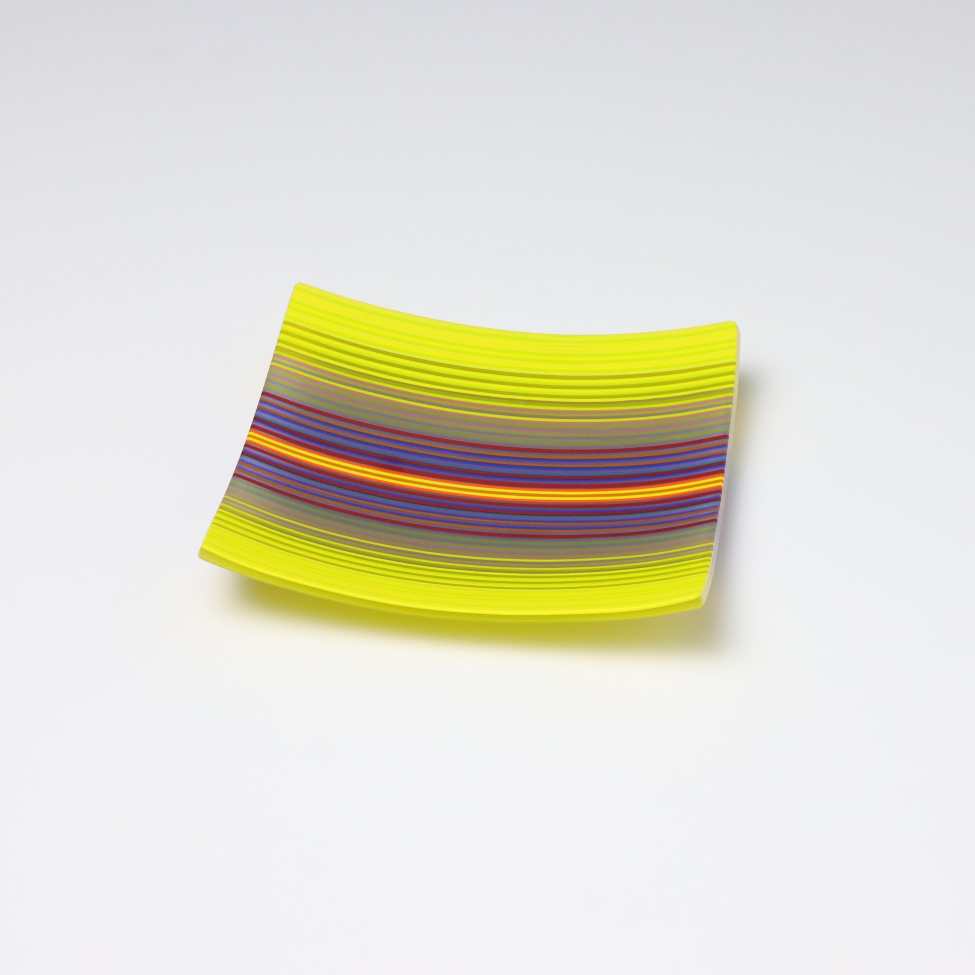 Designed for those looking for a bold statement piece, this square ColourWave Glass fused glass plate pairs vivid yellow waves with deep, powerful purples for maximum visual impact. A bright yellow centre anchors the piece, creating a striking focal point that demands attention. Its square form and smoothly curved-up corners give it a modern presence, while the unexpected colour pairing adds a jolt of creativity and visual energy. Perfect for making a confident design statement, whether displayed on a table, shelf, or wall-mounted stand.