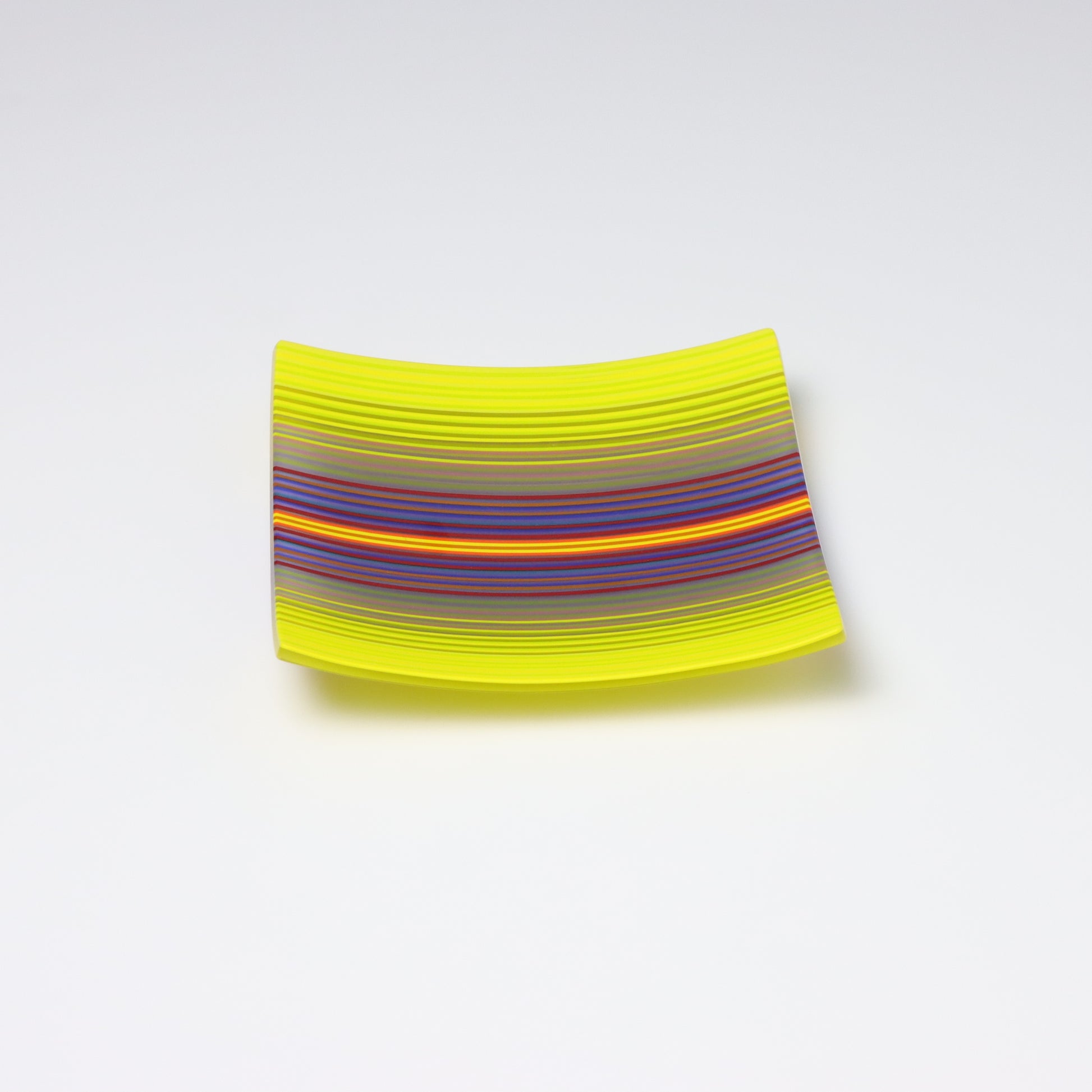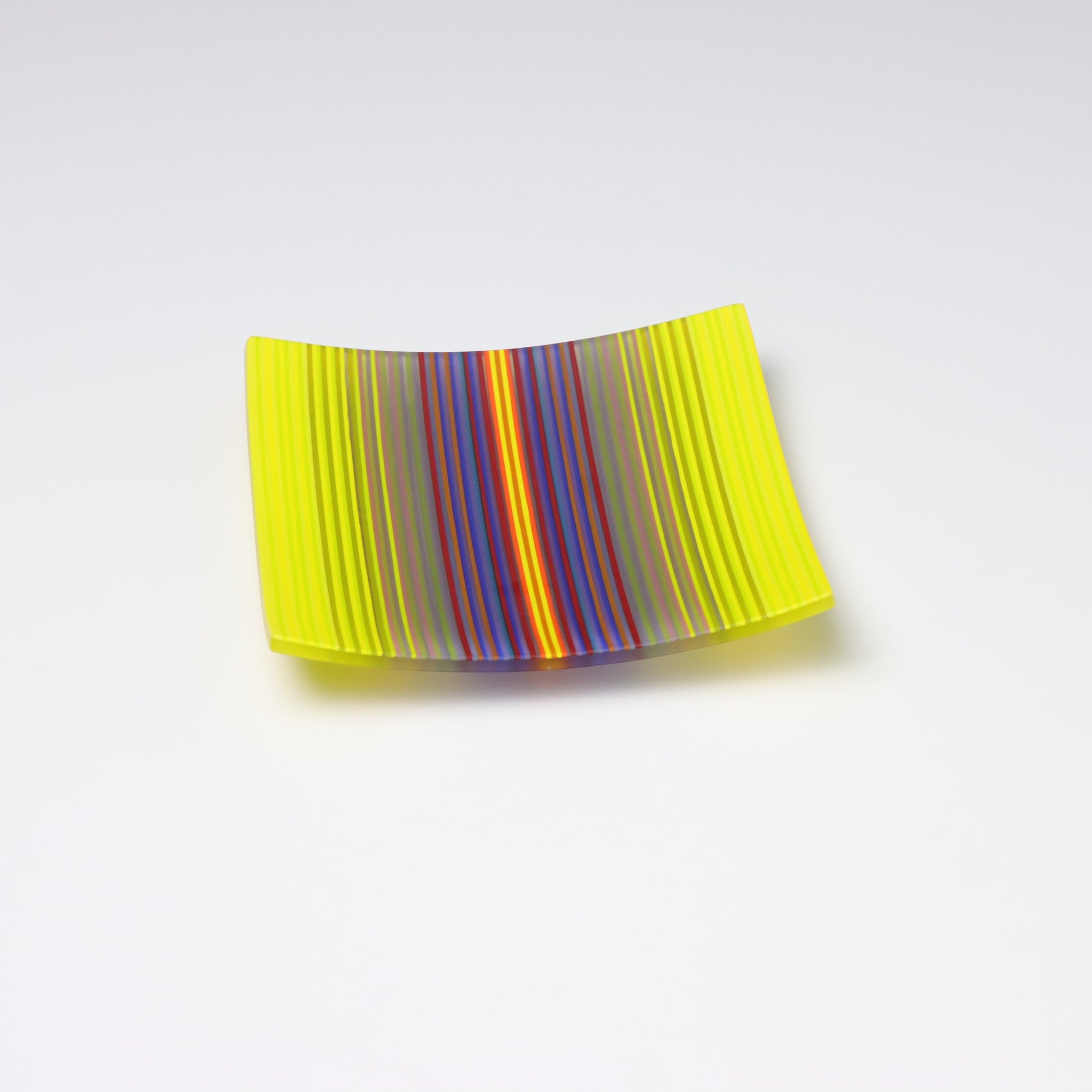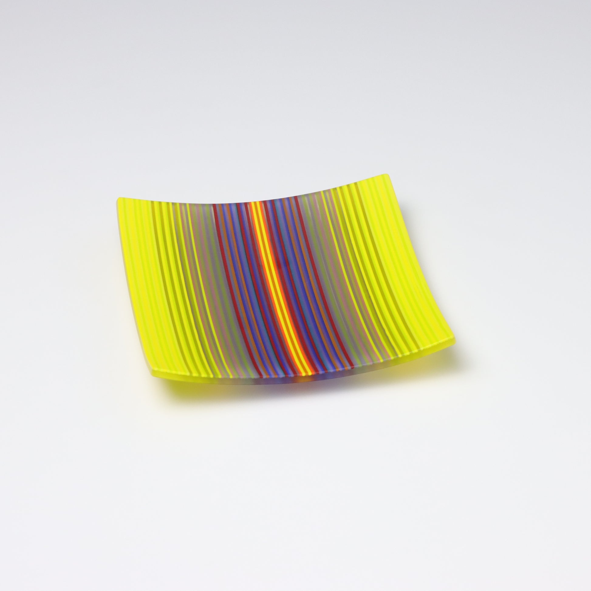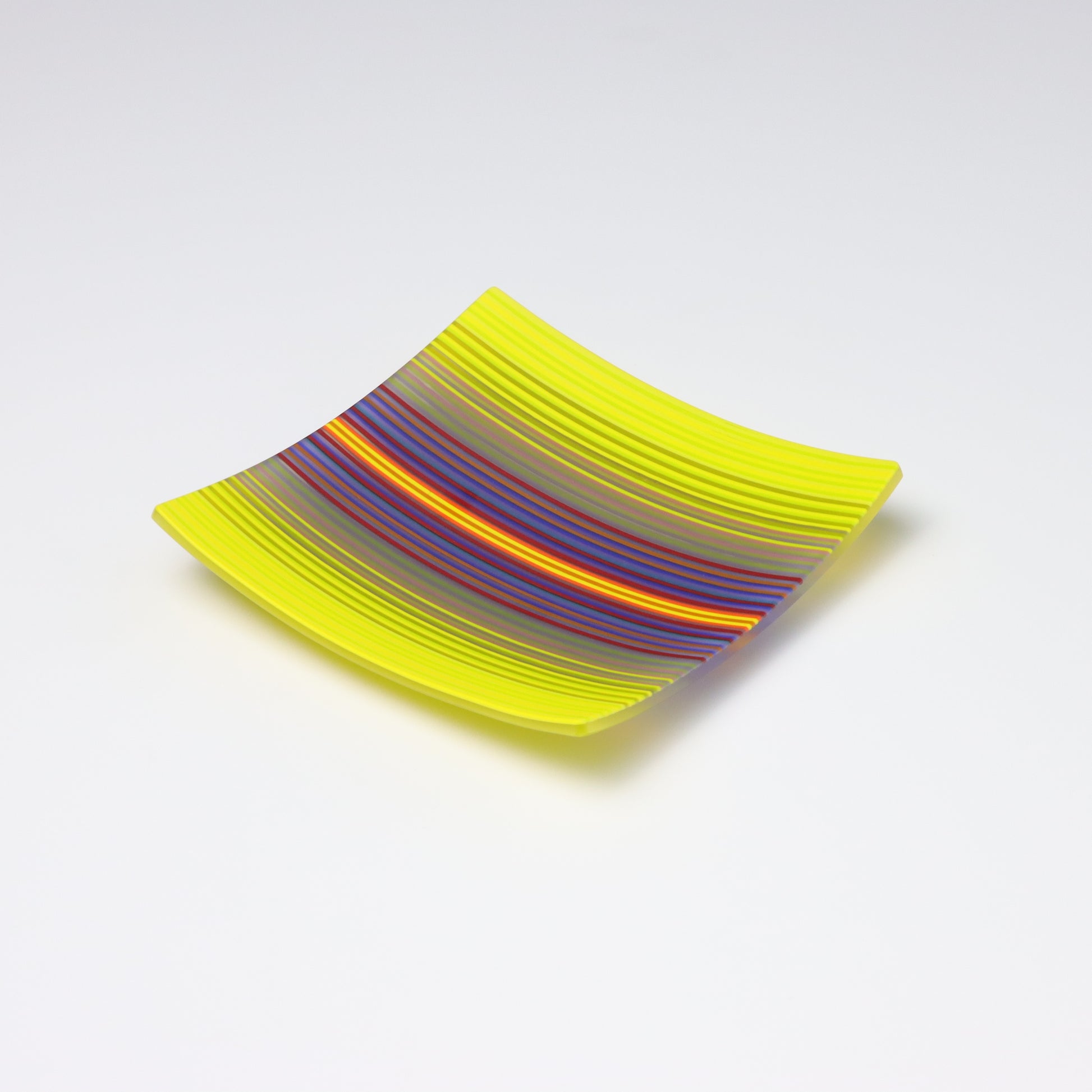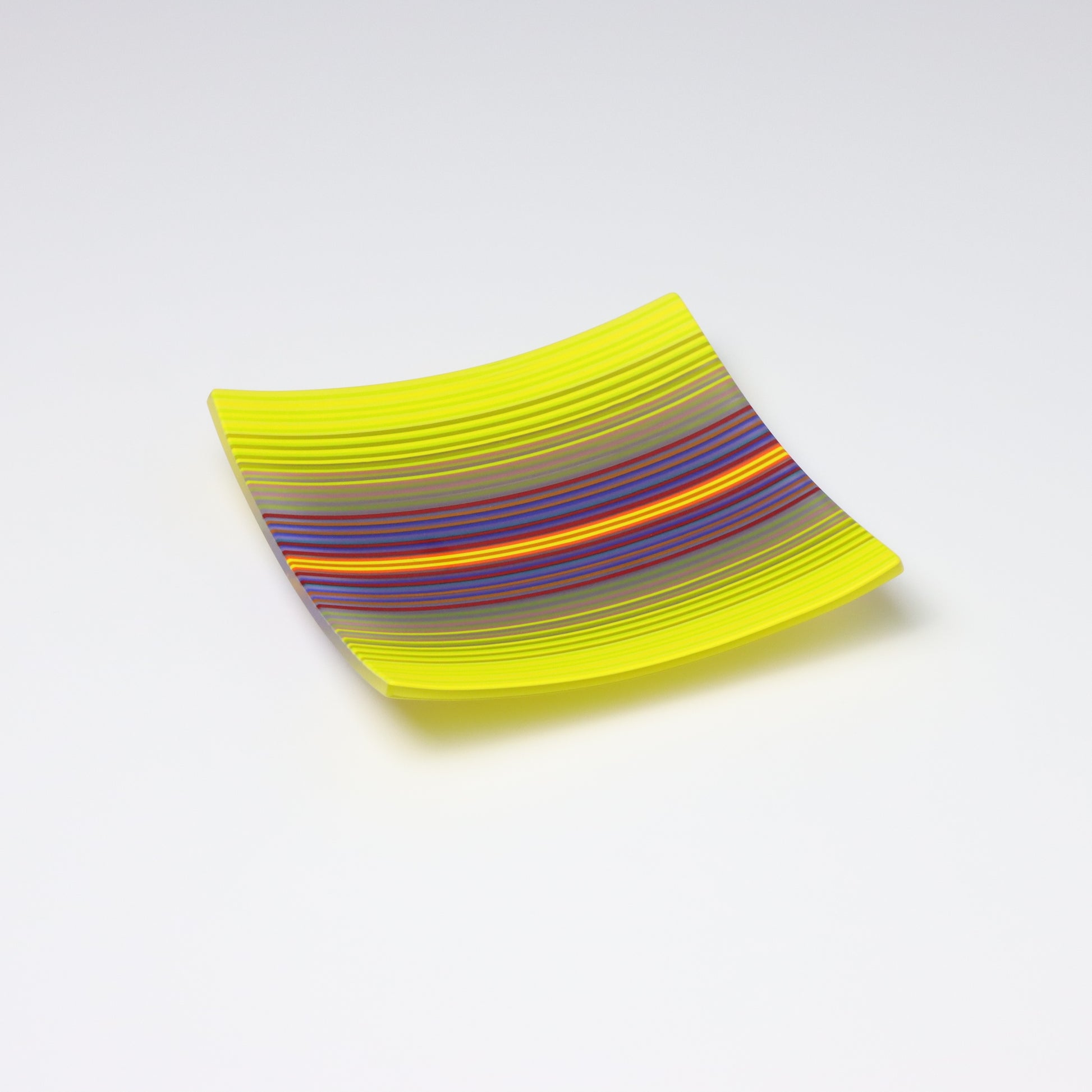 Designed for those looking for a bold statement piece, this square ColourWave Glass fused glass plate pairs vivid yellow waves with deep, powerful purples for maximum visual impact. A bright yellow centre anchors the piece, creating a striking focal point that demands attention. Its square form and smoothly curved-up corners give it a modern presence, while the unexpected colour pairing adds a jolt of creativity and visual energy. Perfect for making a confident design statement, whether displayed on a table, shelf, or wall-mounted stand.