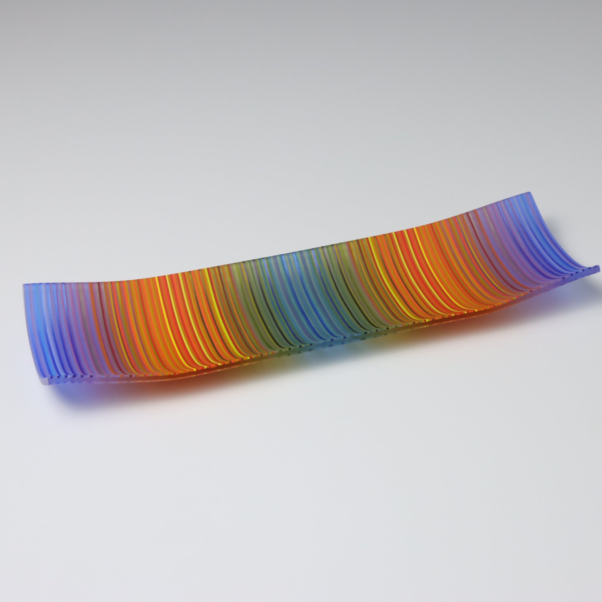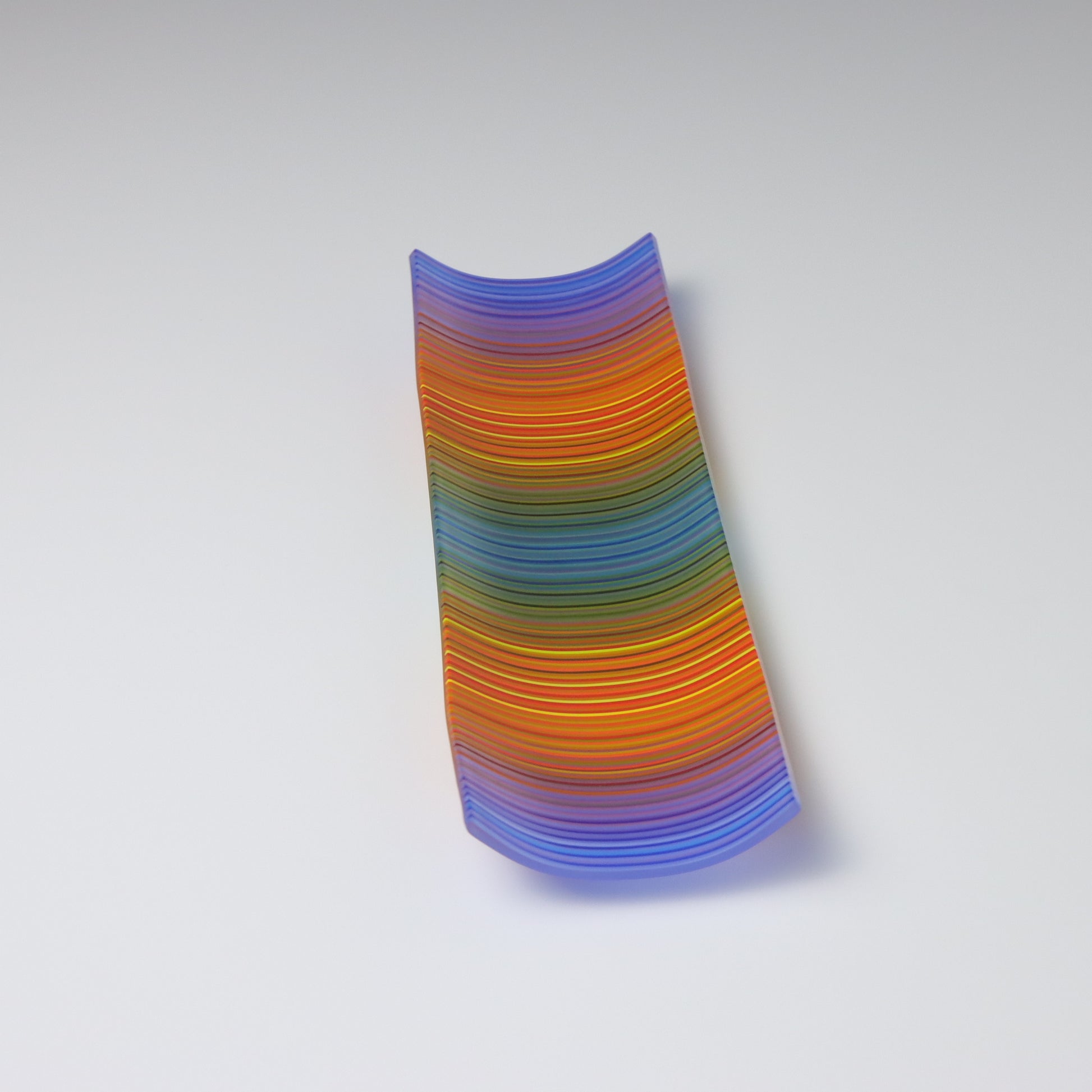 This ColourWave Glass fused glass plate features a stunning mix of cool blues and vibrant teal, contrasted by energetic orange waves, with subtle hints of other colours visible up close to add intrigue. The balanced composition creates a harmonious, eye-catching design, with a contemporary rectangular shape and gently curved edges that bring a modern touch to any space. Whether enhancing a neutral room or complementing a bold décor scheme, this piece adds warmth, creativity, and a confident design statement to your interior.