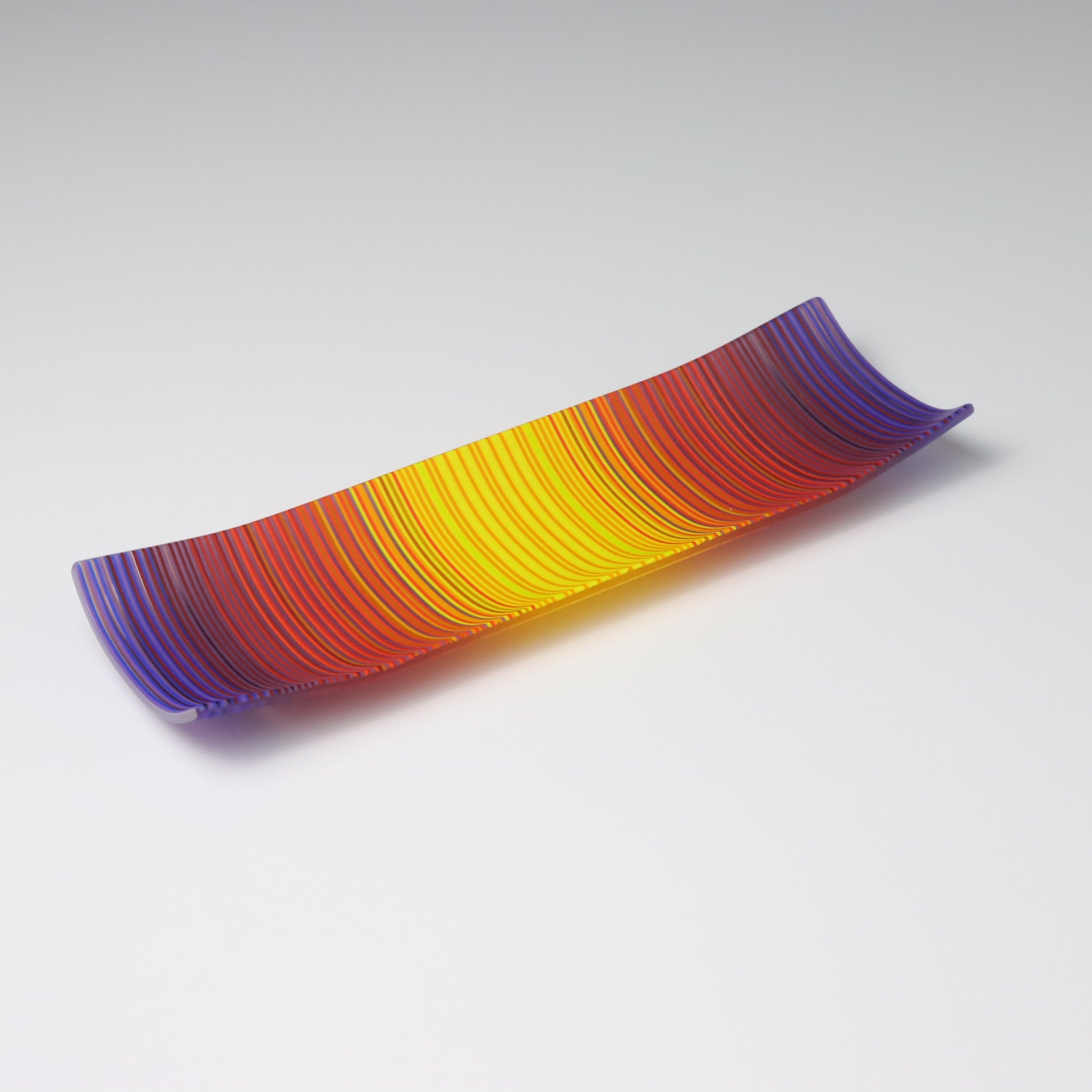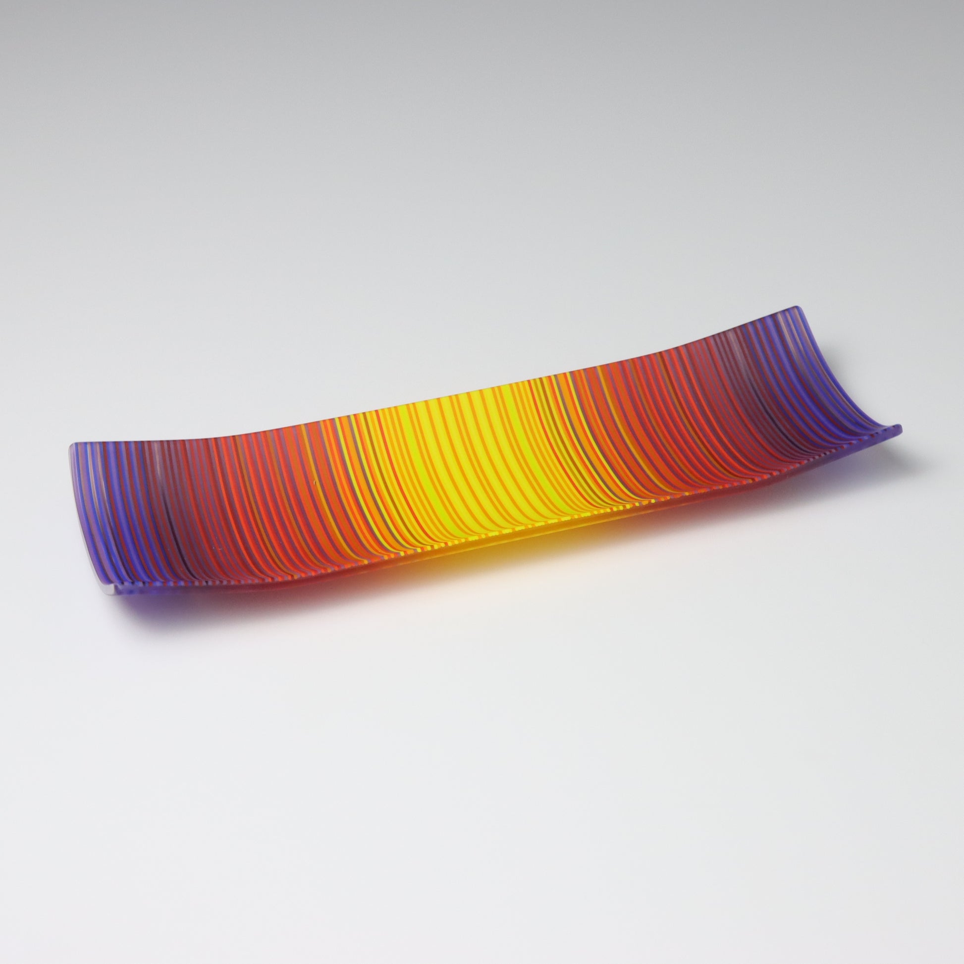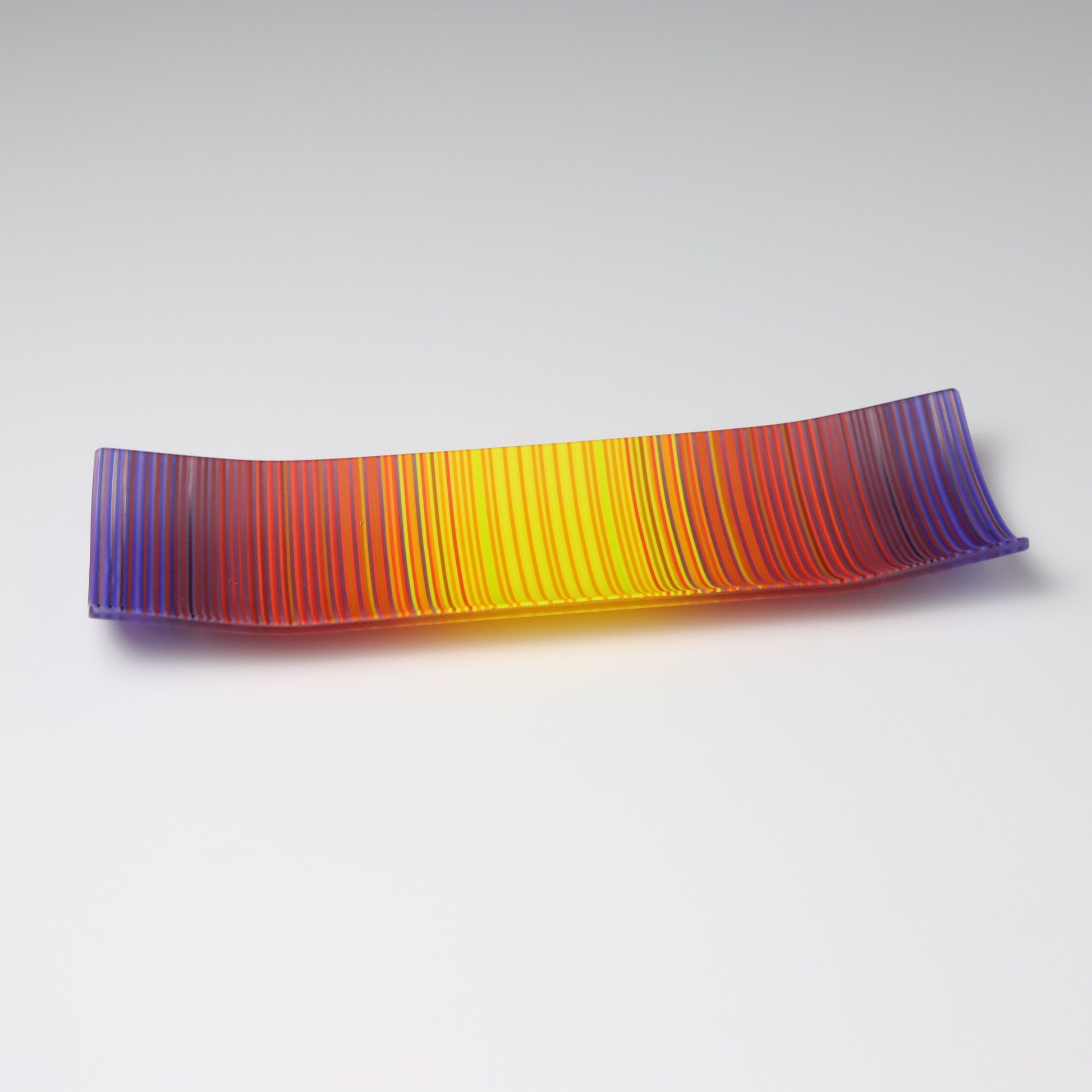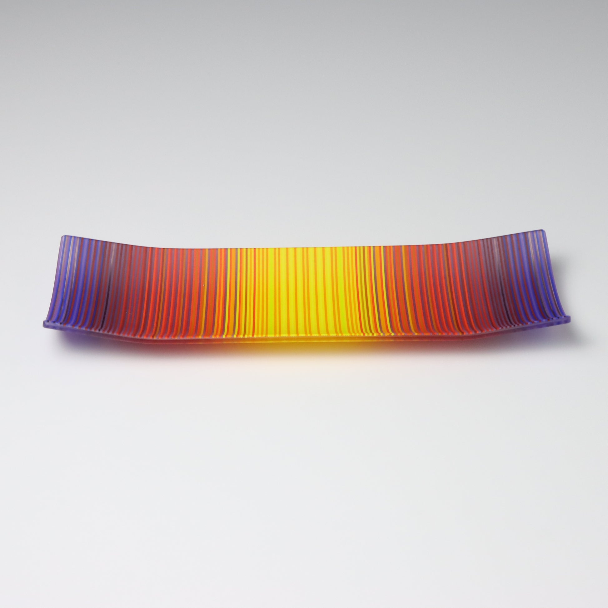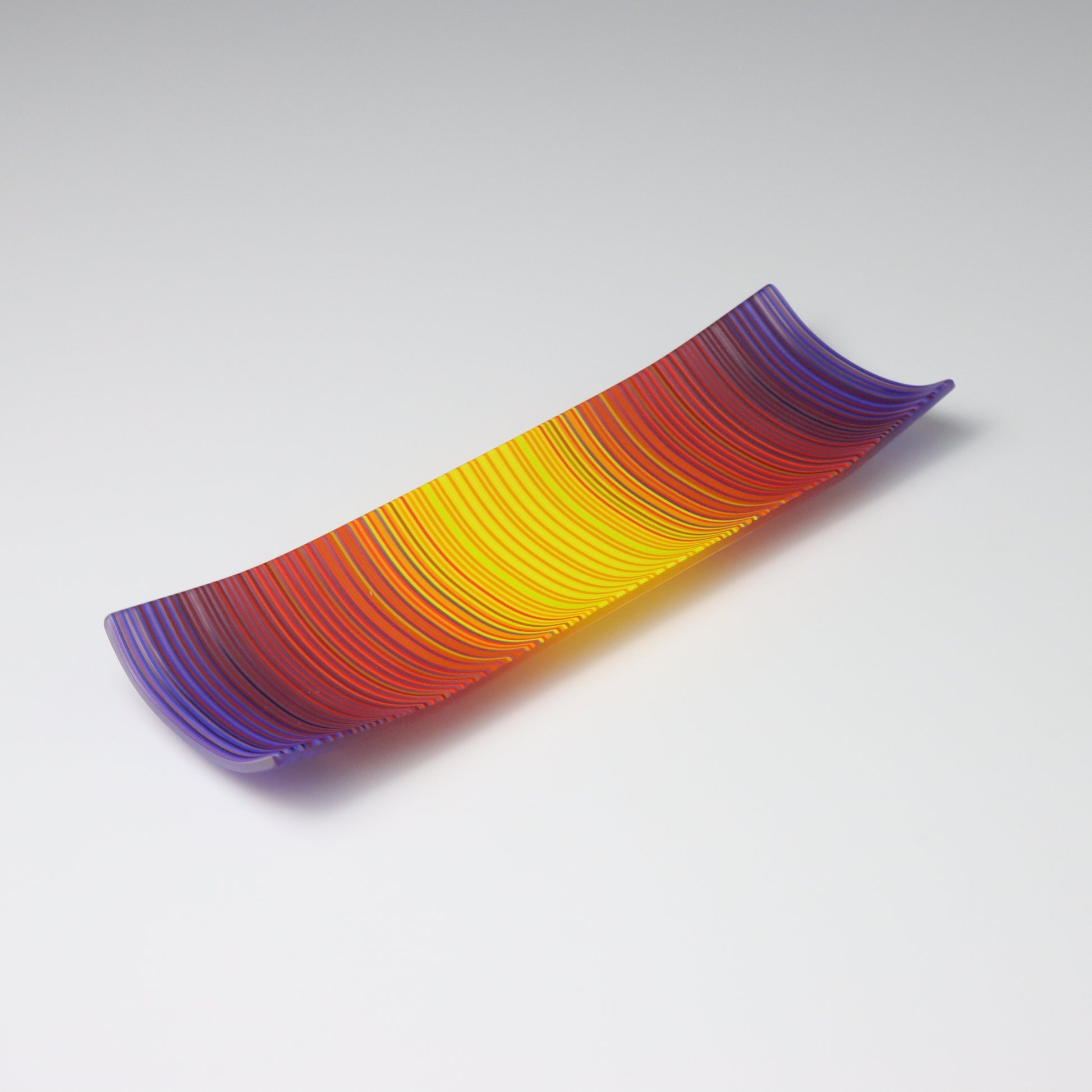 Deep purples, fiery reds, and glowing yellows come together in a powerful sequence that recalls the warmth and movement of a setting sun. The colours flow with intensity and rhythm, creating a piece that feels alive with energy. The rectangular form and softly curved edges give it a modern balance, letting the colour lead the conversation.