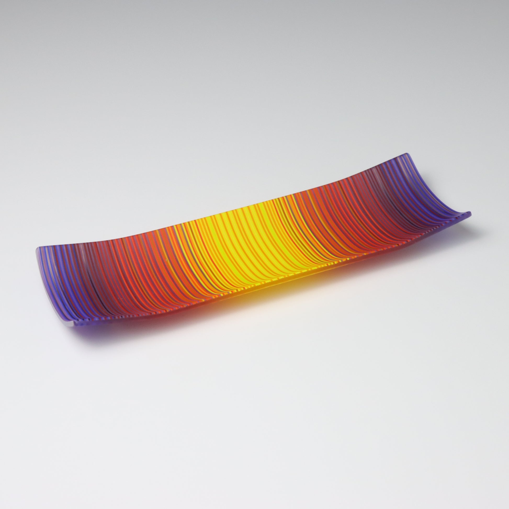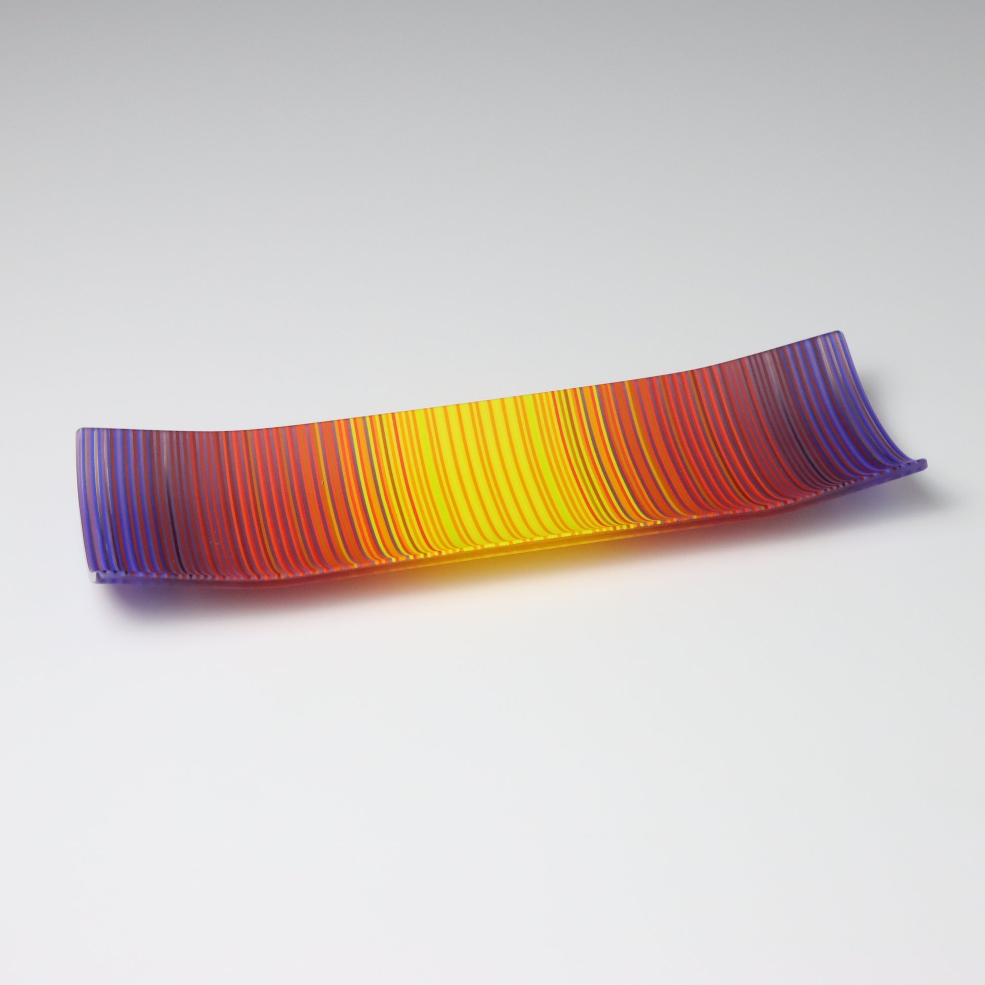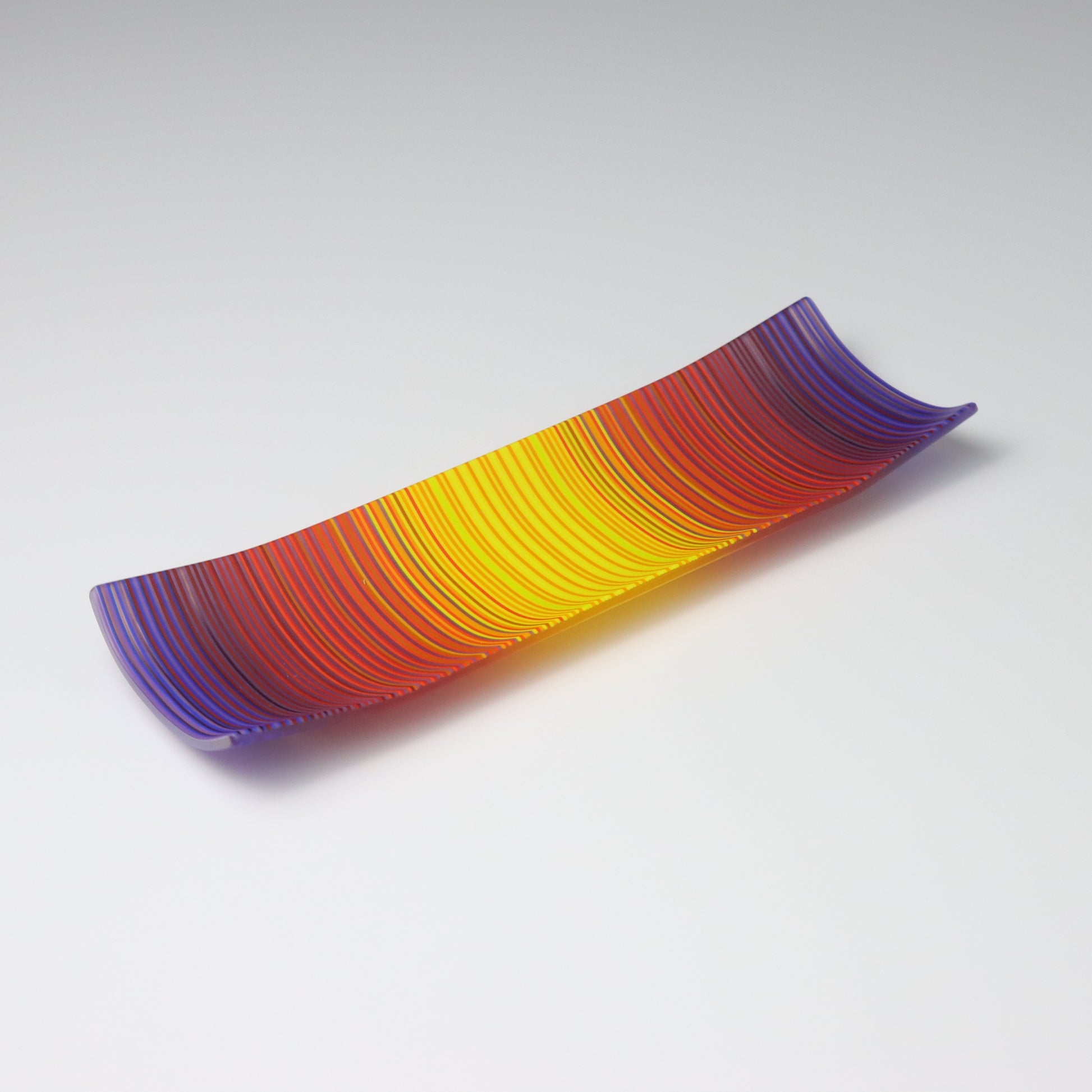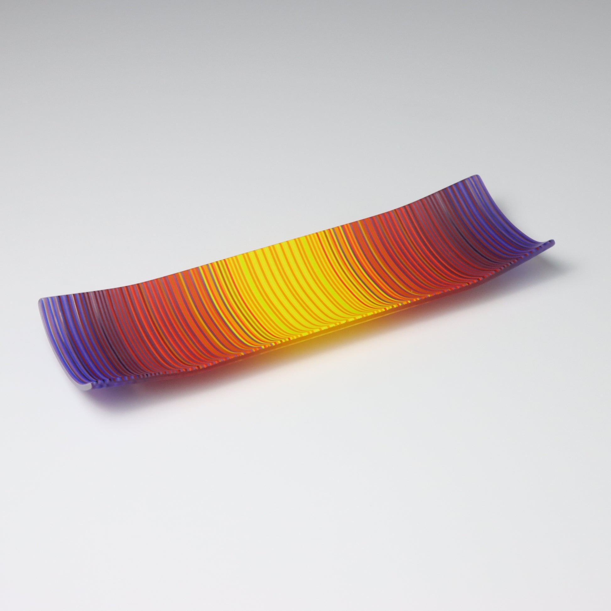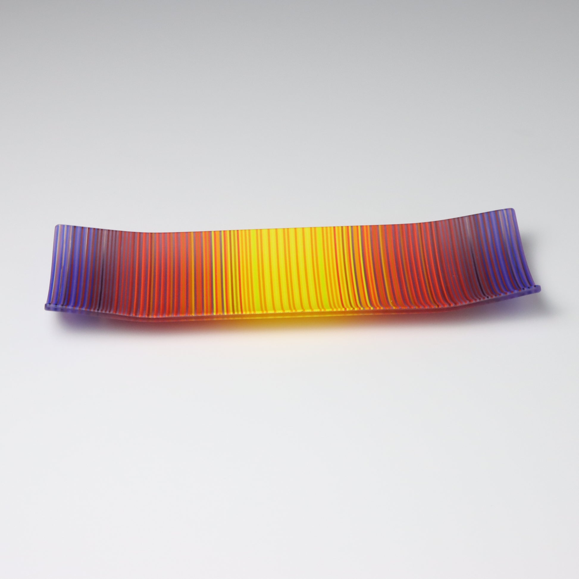 Deep purples, fiery reds, and glowing yellows come together in a powerful sequence that recalls the warmth and movement of a setting sun. The colours flow with intensity and rhythm, creating a piece that feels alive with energy. The rectangular form and softly curved edges give it a modern balance, letting the colour lead the conversation.
