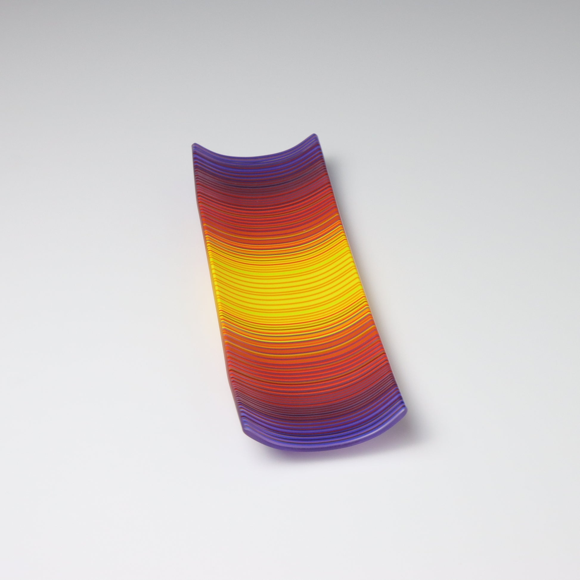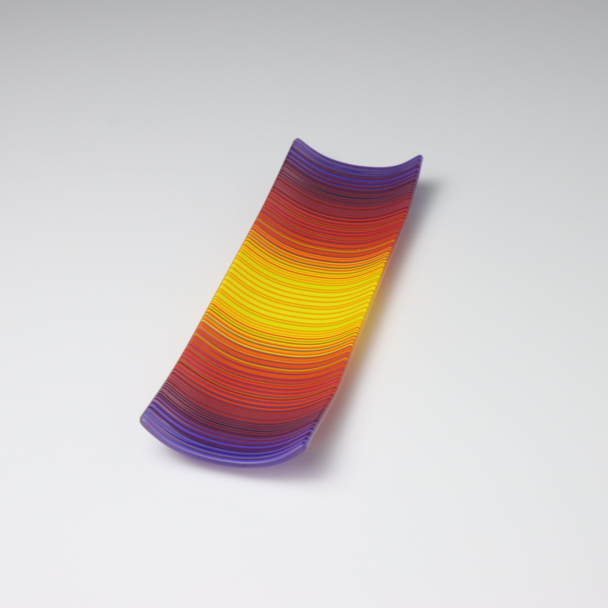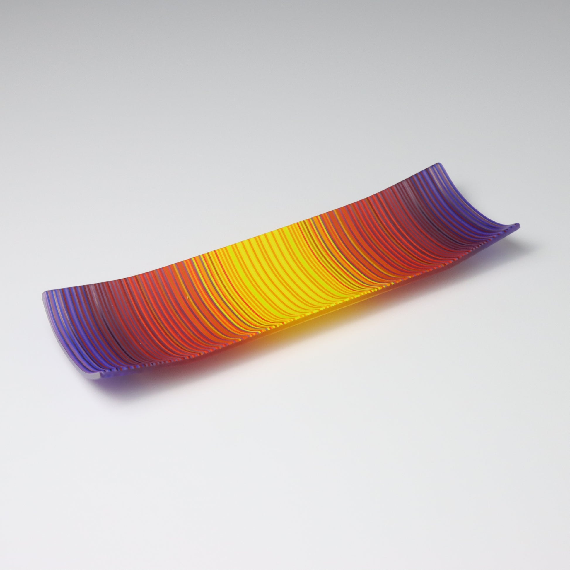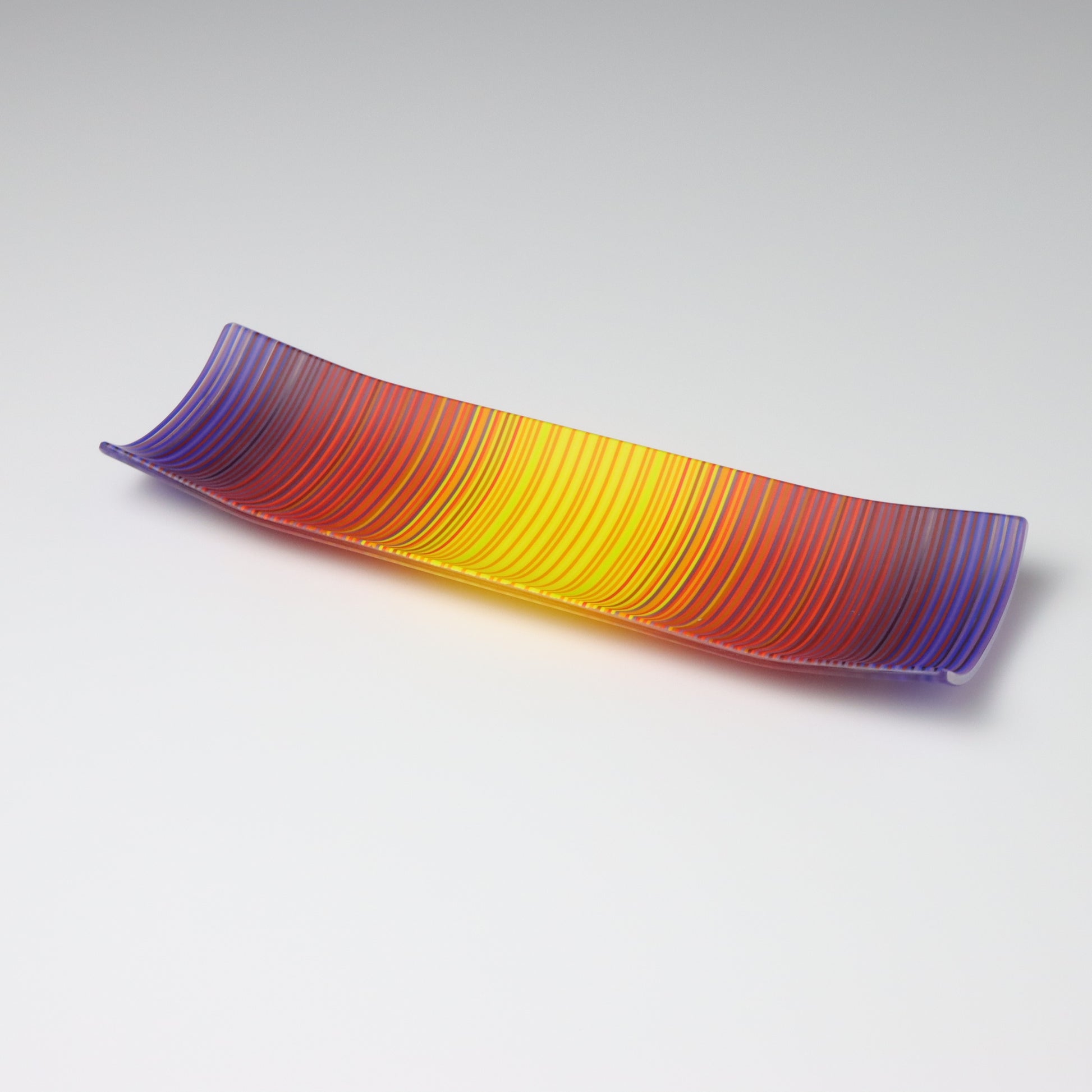 Deep purples, fiery reds, and glowing yellows come together in a powerful sequence that recalls the warmth and movement of a setting sun. The colours flow with intensity and rhythm, creating a piece that feels alive with energy. The rectangular form and softly curved edges give it a modern balance, letting the colour lead the conversation.