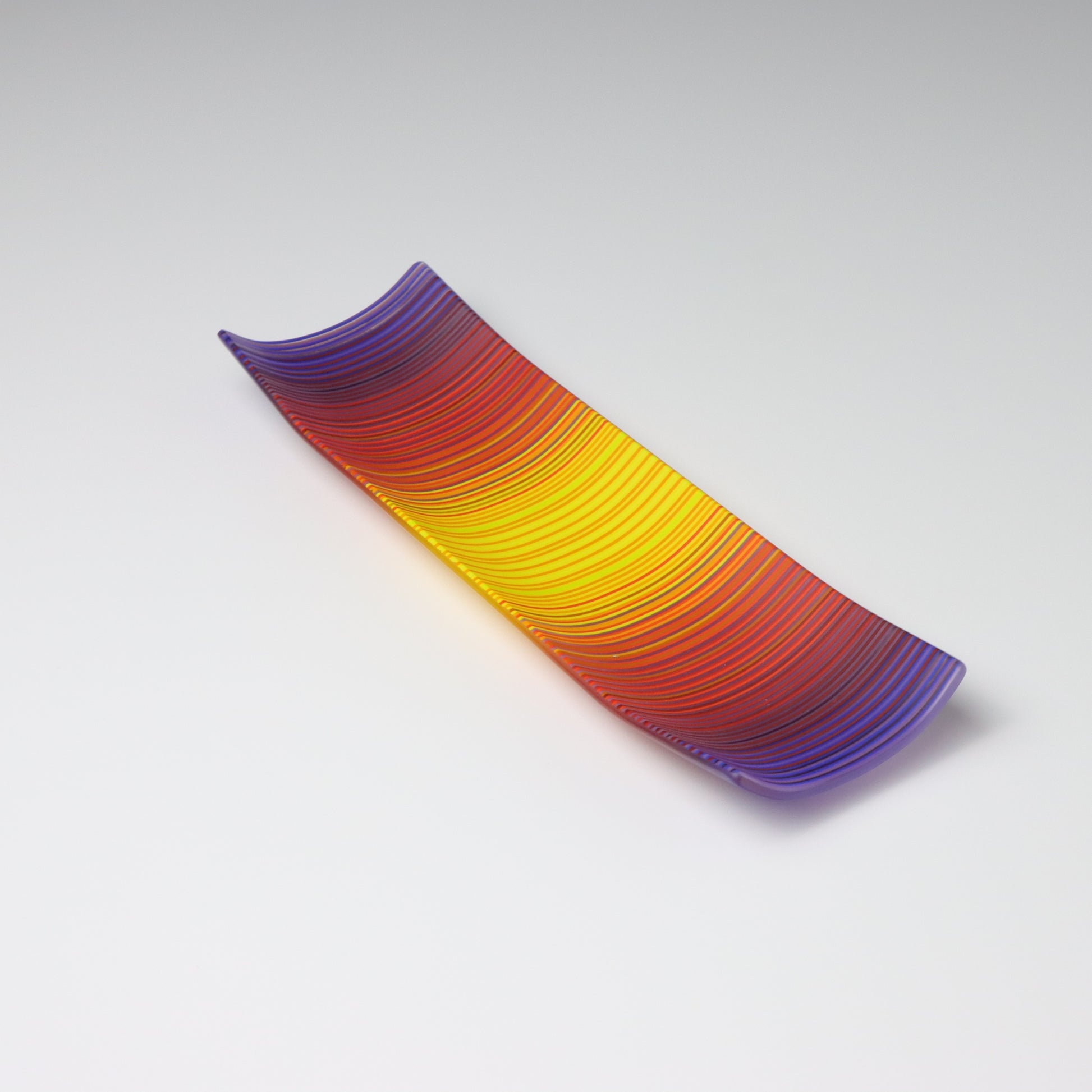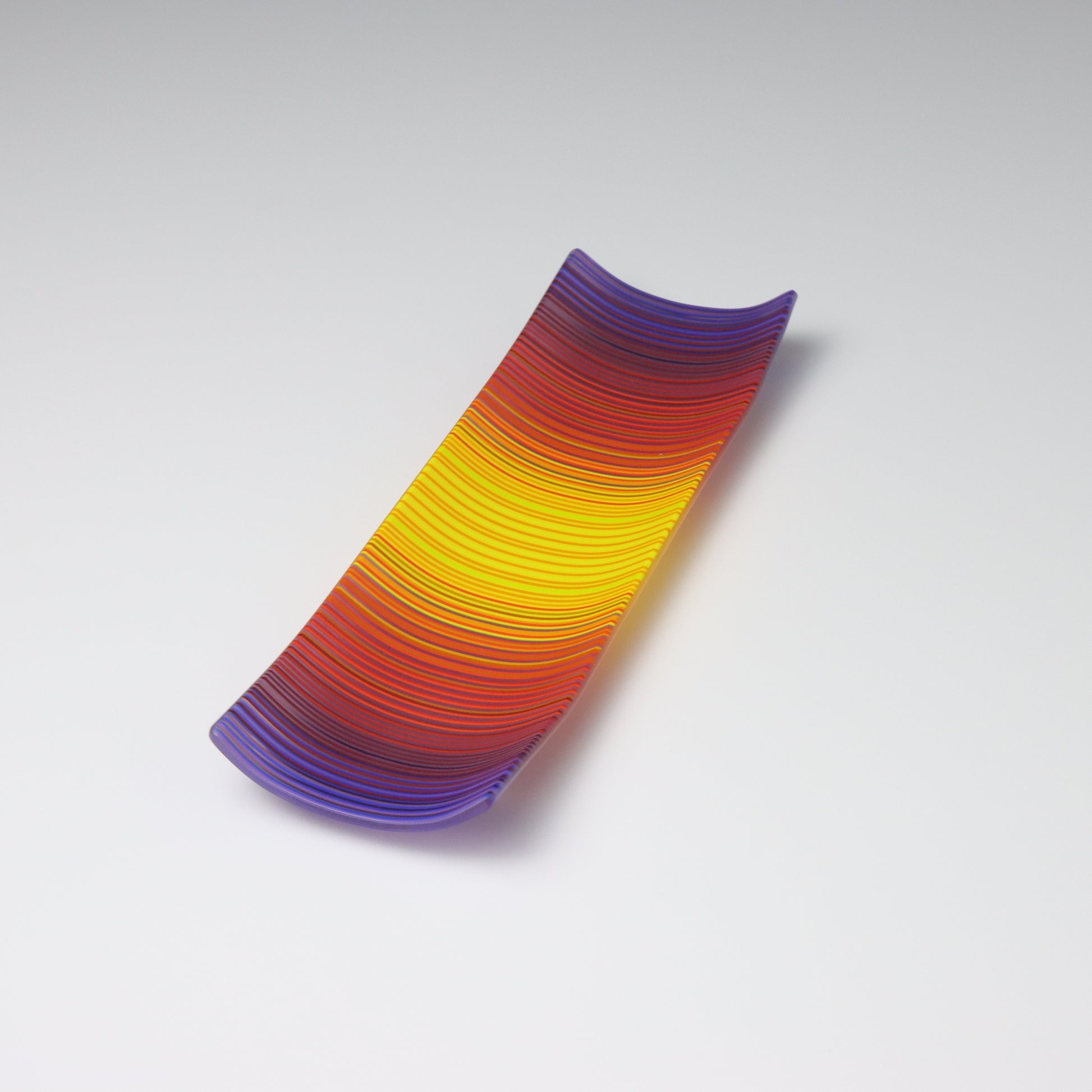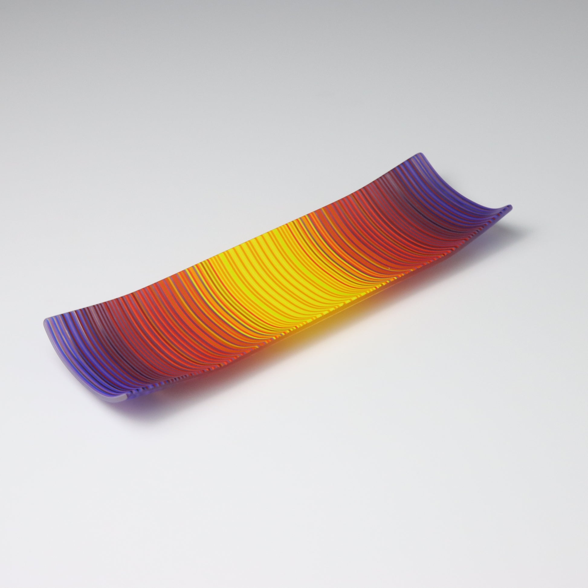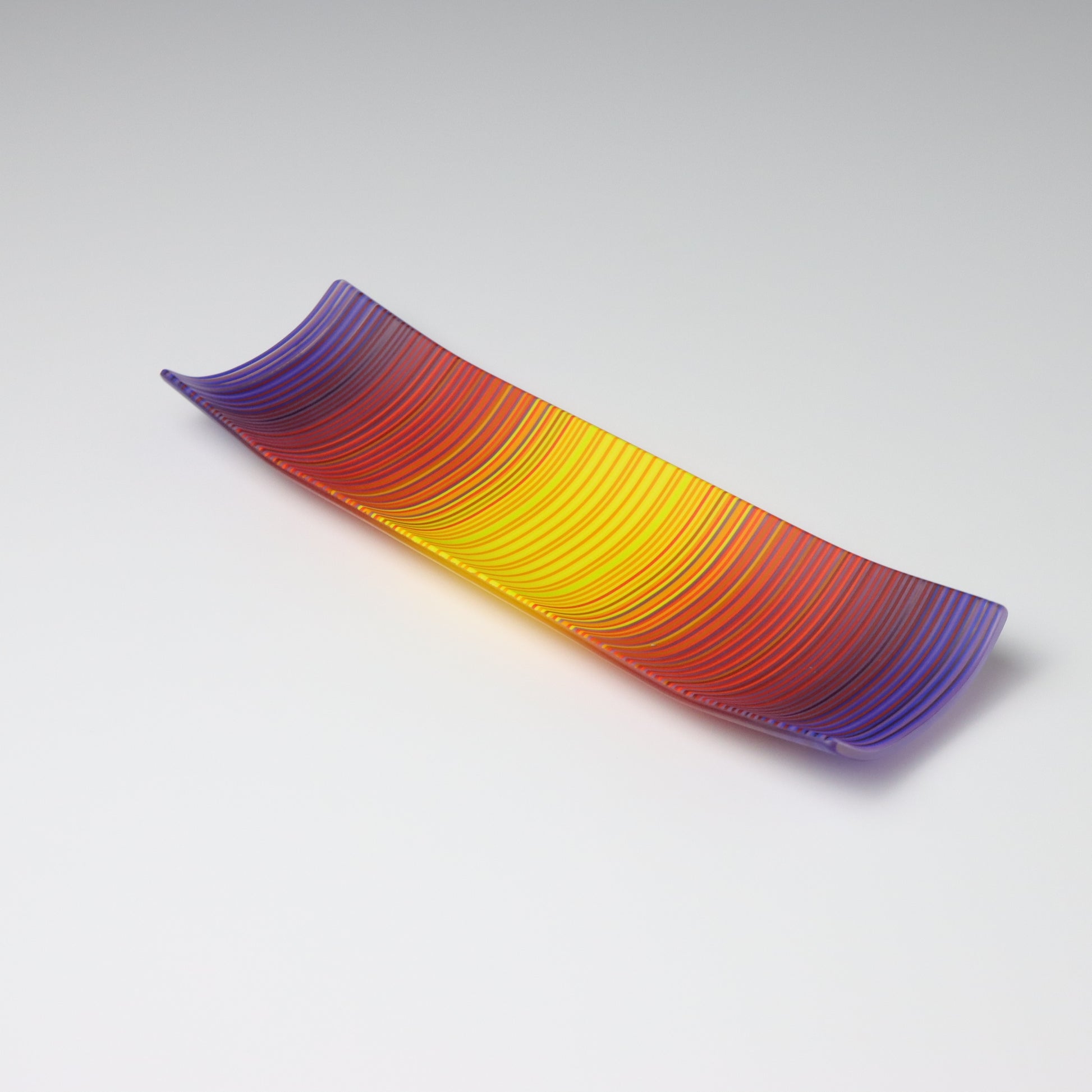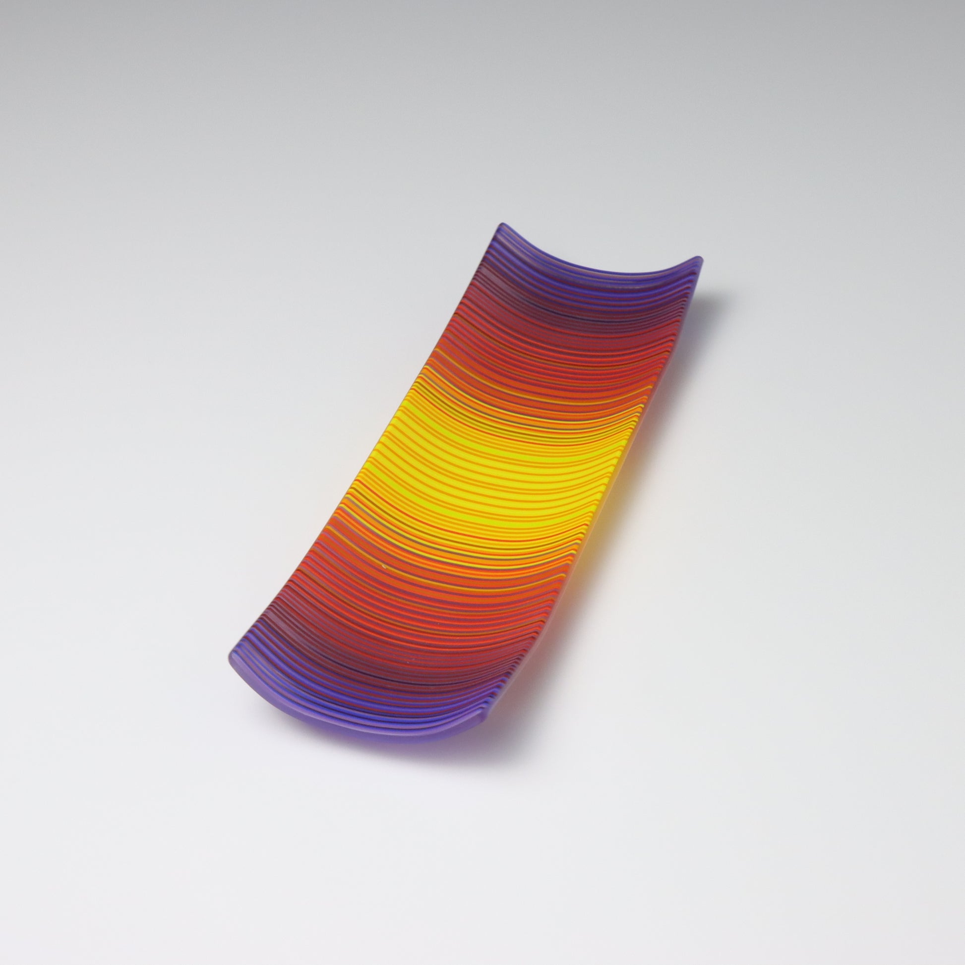 Deep purples, fiery reds, and glowing yellows come together in a powerful sequence that recalls the warmth and movement of a setting sun. The colours flow with intensity and rhythm, creating a piece that feels alive with energy. The rectangular form and softly curved edges give it a modern balance, letting the colour lead the conversation.