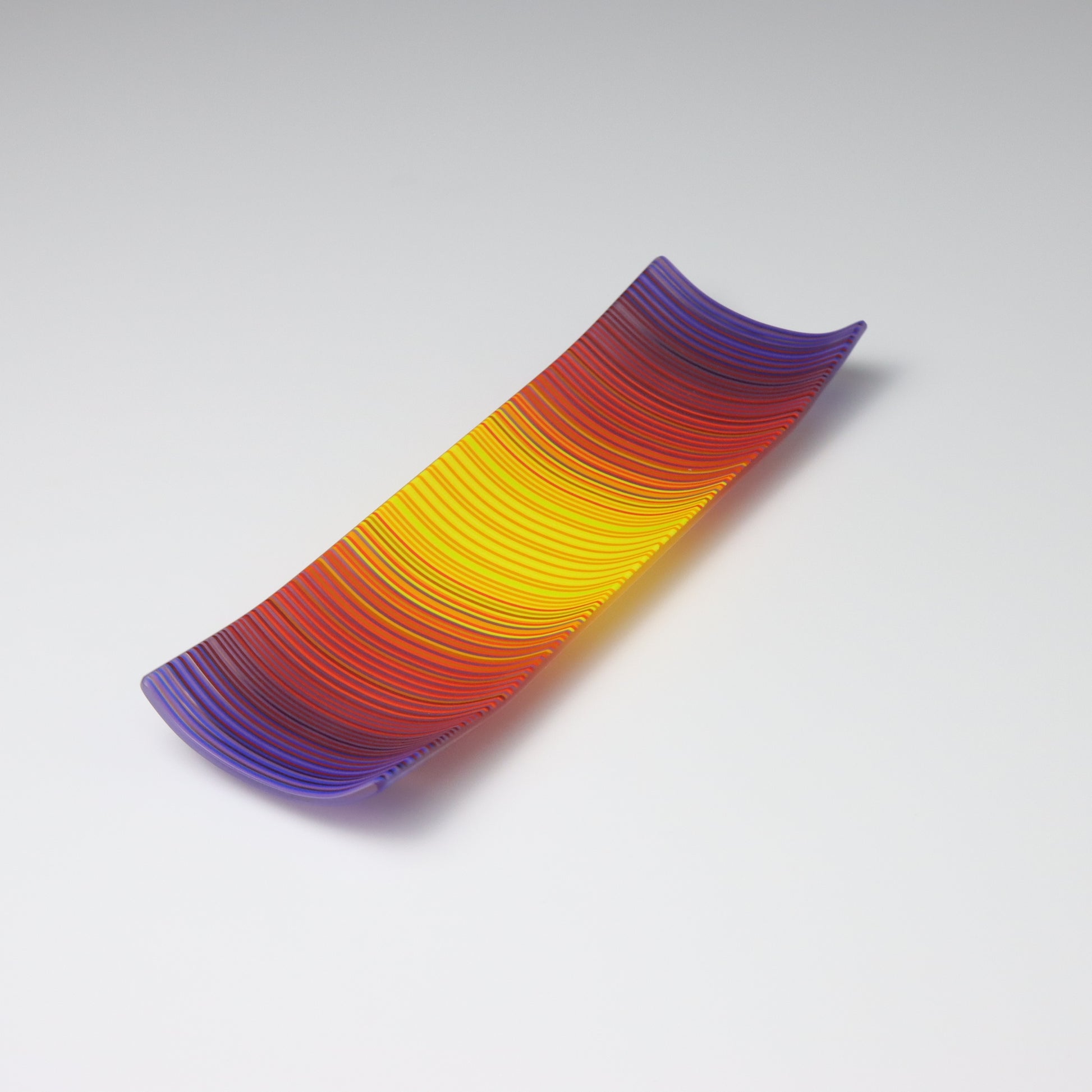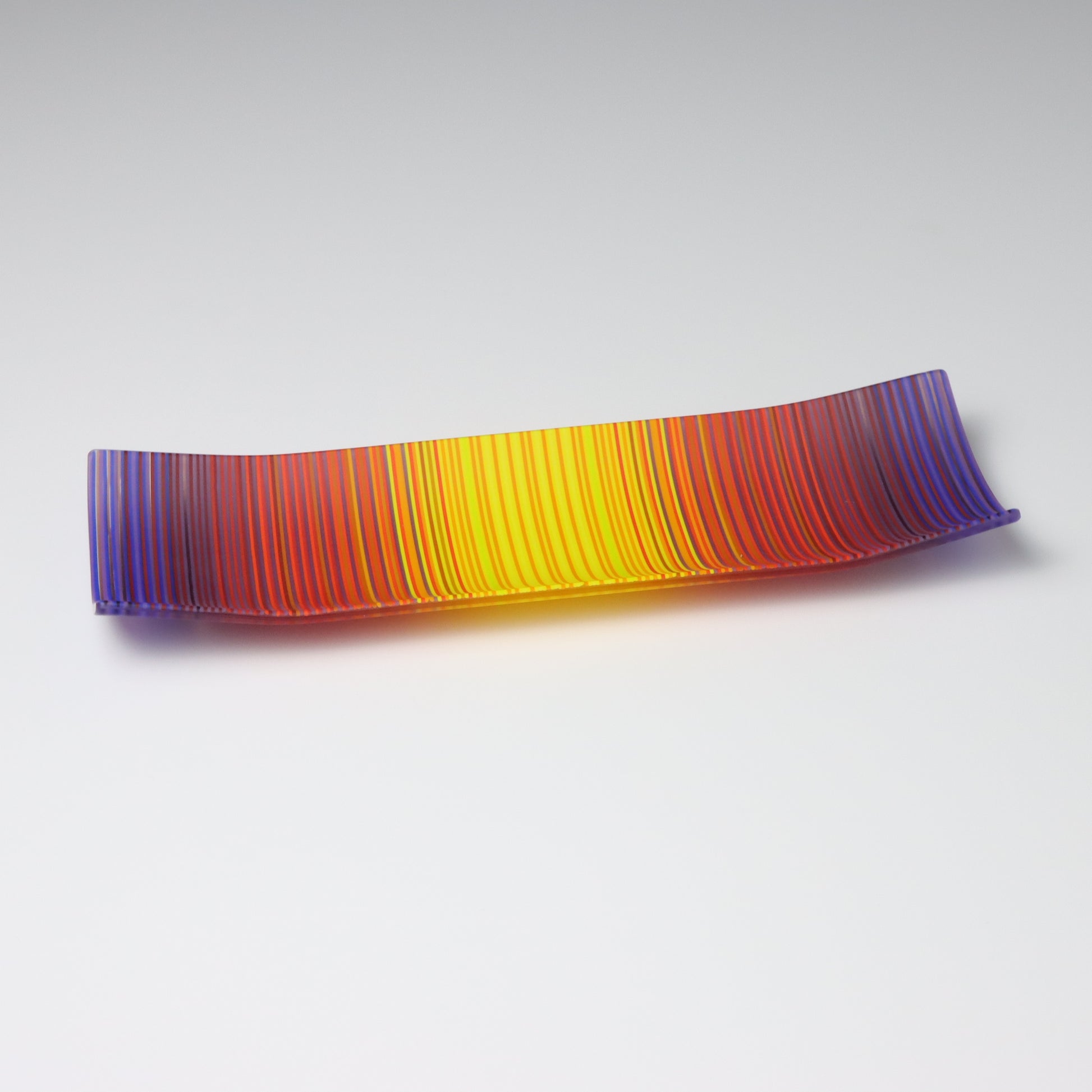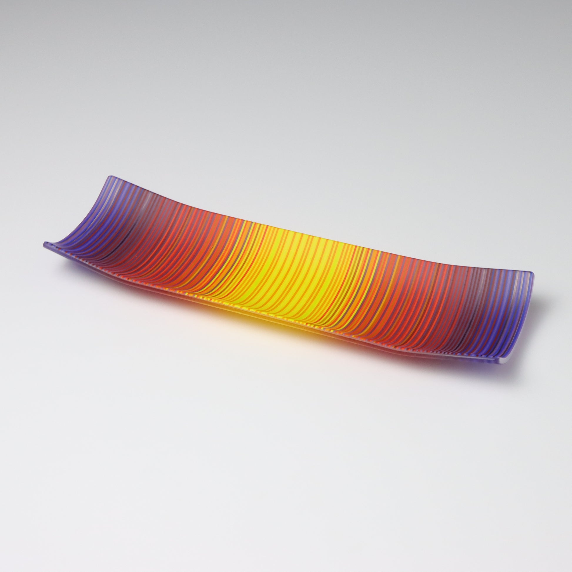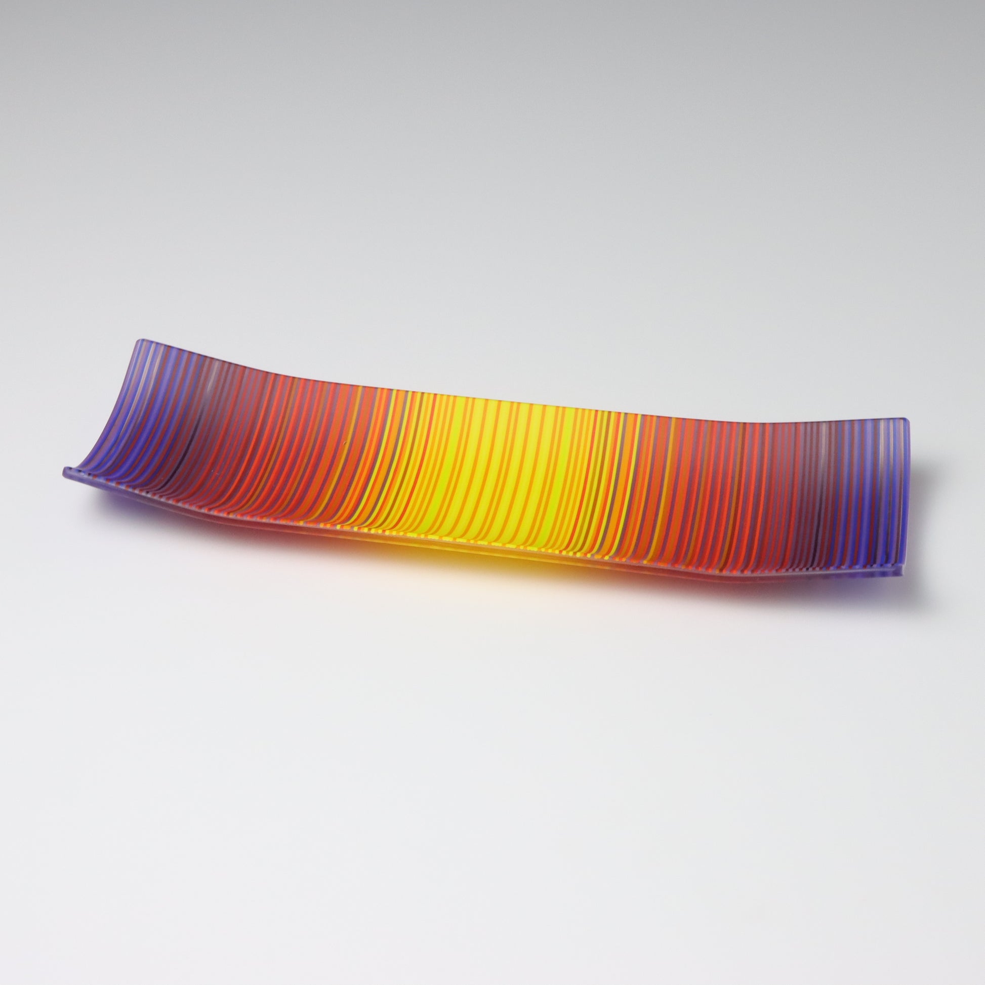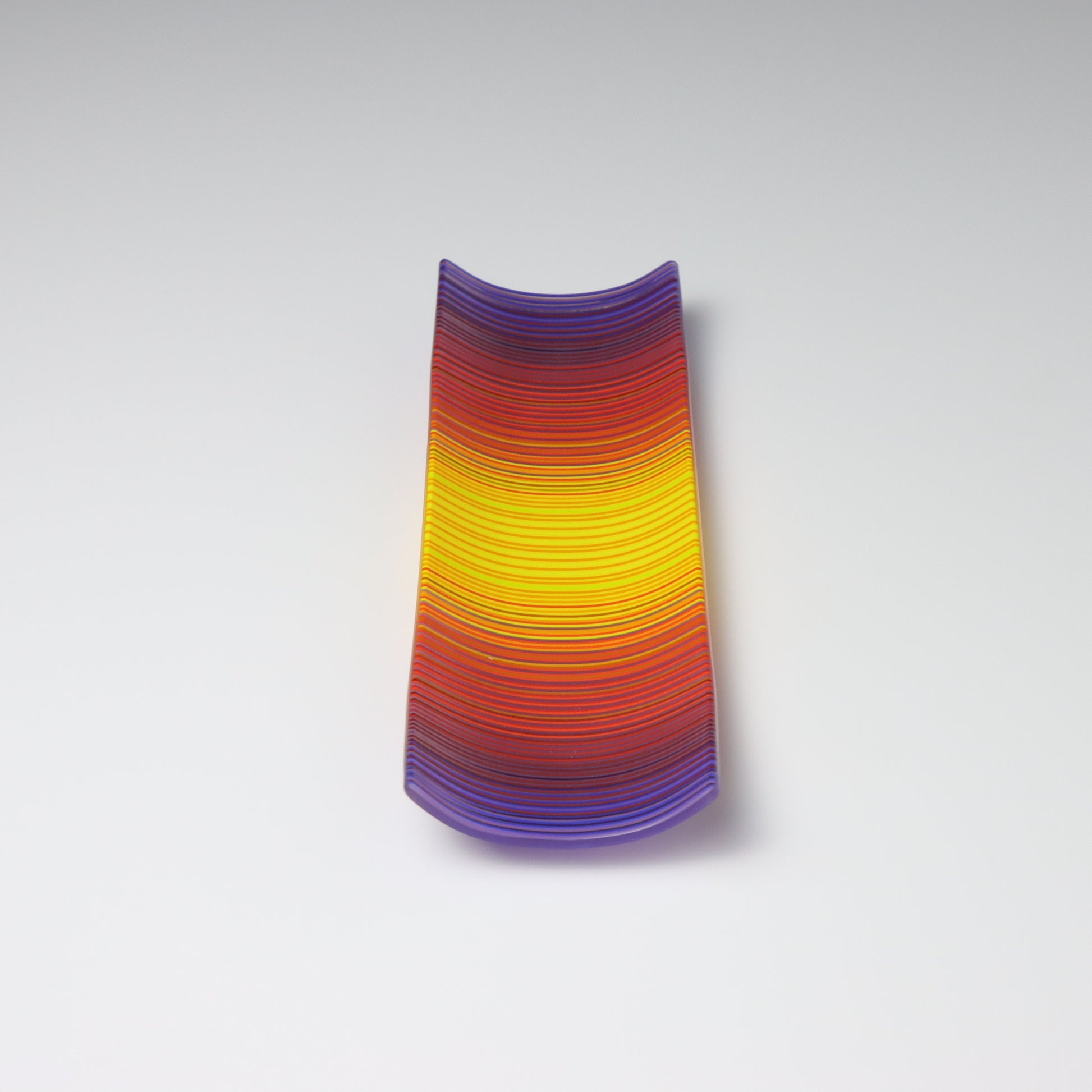Deep purples, fiery reds, and glowing yellows come together in a powerful sequence that recalls the warmth and movement of a setting sun. The colours flow with intensity and rhythm, creating a piece that feels alive with energy. The rectangular form and softly curved edges give it a modern balance, letting the colour lead the conversation.