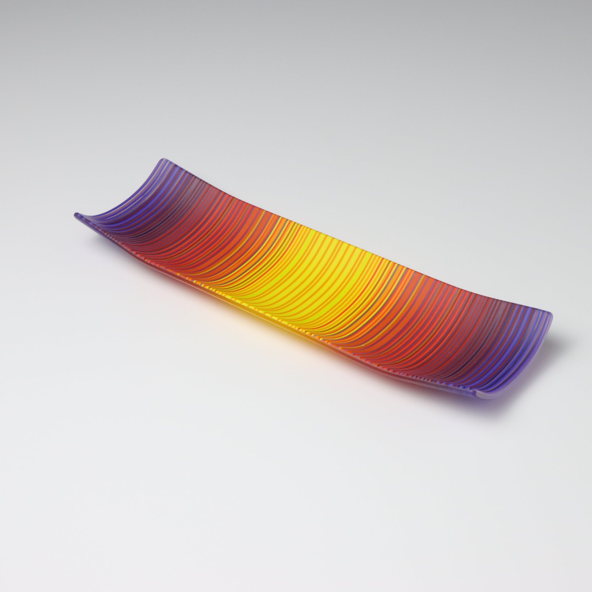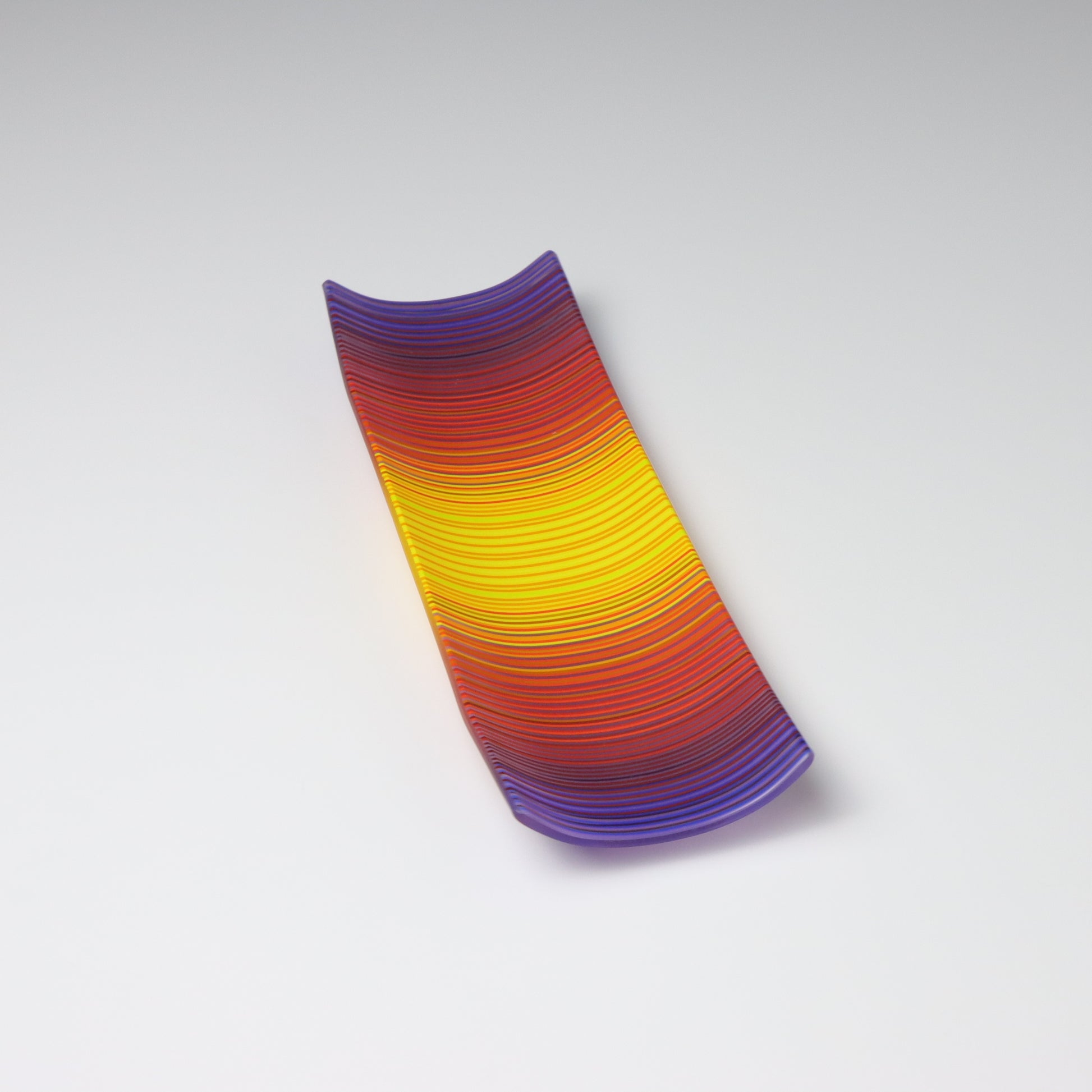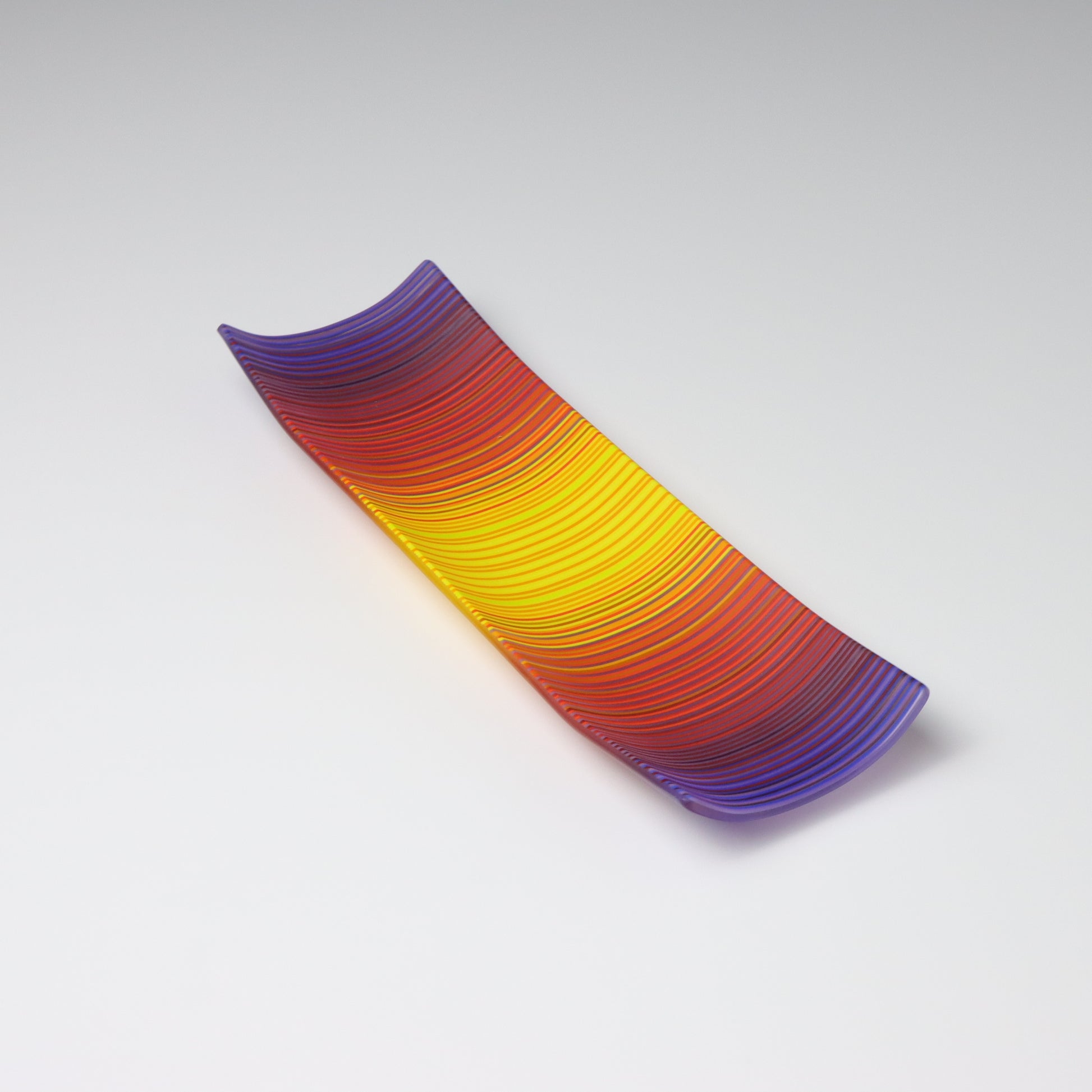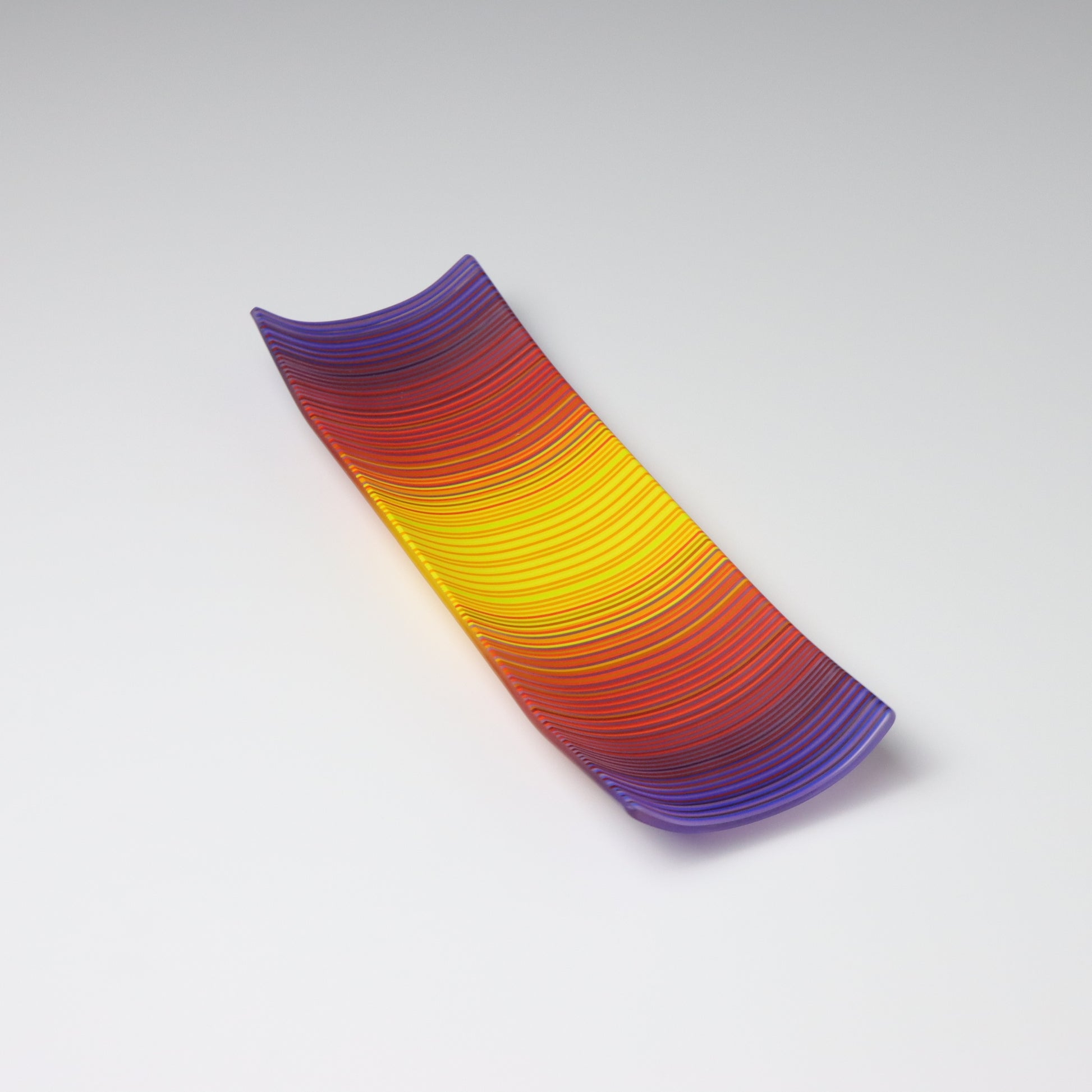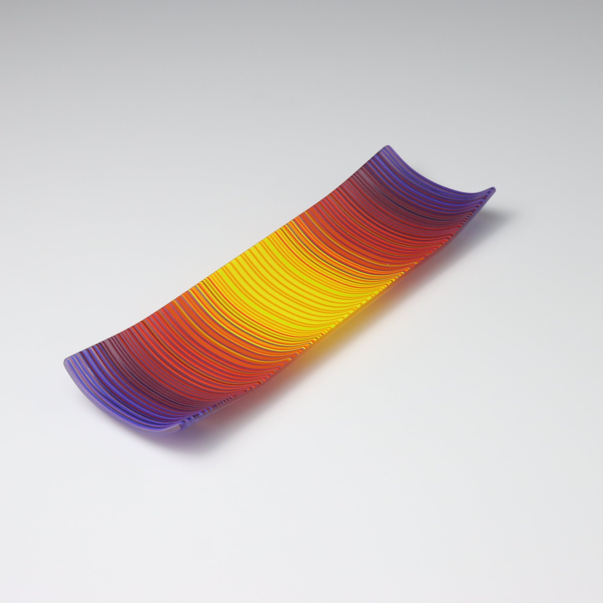 Deep purples, fiery reds, and glowing yellows come together in a powerful sequence that recalls the warmth and movement of a setting sun. The colours flow with intensity and rhythm, creating a piece that feels alive with energy. The rectangular form and softly curved edges give it a modern balance, letting the colour lead the conversation.