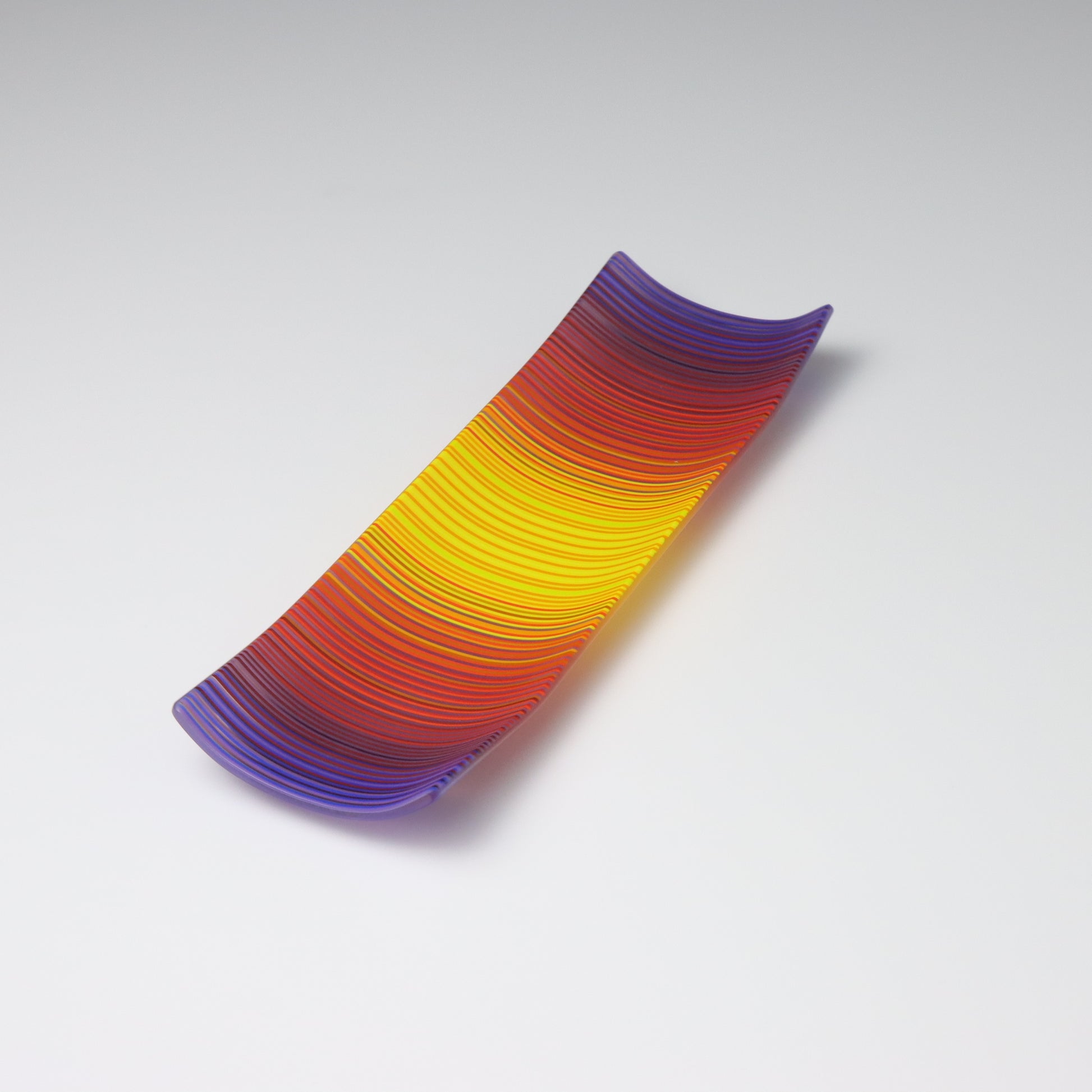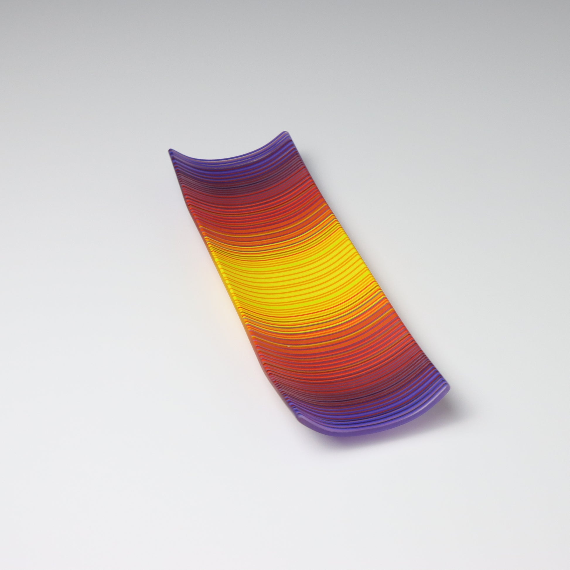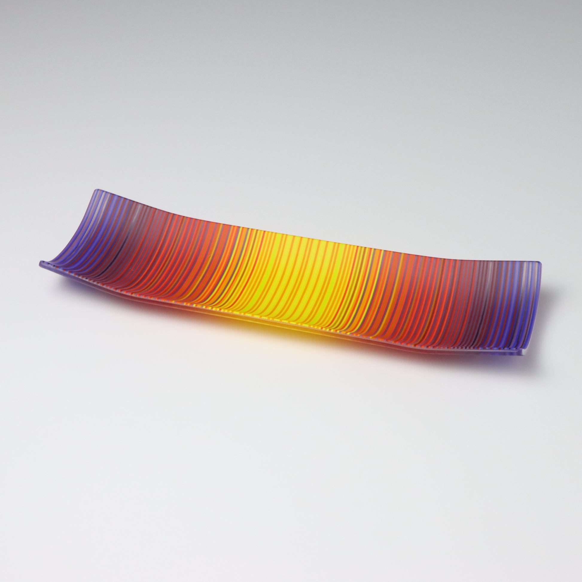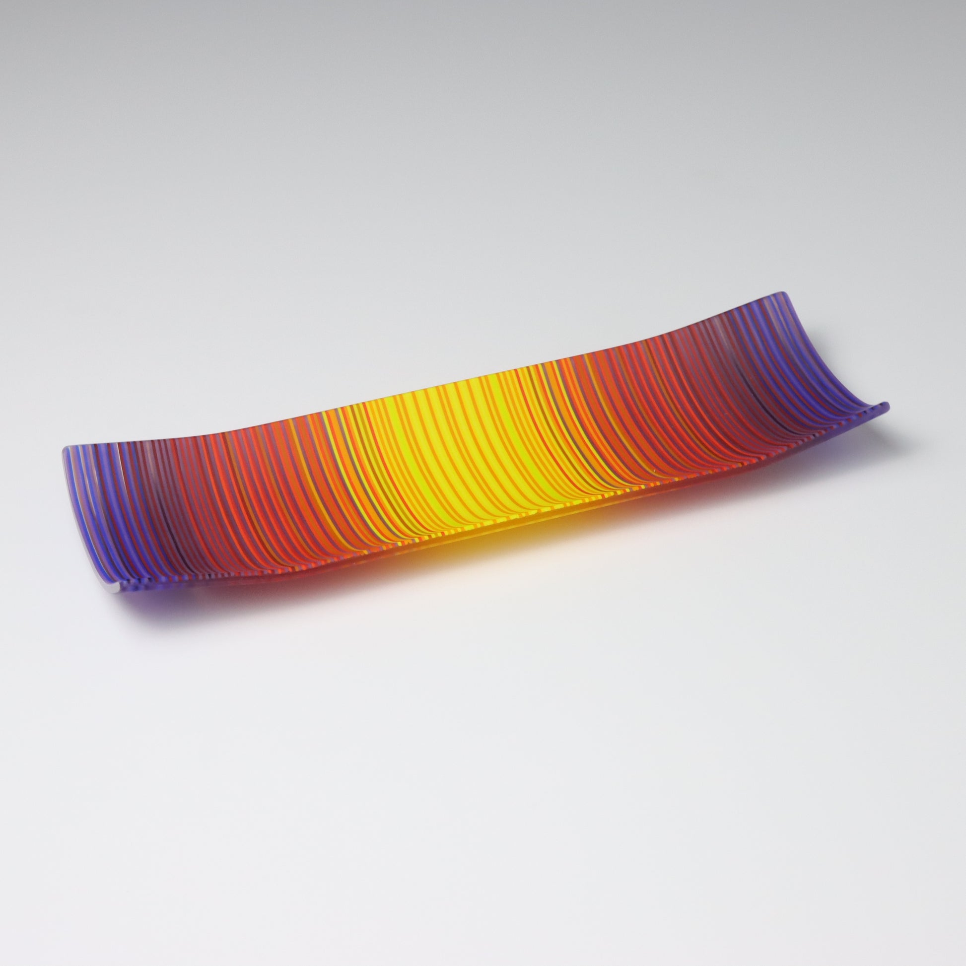 Deep purples, fiery reds, and glowing yellows come together in a powerful sequence that recalls the warmth and movement of a setting sun. The colours flow with intensity and rhythm, creating a piece that feels alive with energy. The rectangular form and softly curved edges give it a modern balance, letting the colour lead the conversation.