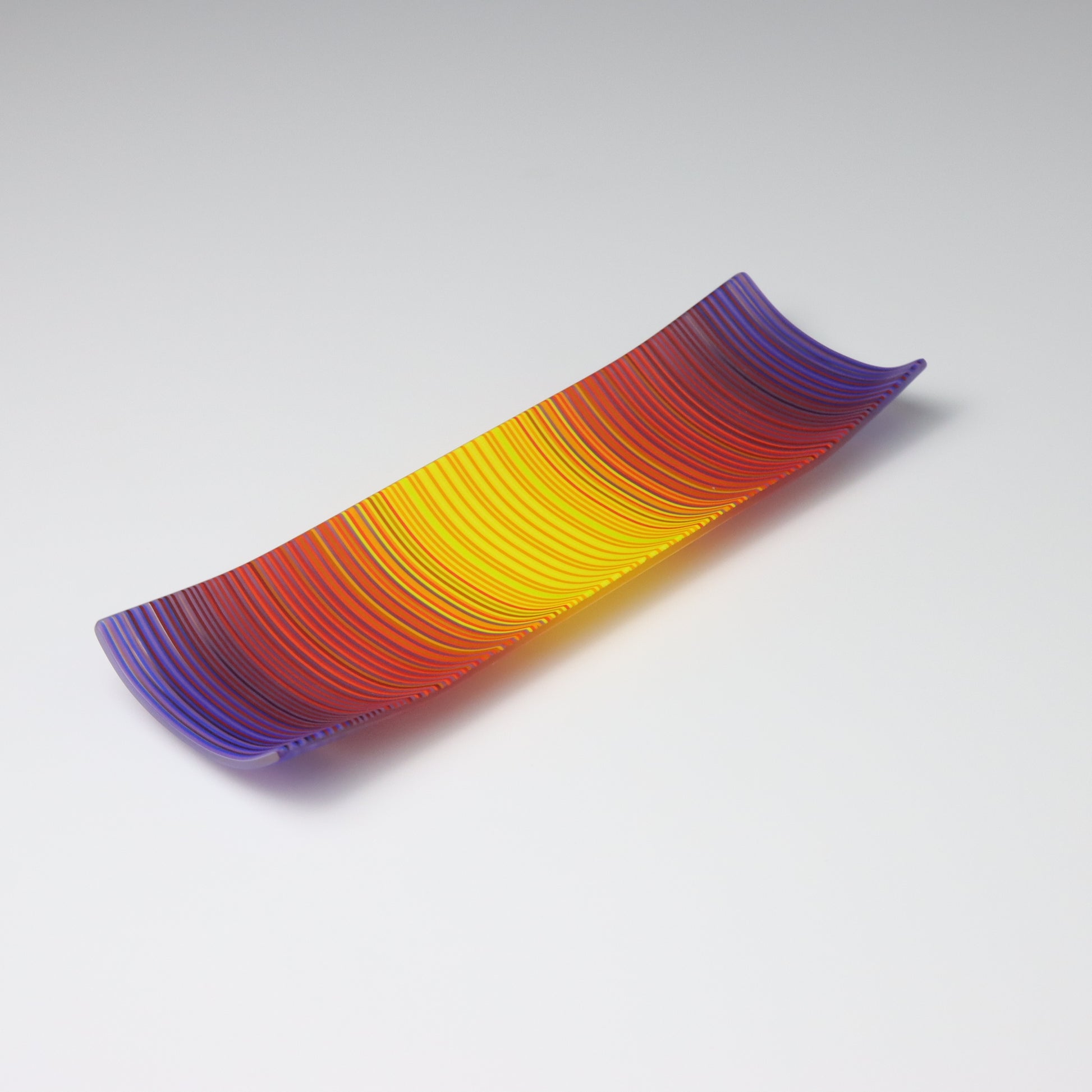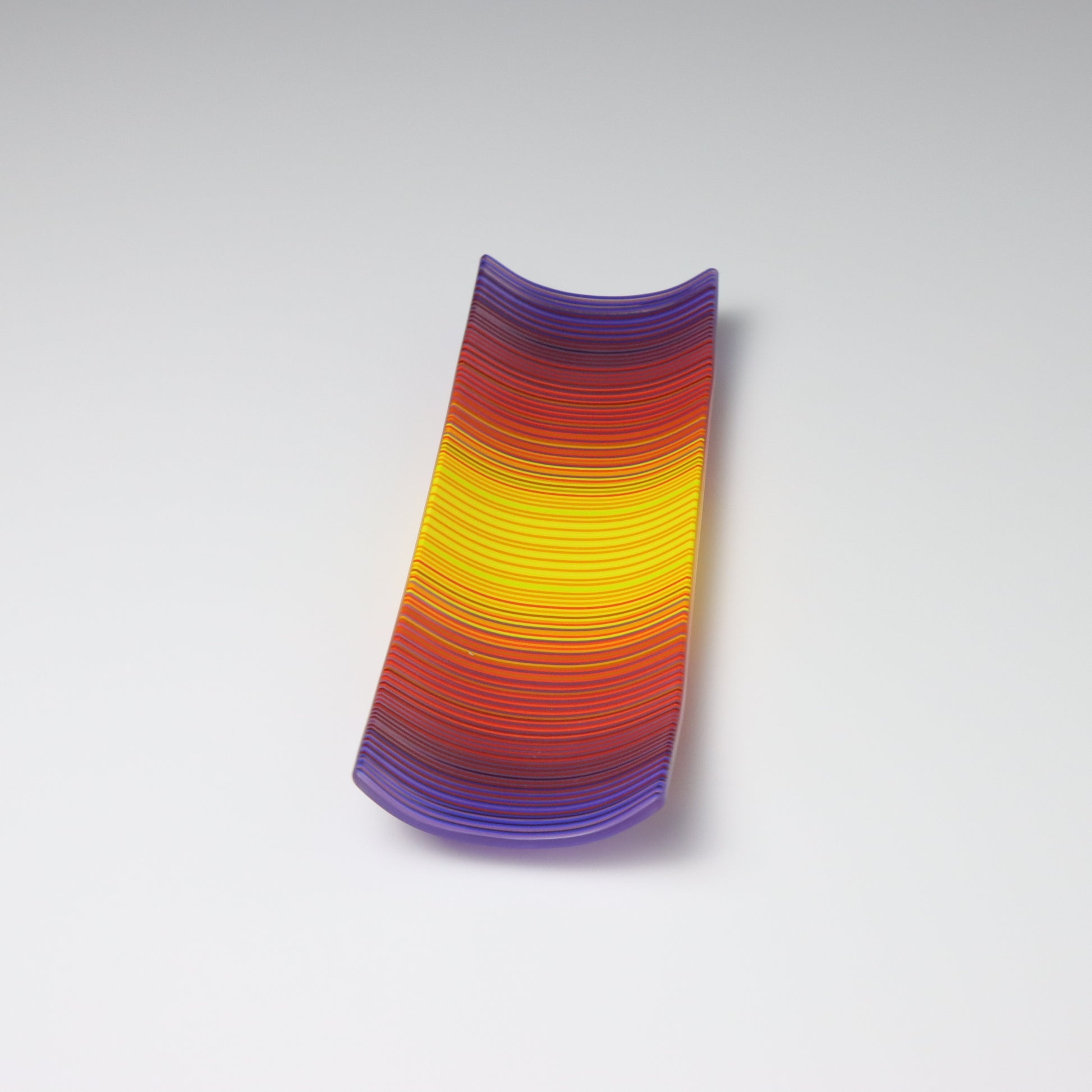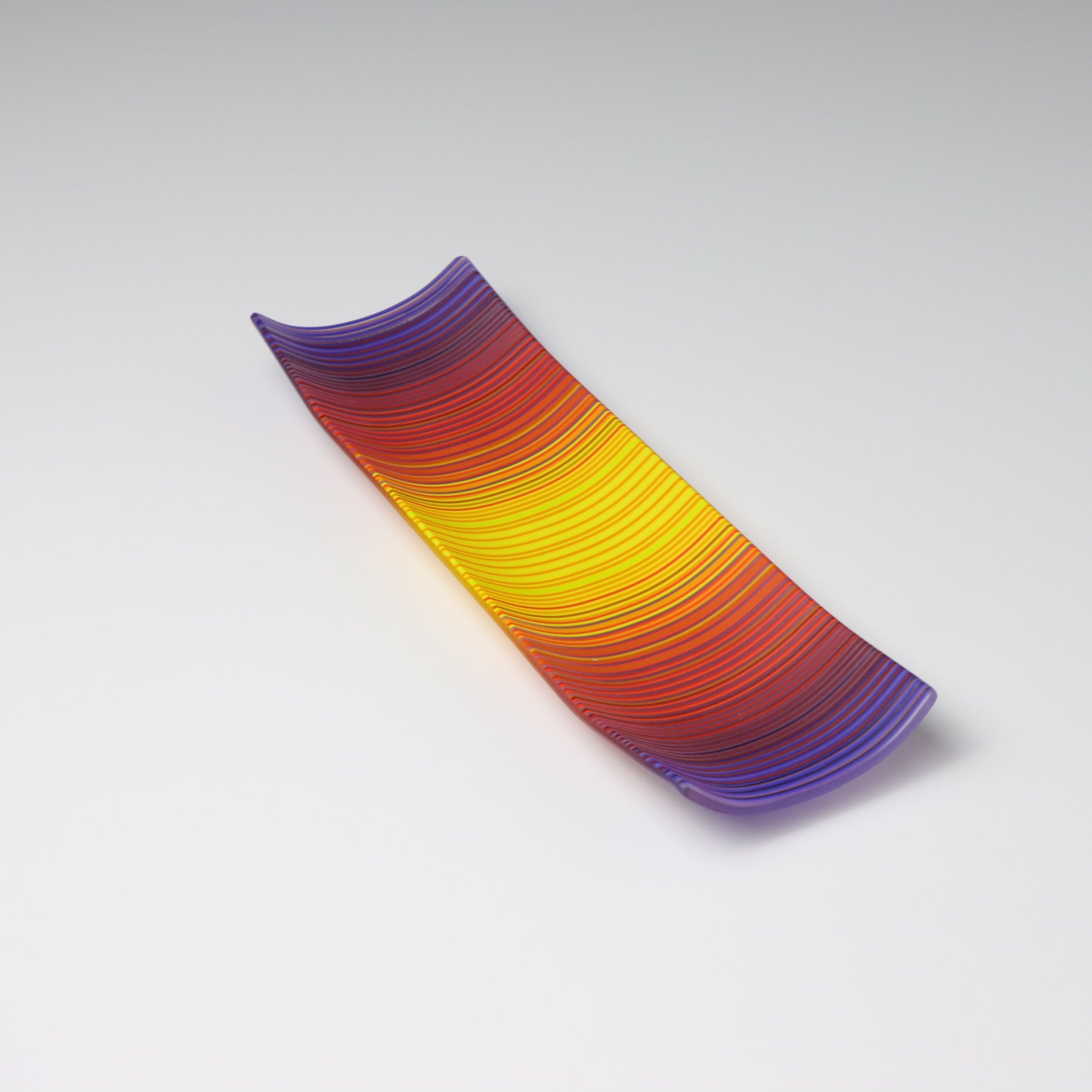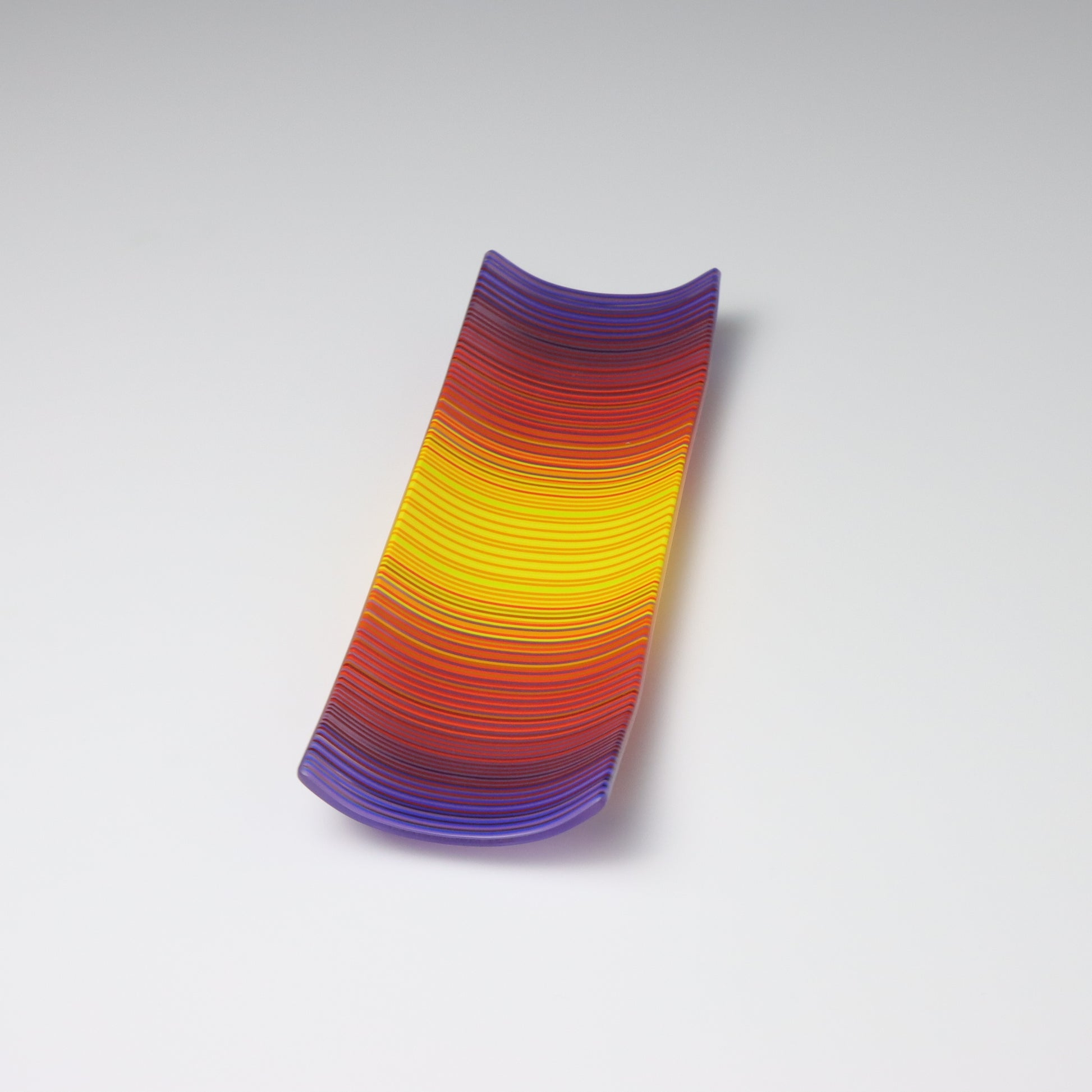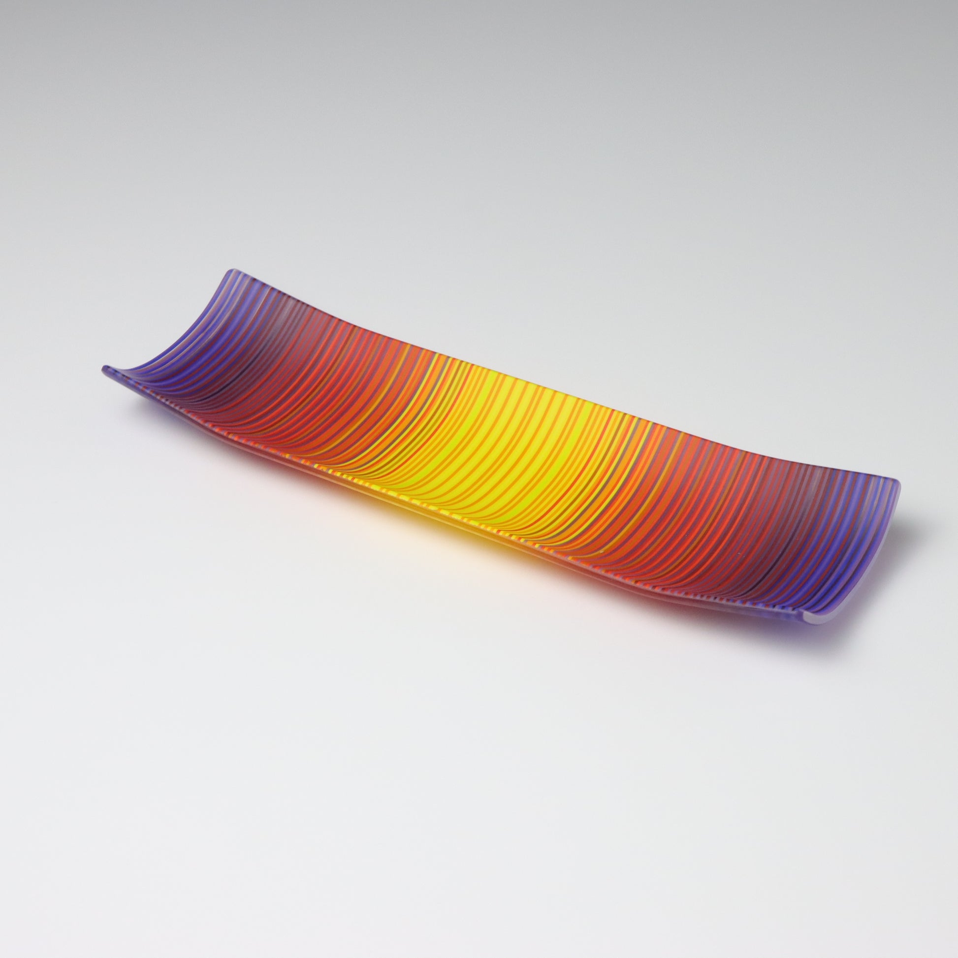 Deep purples, fiery reds, and glowing yellows come together in a powerful sequence that recalls the warmth and movement of a setting sun. The colours flow with intensity and rhythm, creating a piece that feels alive with energy. The rectangular form and softly curved edges give it a modern balance, letting the colour lead the conversation.