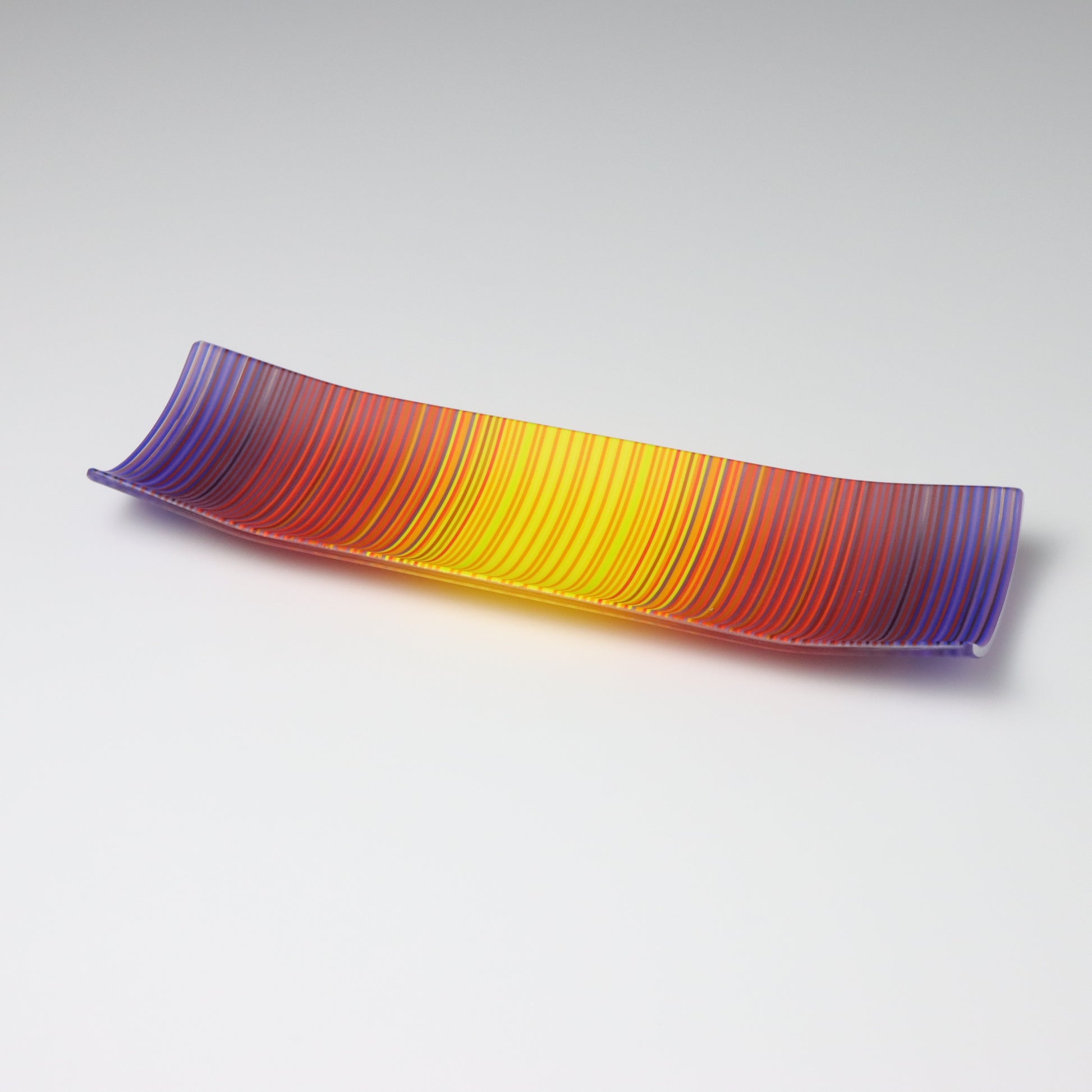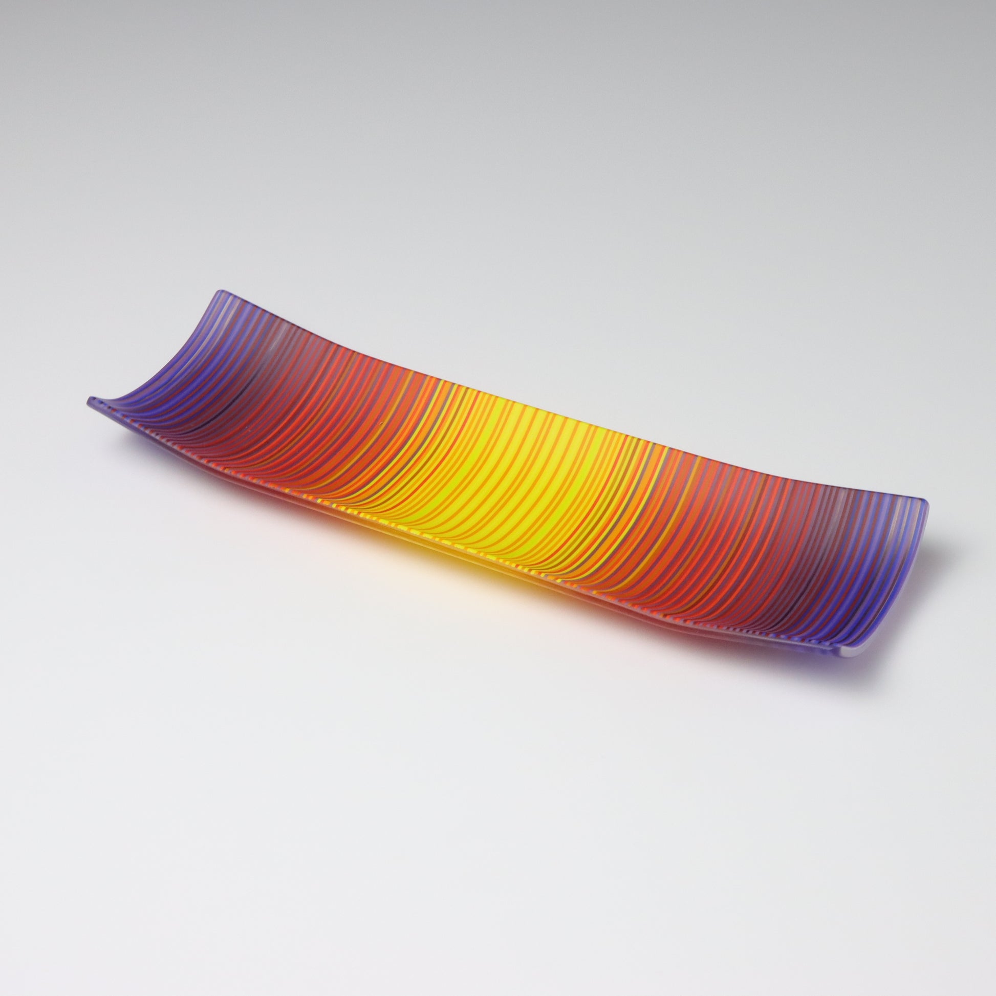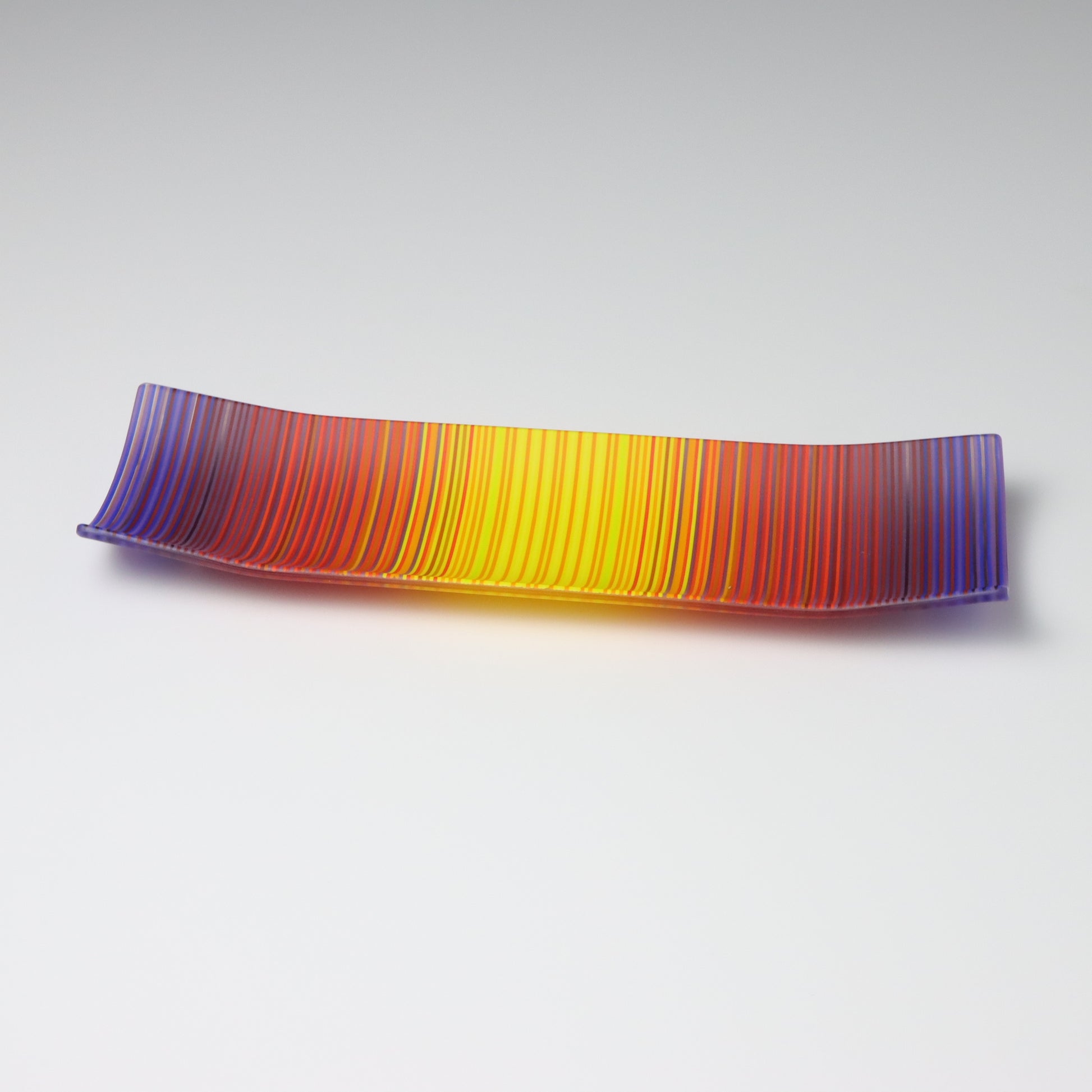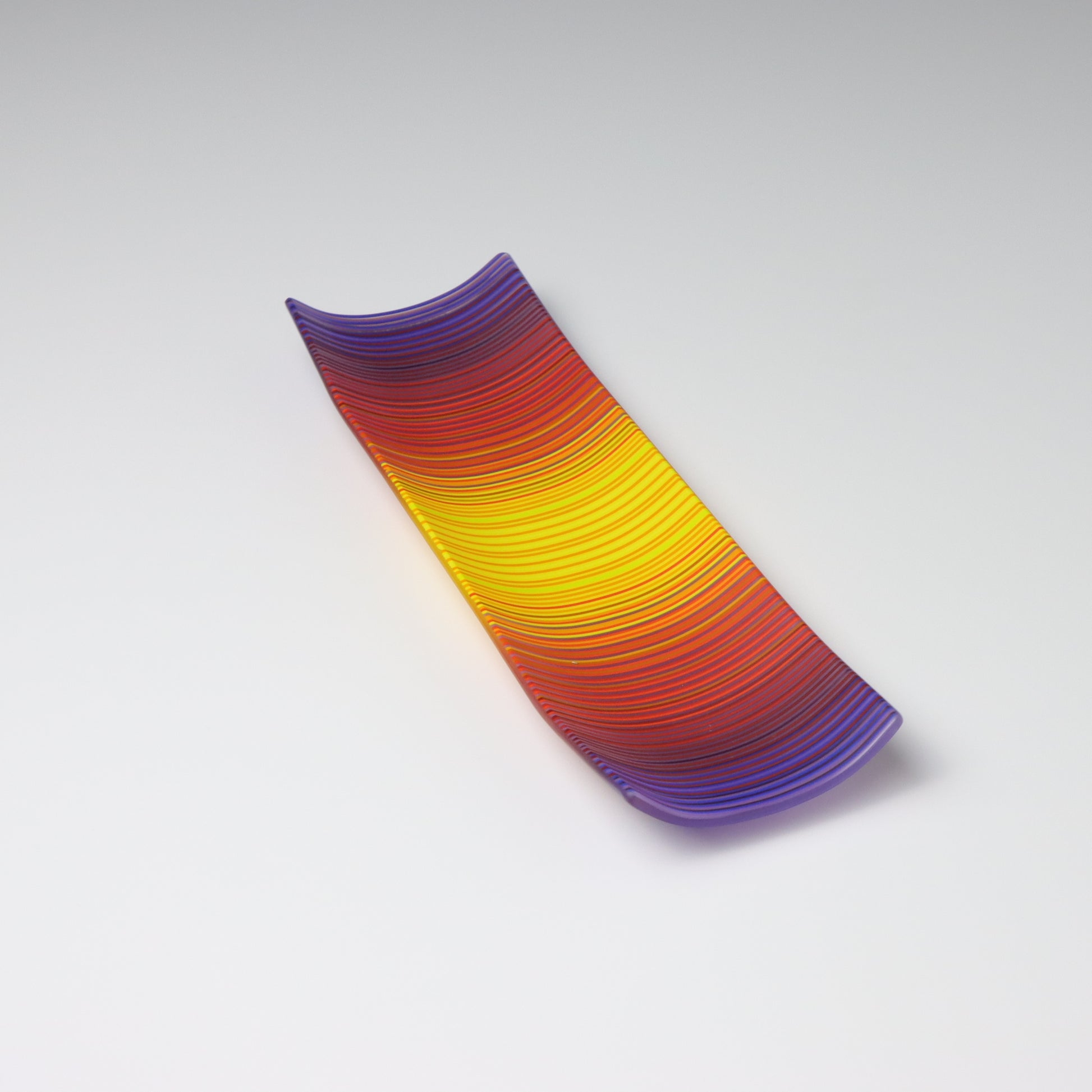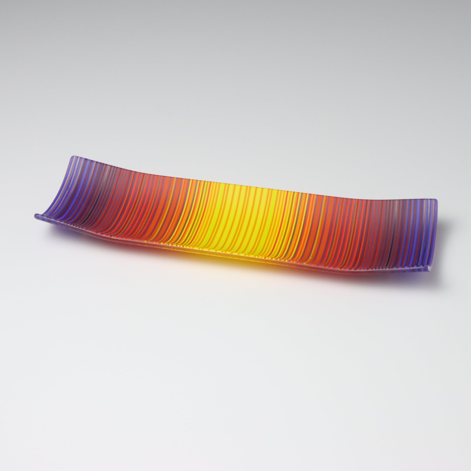 Deep purples, fiery reds, and glowing yellows come together in a powerful sequence that recalls the warmth and movement of a setting sun. The colours flow with intensity and rhythm, creating a piece that feels alive with energy. The rectangular form and softly curved edges give it a modern balance, letting the colour lead the conversation.