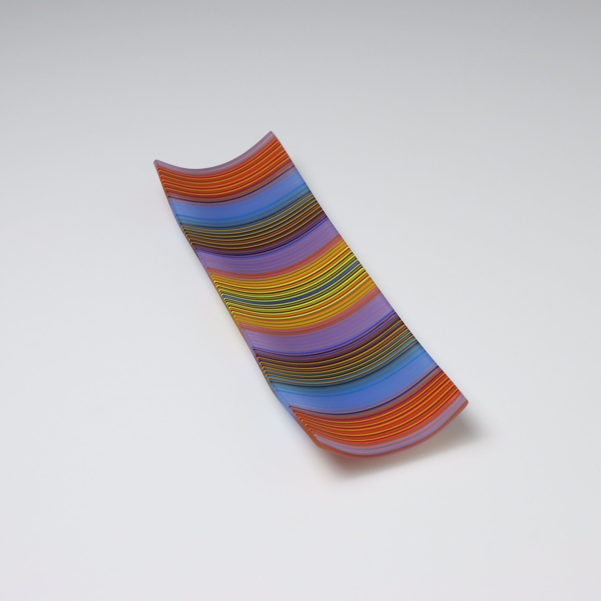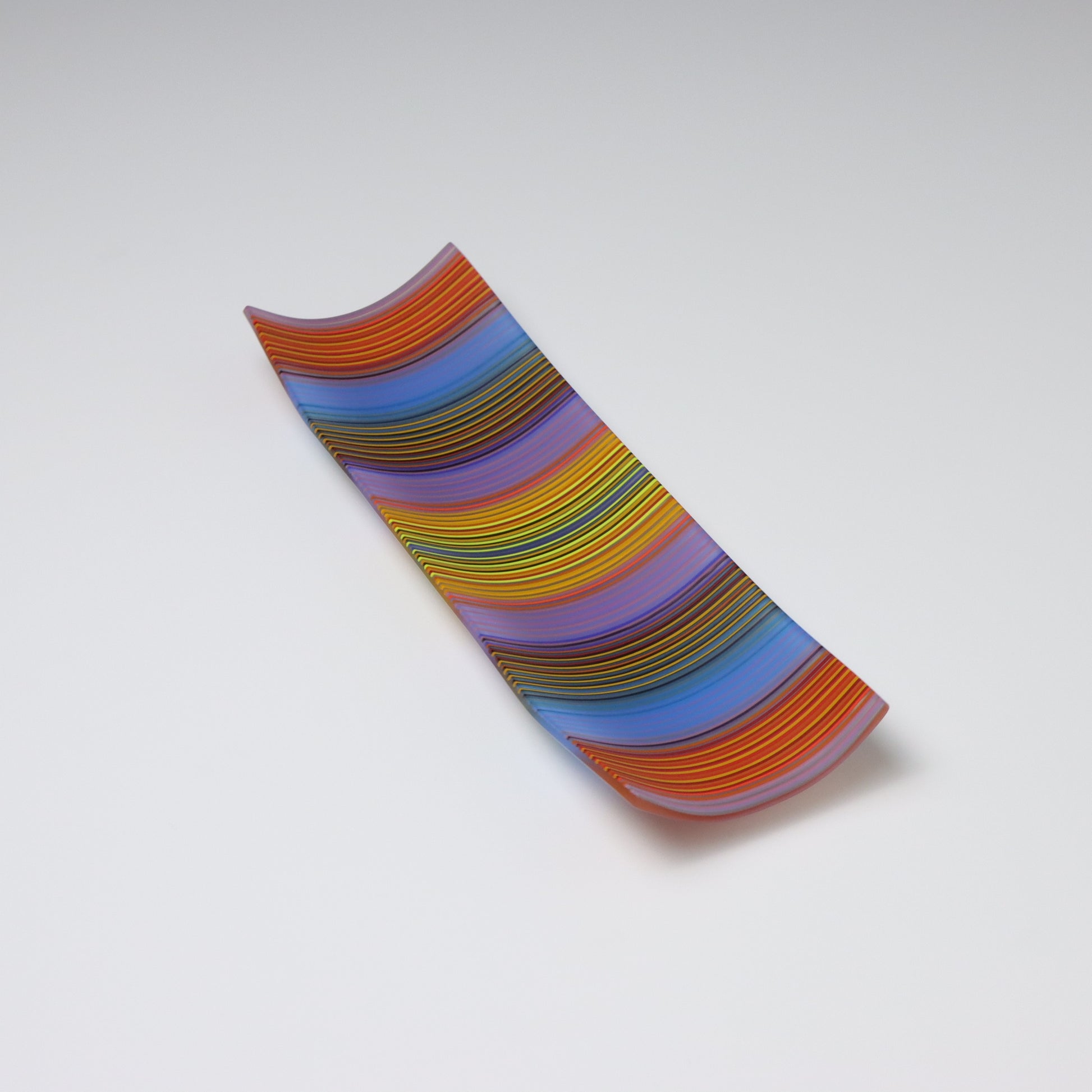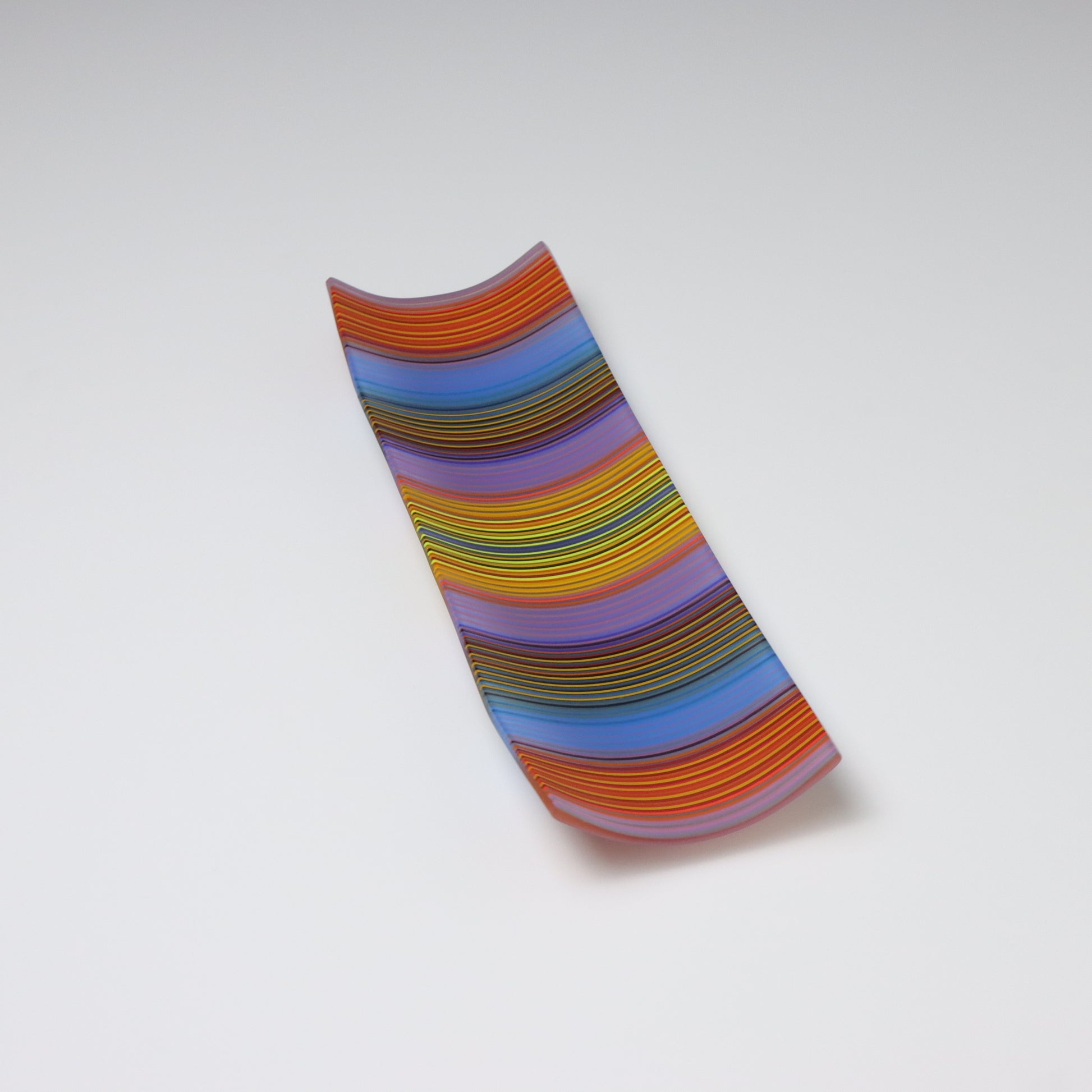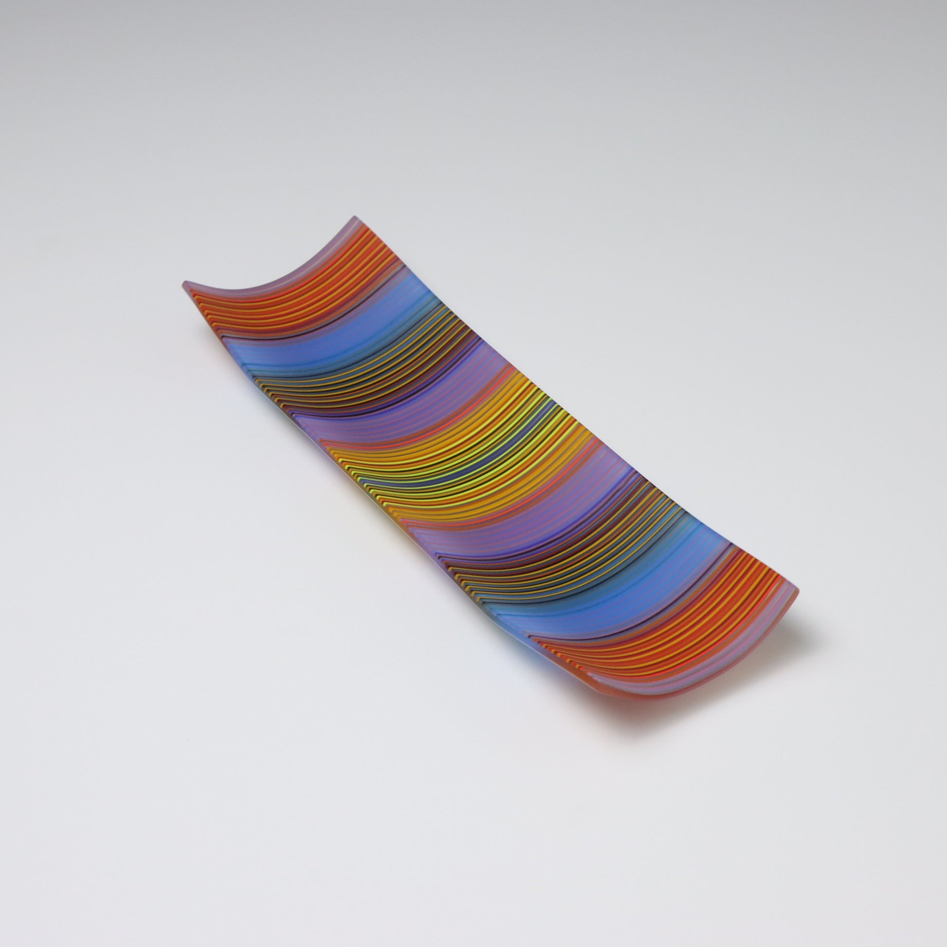 Rich blues, deep purples, and fiery oranges lead the eye toward a glowing yellow centre - a sequence that feels alive with energy. Up close, the fine strands of glass reveal shifting colour and rhythm, drawing you in with every glance. The rectangular form and smooth curved edges give it a contemporary balance, letting the colour speak for itself.
