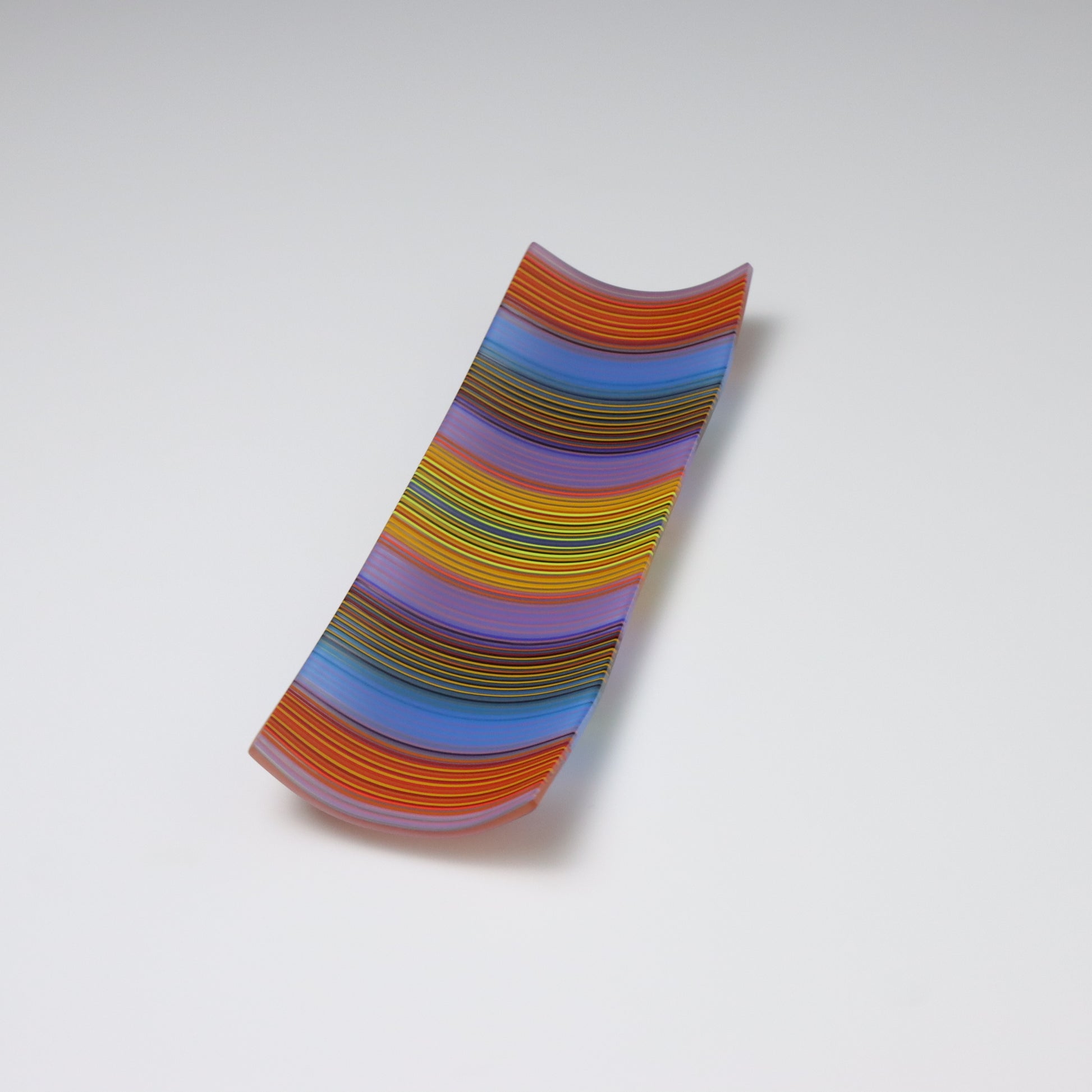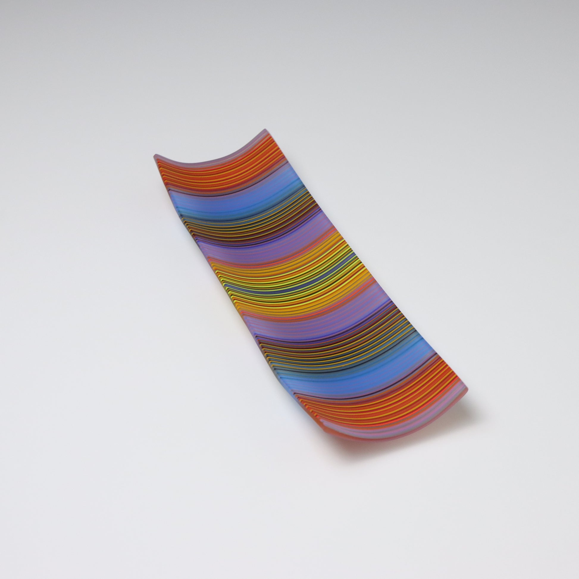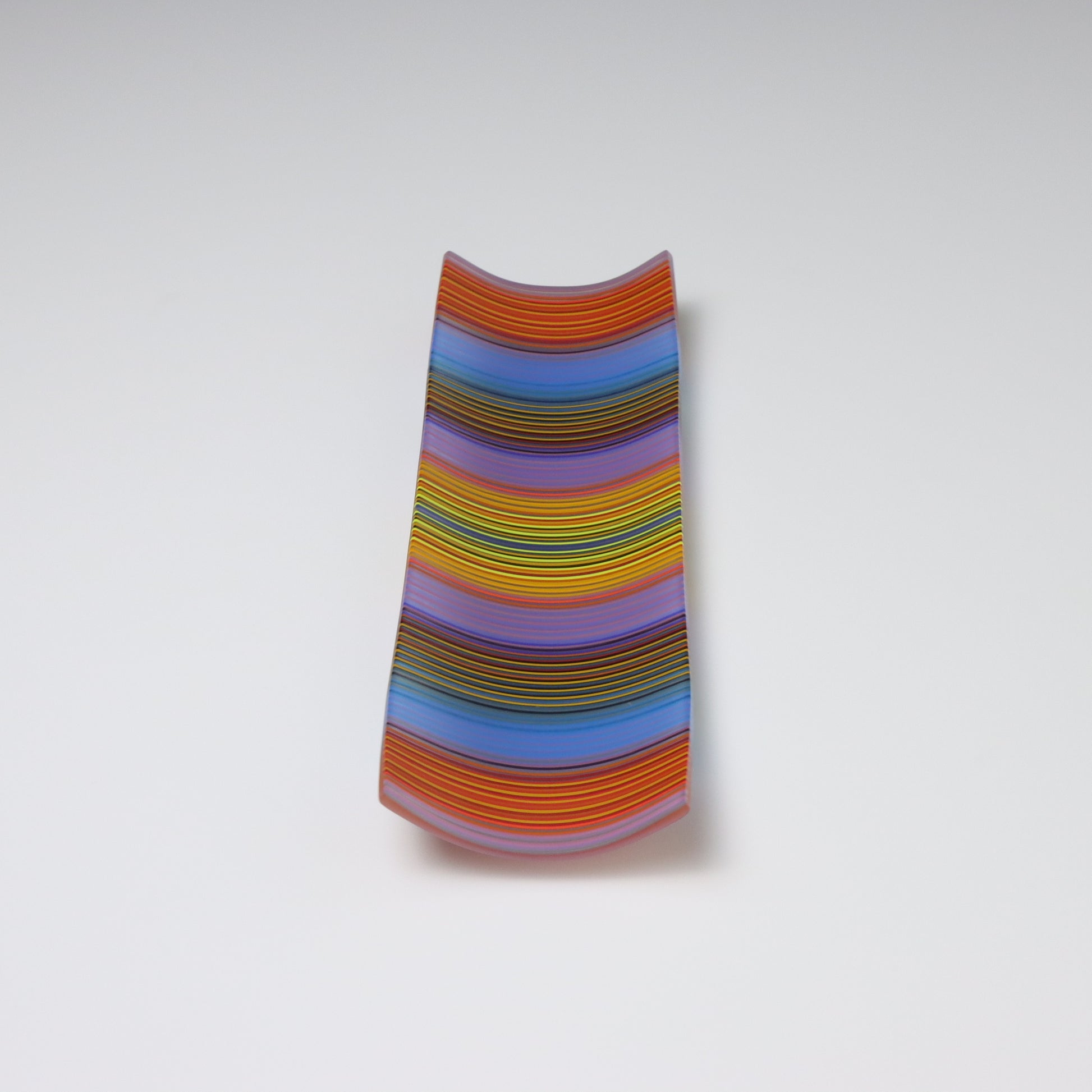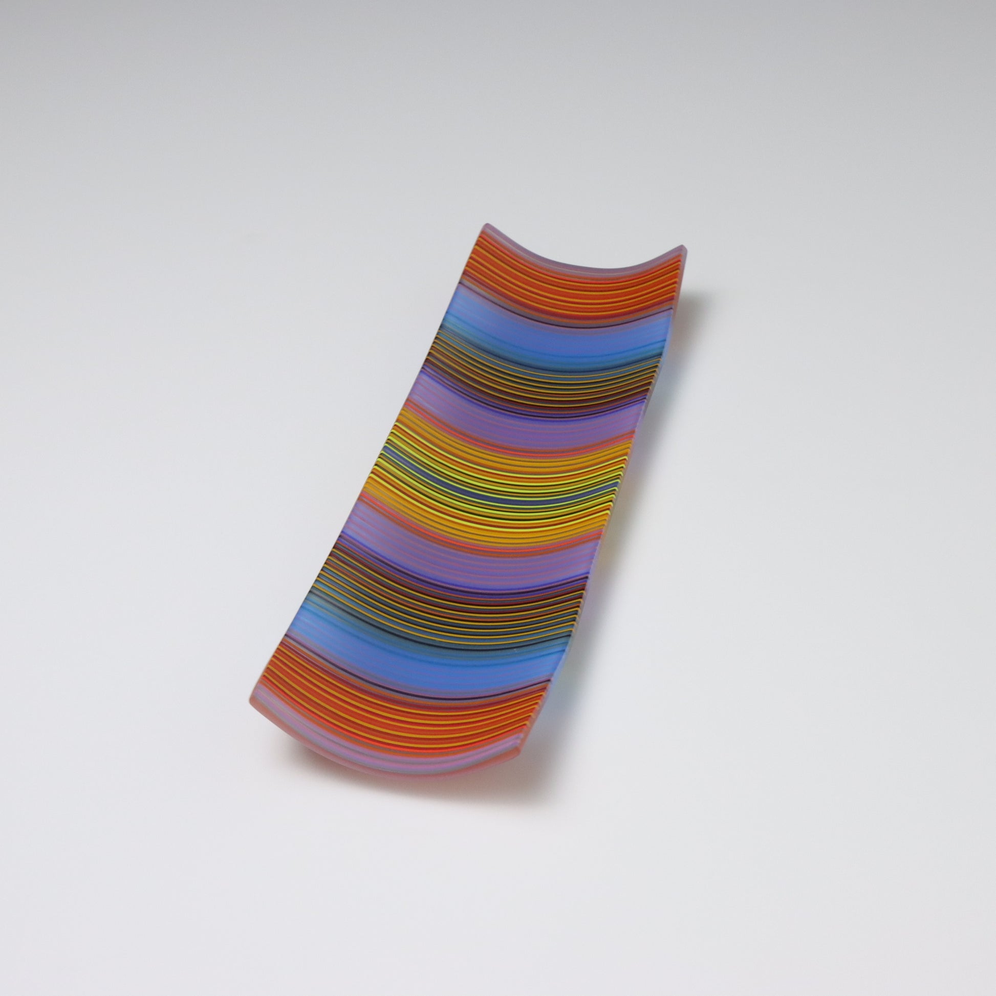 Rich blues, deep purples, and fiery oranges lead the eye toward a glowing yellow centre - a sequence that feels alive with energy. Up close, the fine strands of glass reveal shifting colour and rhythm, drawing you in with every glance. The rectangular form and smooth curved edges give it a contemporary balance, letting the colour speak for itself.