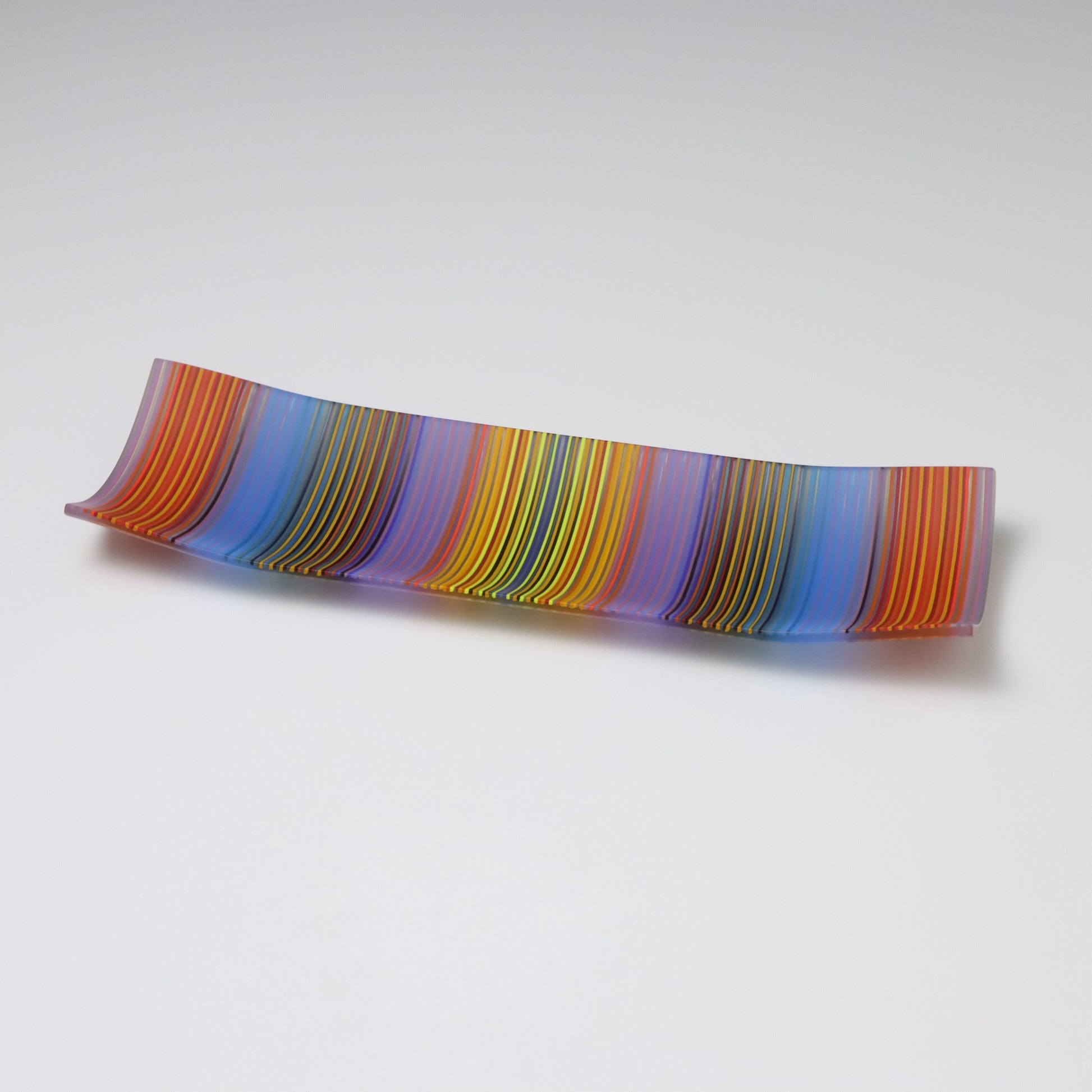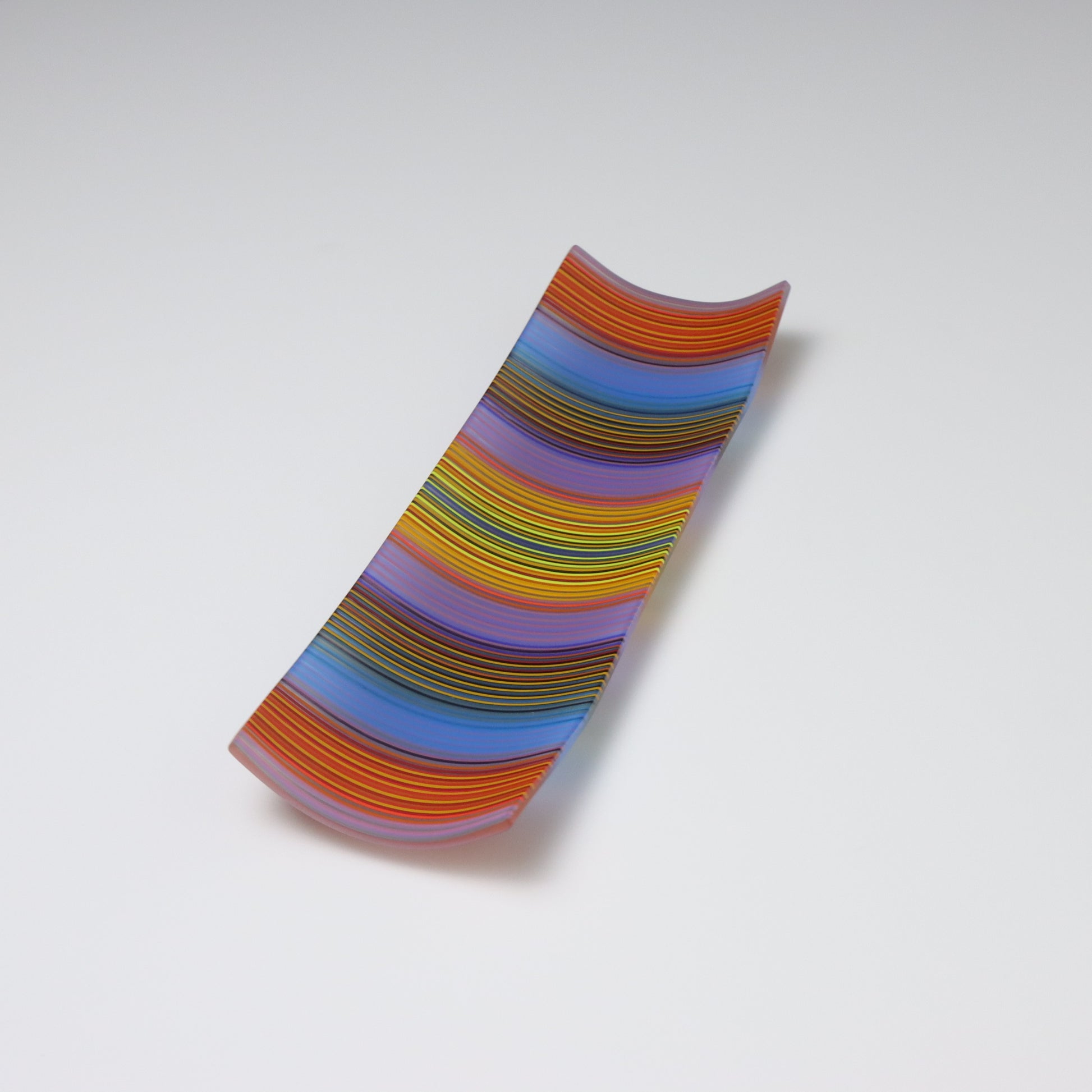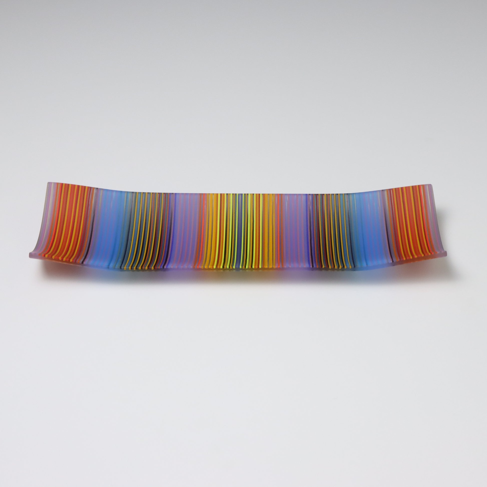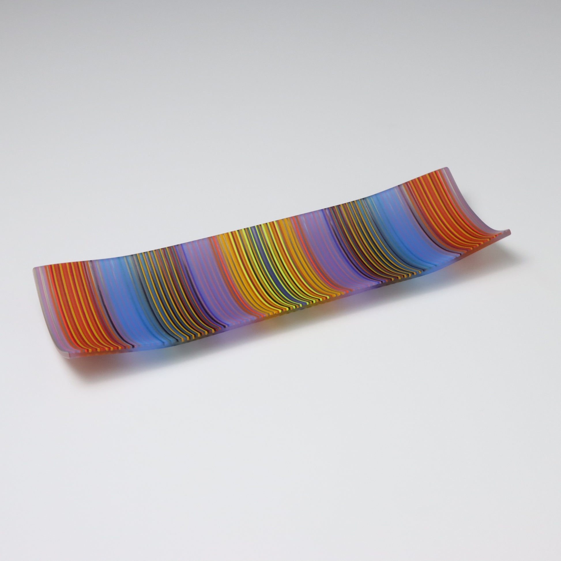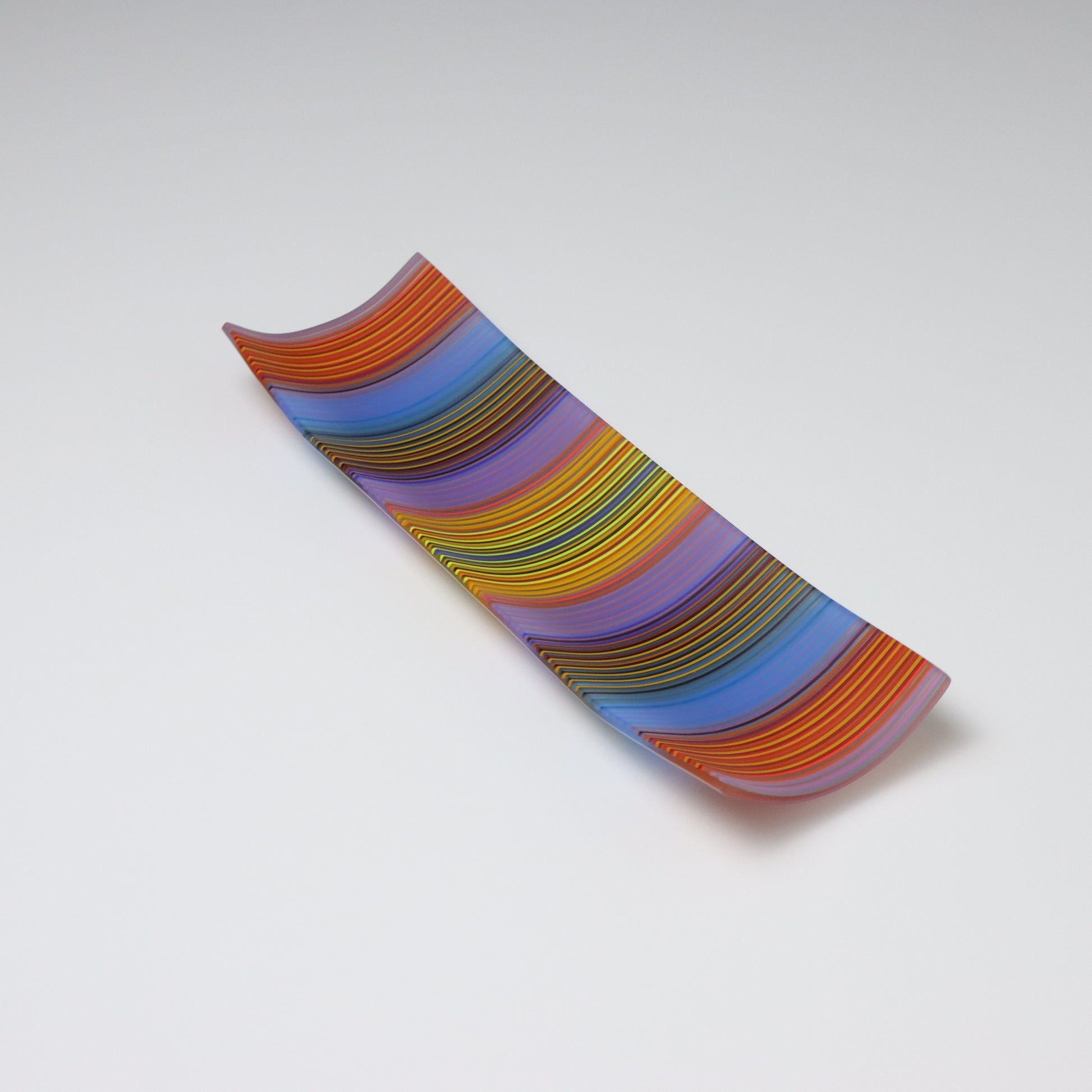 Rich blues, deep purples, and fiery oranges lead the eye toward a glowing yellow centre - a sequence that feels alive with energy. Up close, the fine strands of glass reveal shifting colour and rhythm, drawing you in with every glance. The rectangular form and smooth curved edges give it a contemporary balance, letting the colour speak for itself.