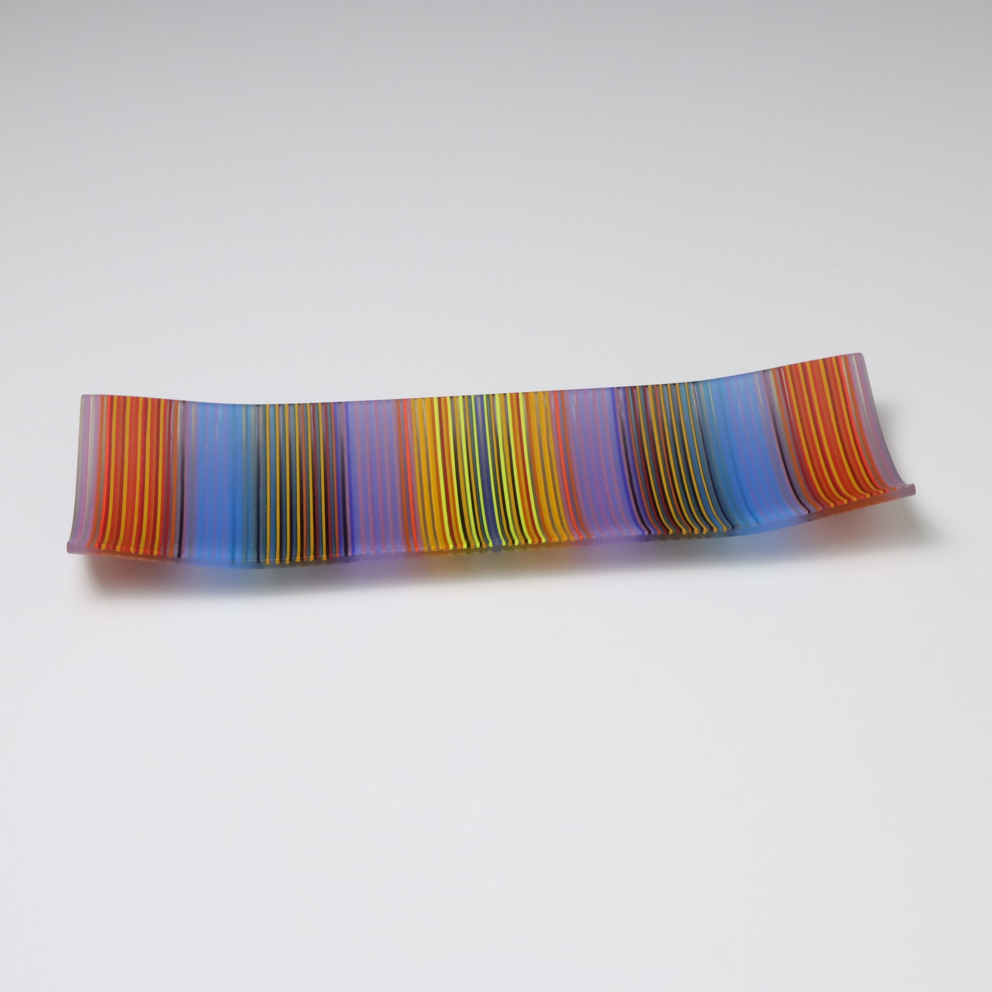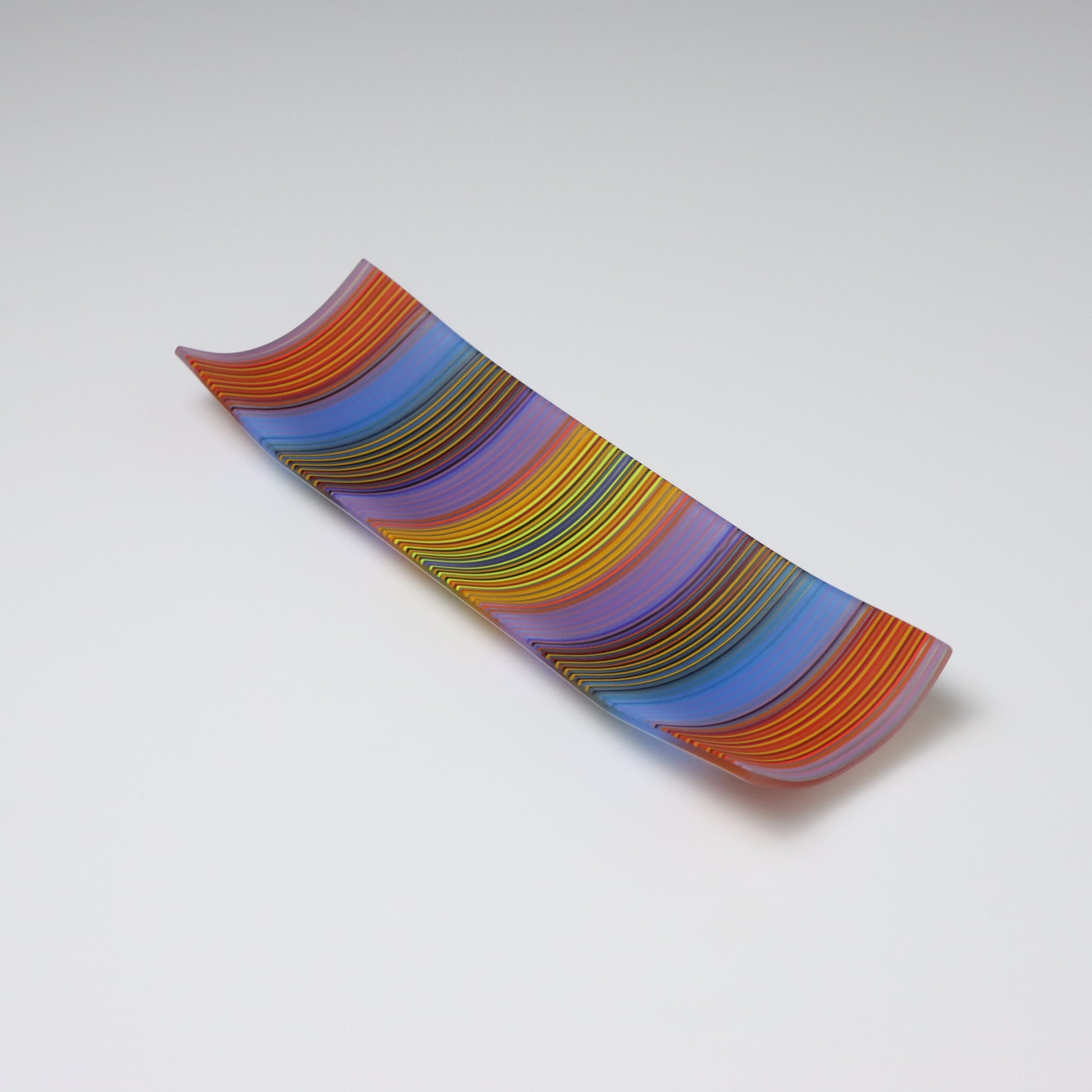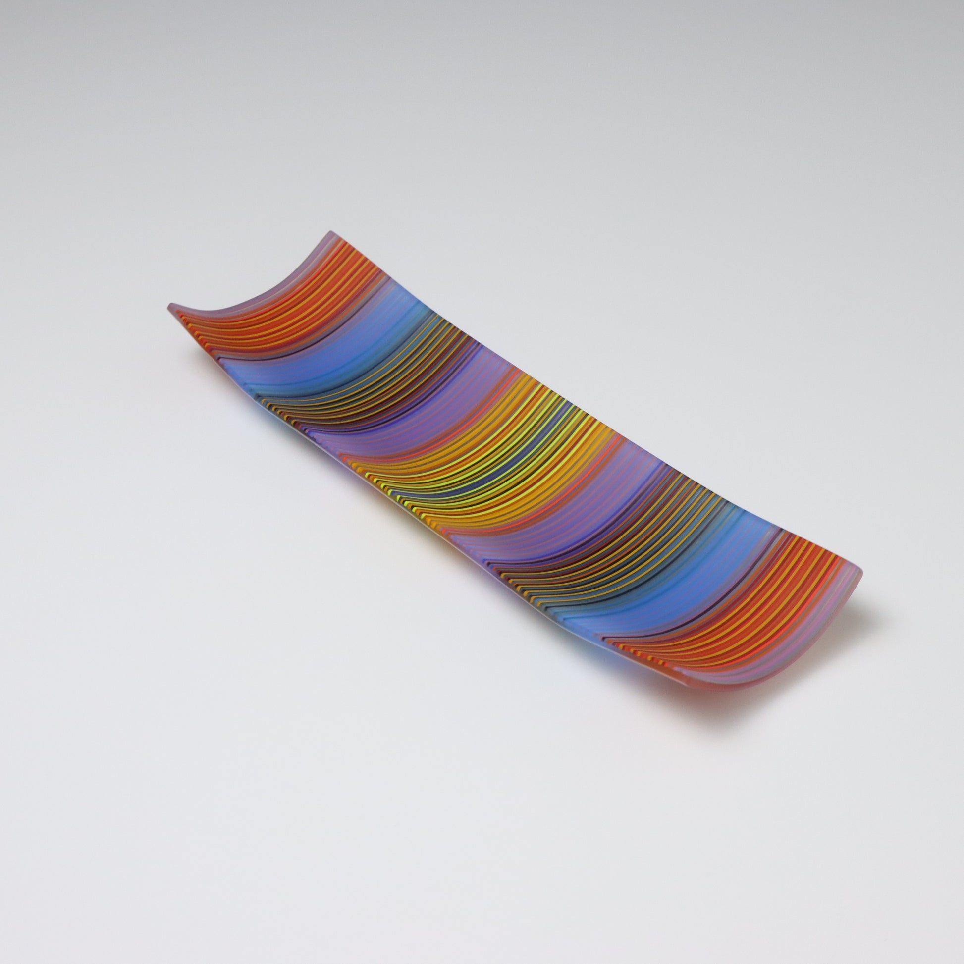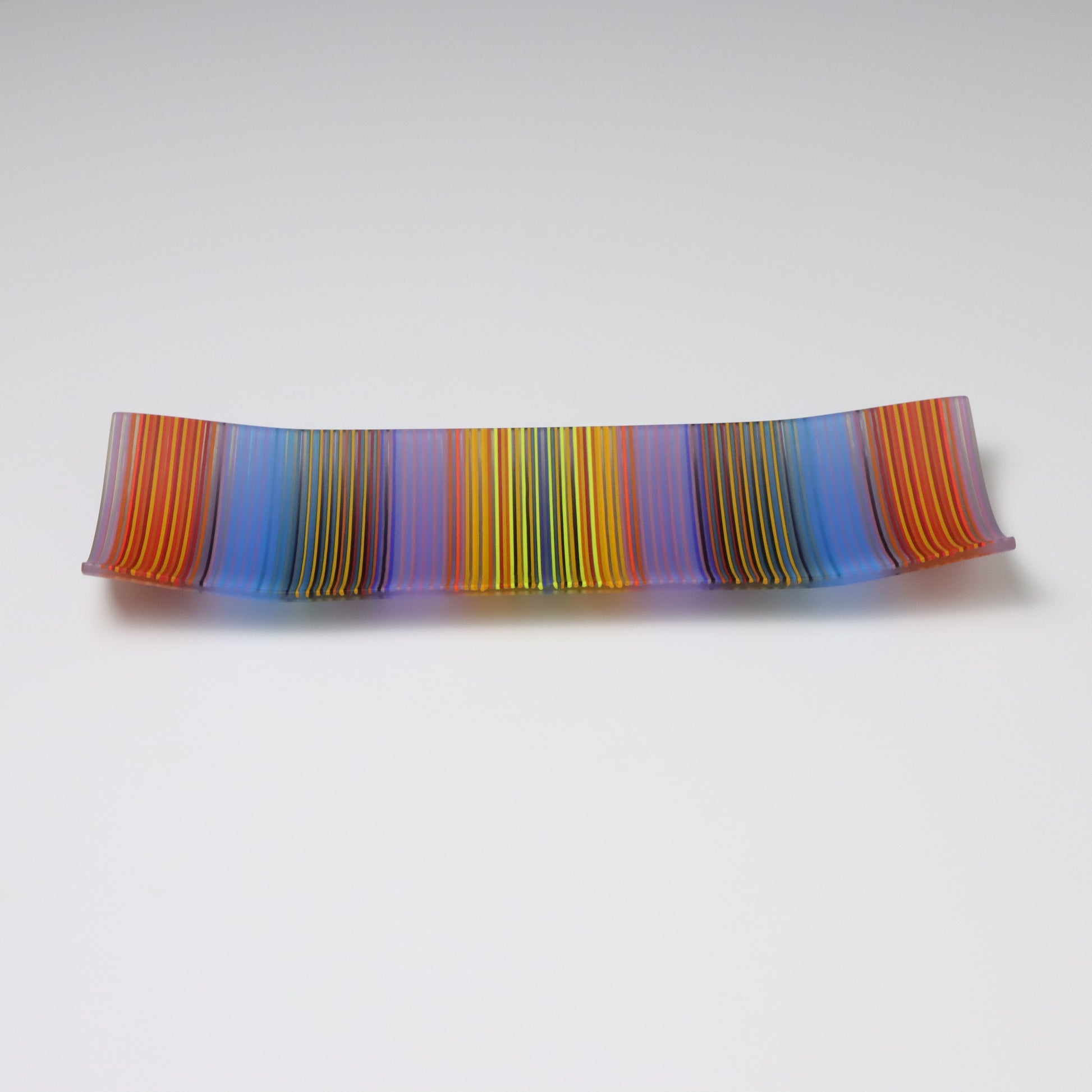 Rich blues, deep purples, and fiery oranges lead the eye toward a glowing yellow centre - a sequence that feels alive with energy. Up close, the fine strands of glass reveal shifting colour and rhythm, drawing you in with every glance. The rectangular form and smooth curved edges give it a contemporary balance, letting the colour speak for itself.