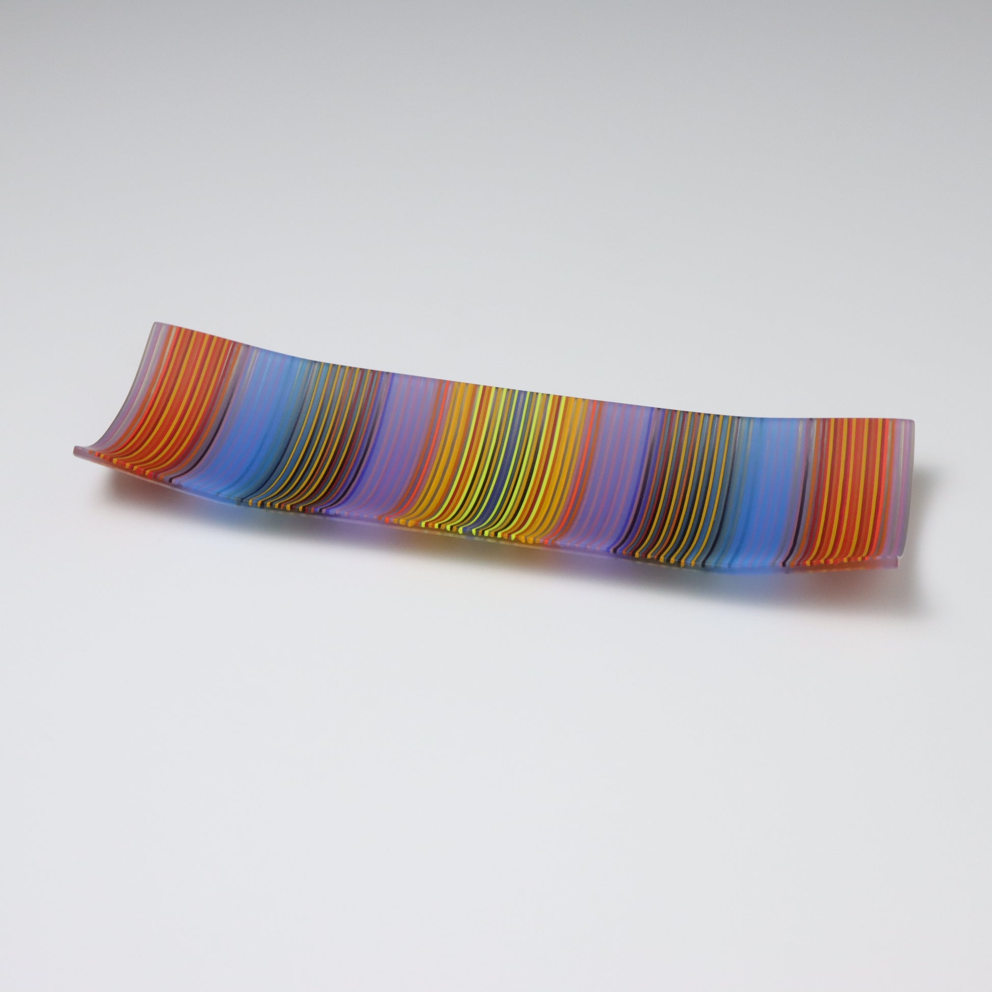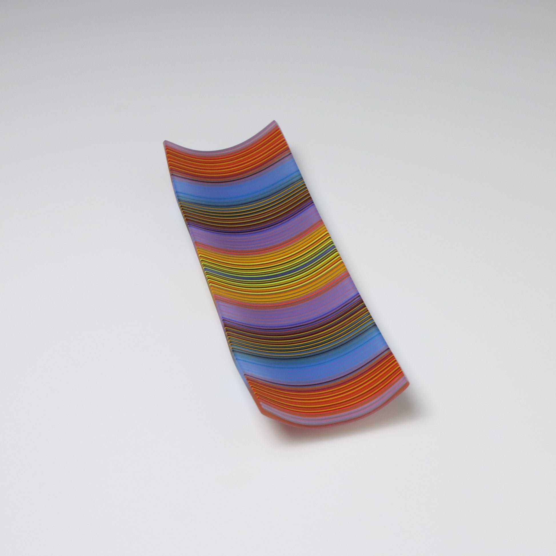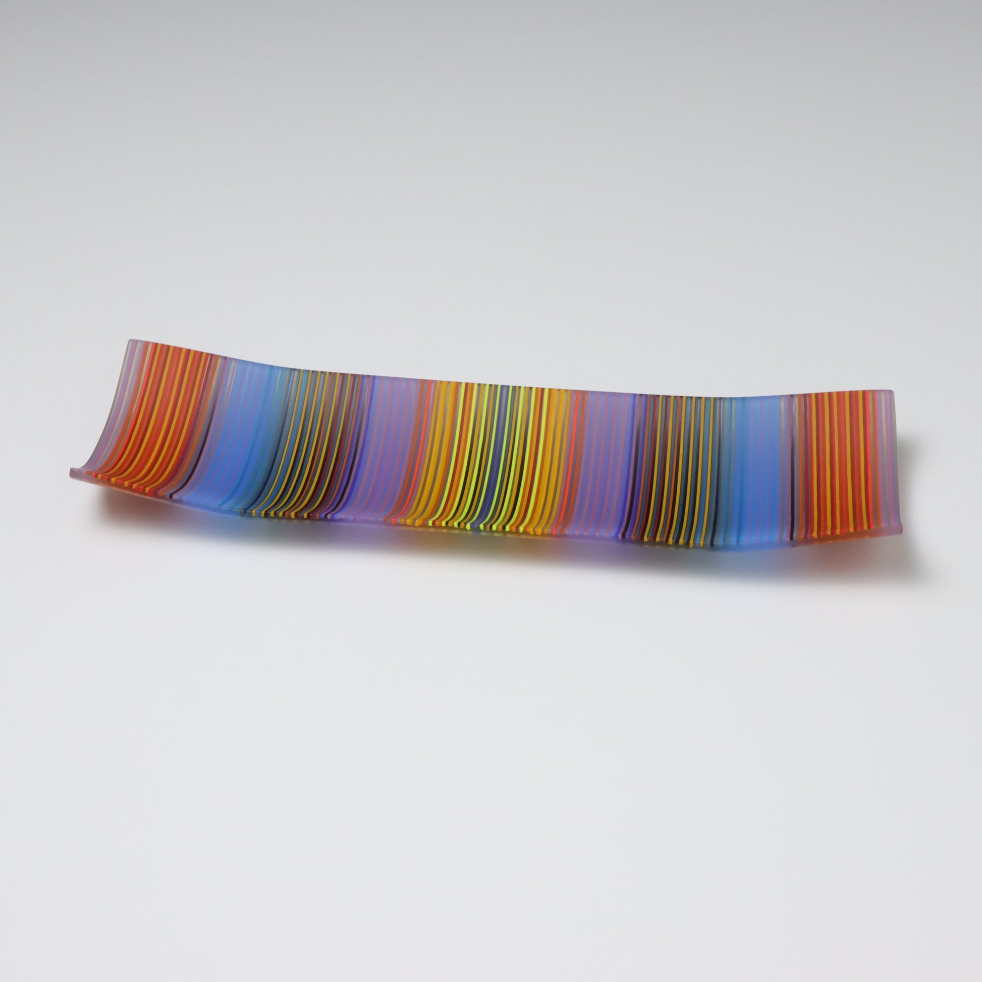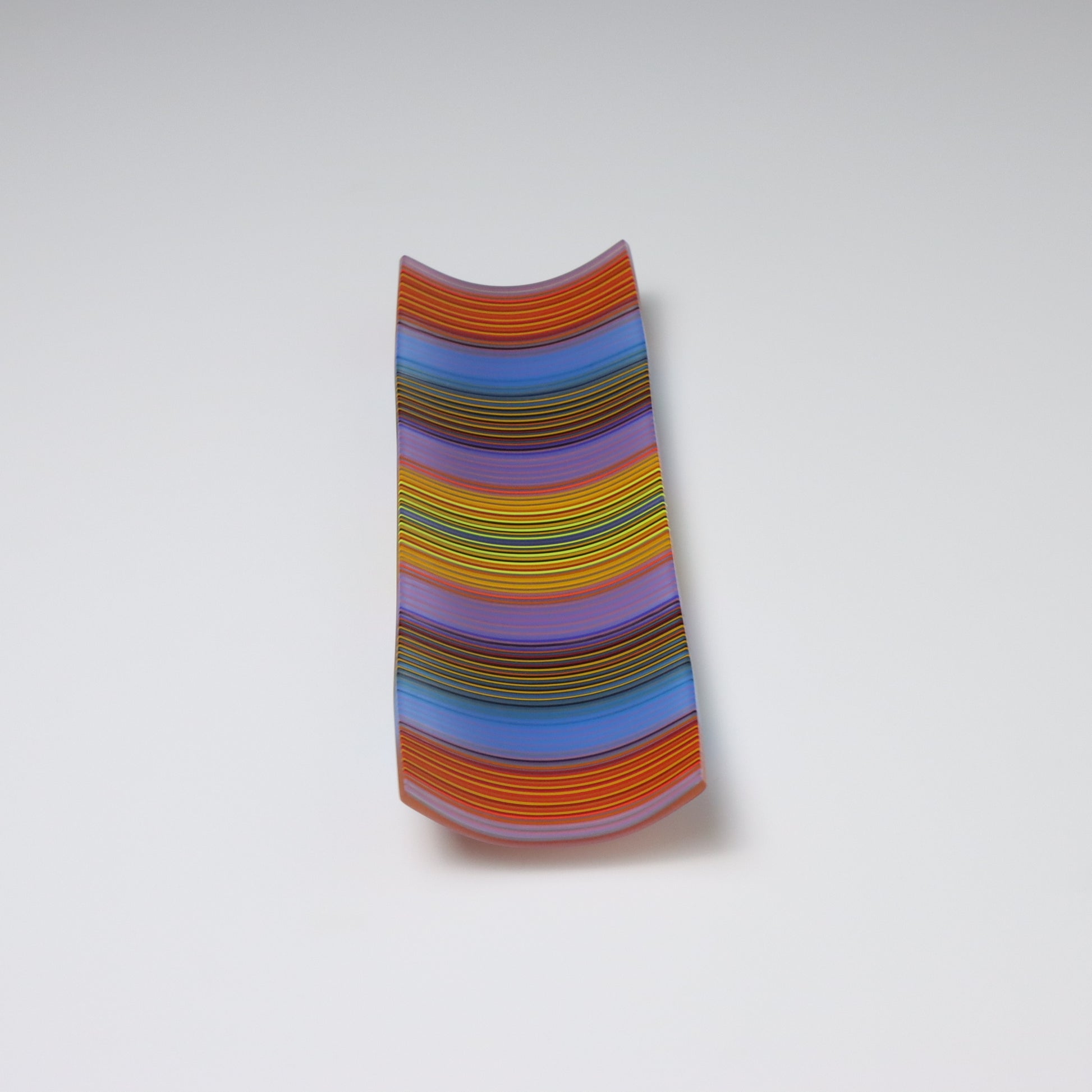 Rich blues, deep purples, and fiery oranges lead the eye toward a glowing yellow centre - a sequence that feels alive with energy. Up close, the fine strands of glass reveal shifting colour and rhythm, drawing you in with every glance. The rectangular form and smooth curved edges give it a contemporary balance, letting the colour speak for itself.